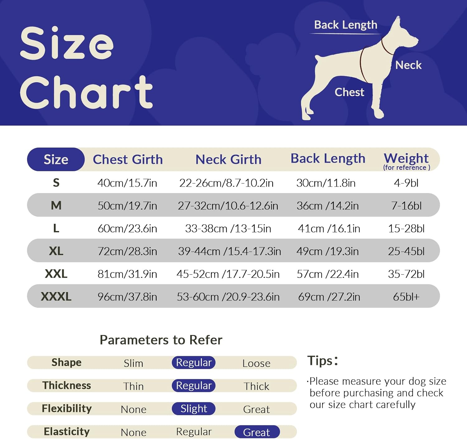 • Размери: Предлага се в шест размера от S до 3XL, подходящи за малки, средни и големи кучета. За оптимално прилягане, моля, измерете дължината на гърдите, врата и гърба на вашето куче, преди да поръчате. Ако бодито е твърде дълго след операцията, можете просто да навиете крачолите и да регулирате дължината, за да пасне на краката на вашето куче. Може да се пере в пералня.