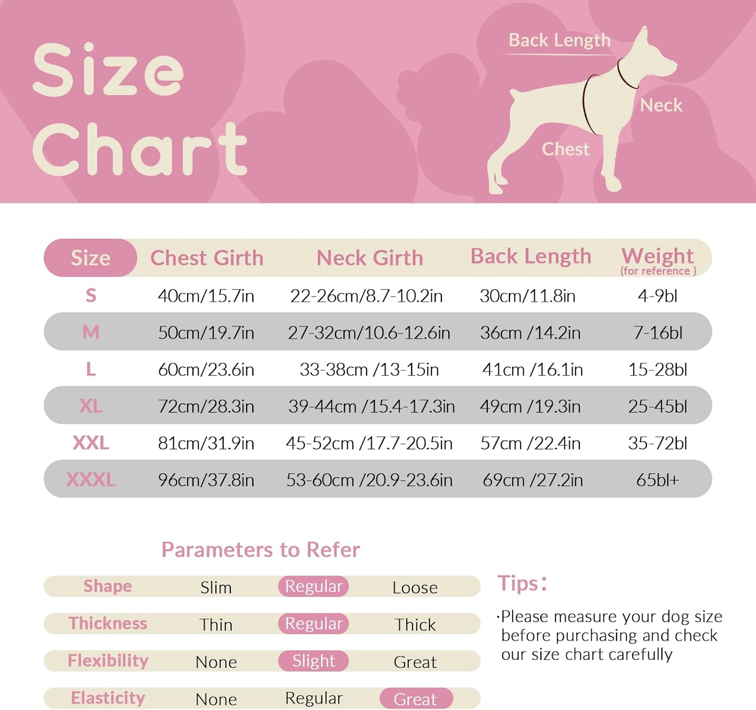 • Размери: Предлага се в шест размера от S до 3XL, подходящи за малки, средни и големи кучета. За оптимално прилягане, моля, измерете дължината на гърдите, врата и гърба на вашето куче, преди да поръчате. Ако бодито е твърде дълго след операцията, можете просто да навиете крачолите и да регулирате дължината, за да пасне на краката на вашето куче. Може да се пере в пералня.