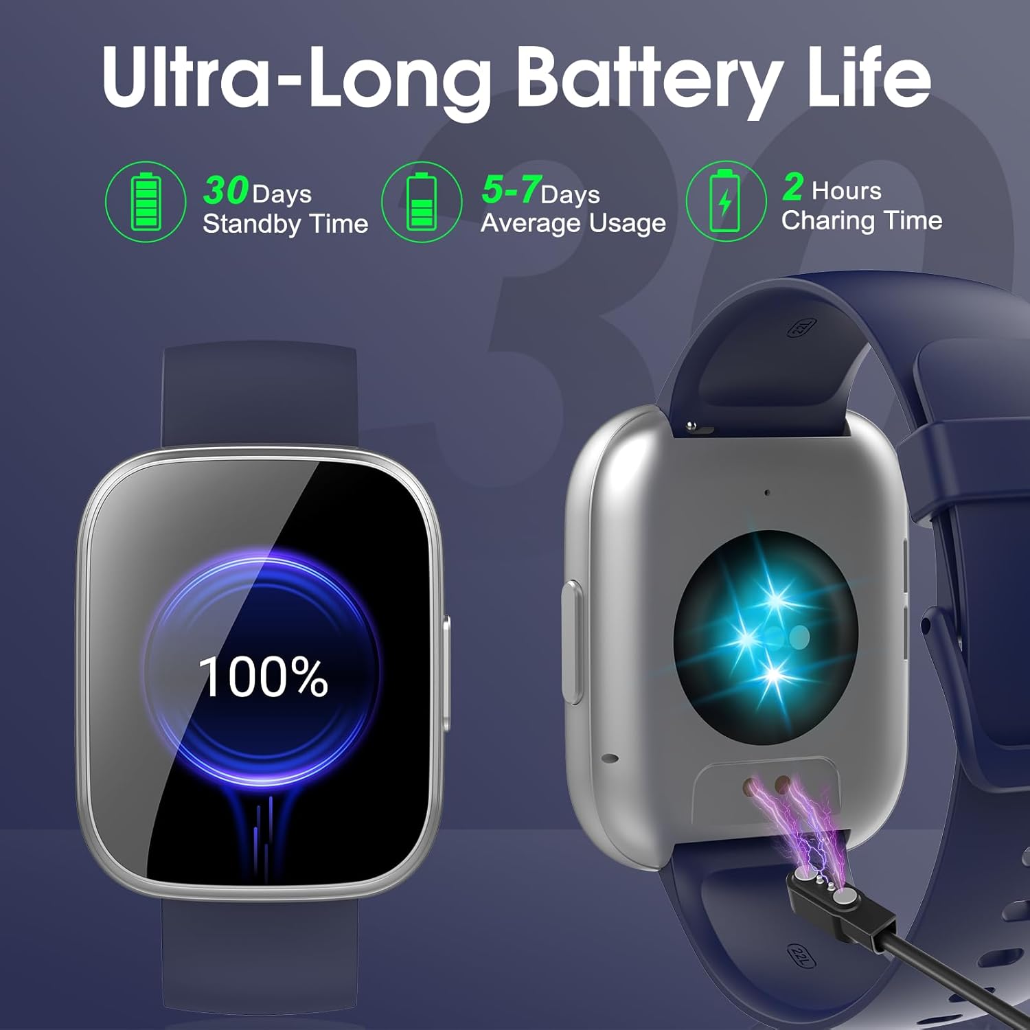 • 100+ спортни режима и водоустойчивост IP68: фитнес часовникът предлага над 100 спортни режима, поддържа бягане, колоездене, скачане, йога, футбол, баскетбол, туризъм и други дейности. Точно записва стъпки, пулс, разстояние. Водоустойчив е IP68 за потни, дъждовни или миене на ръце. Не е подходящ за плуване или среда с водна пара. Има много повече функции: показване на времето, управление на камерата, управление на музиката, търсене на телефон, хронометър и др.