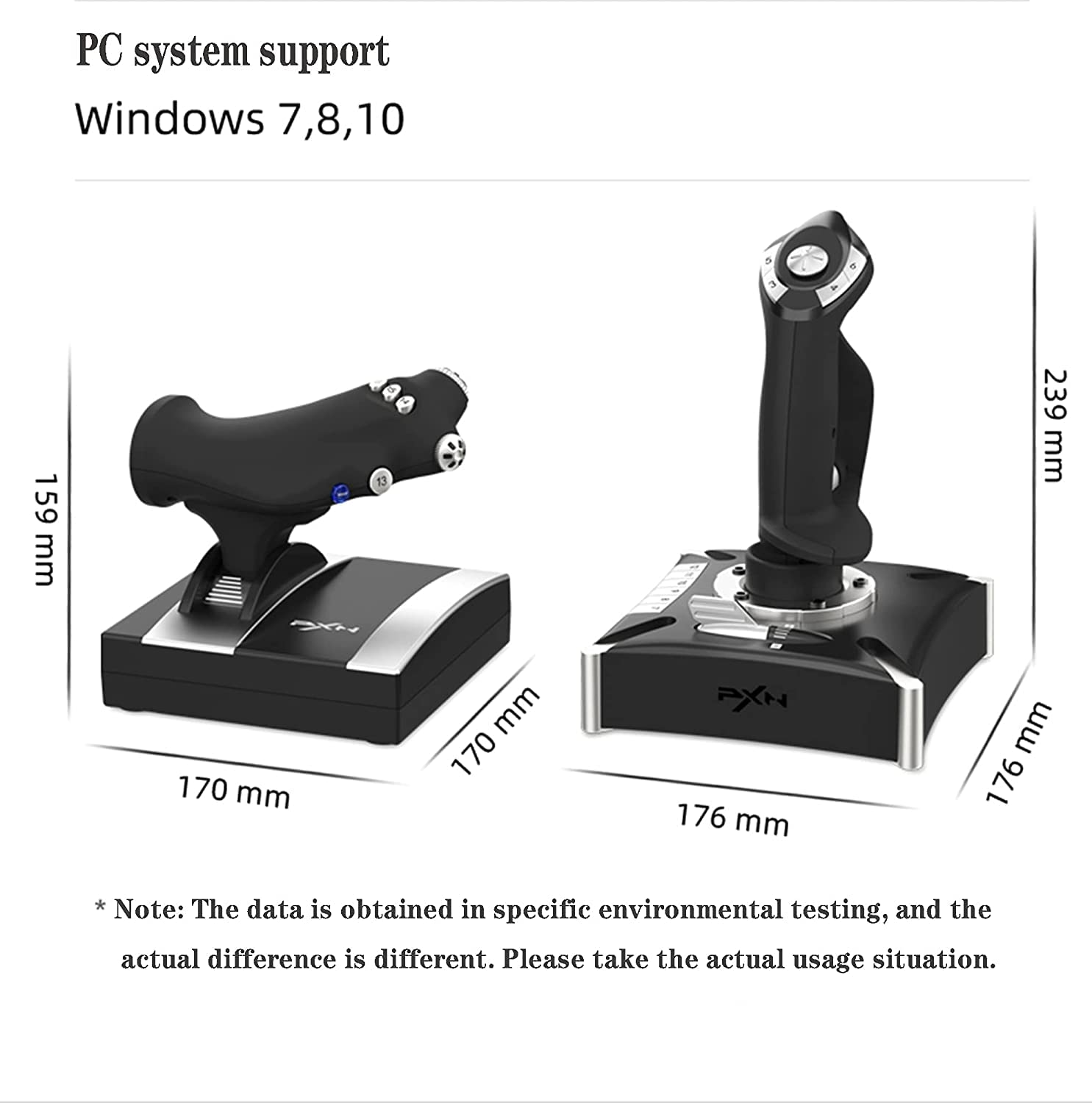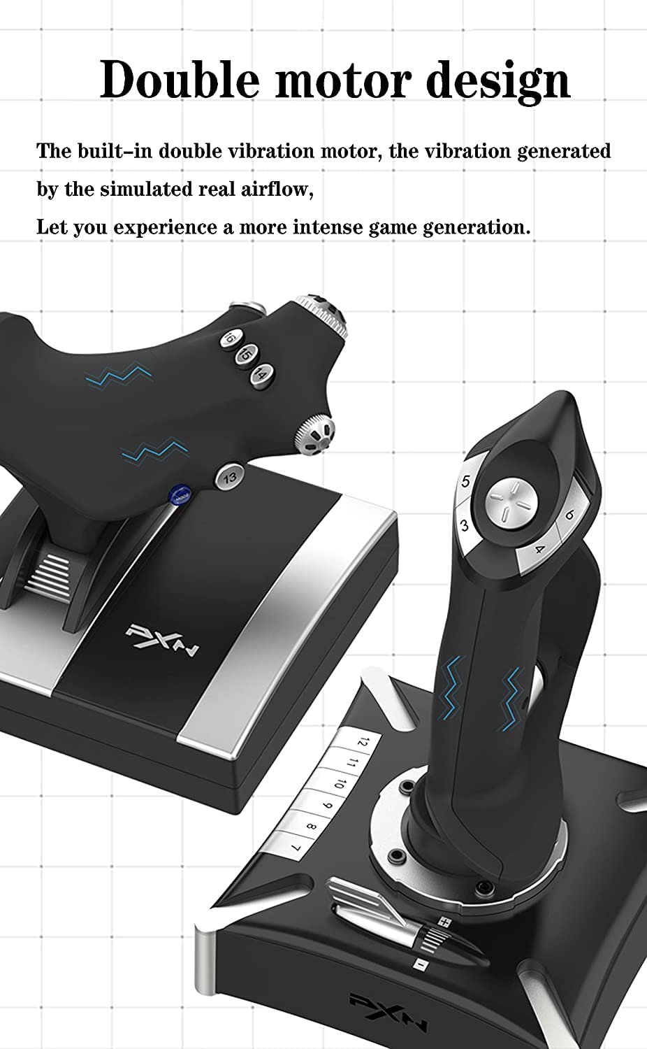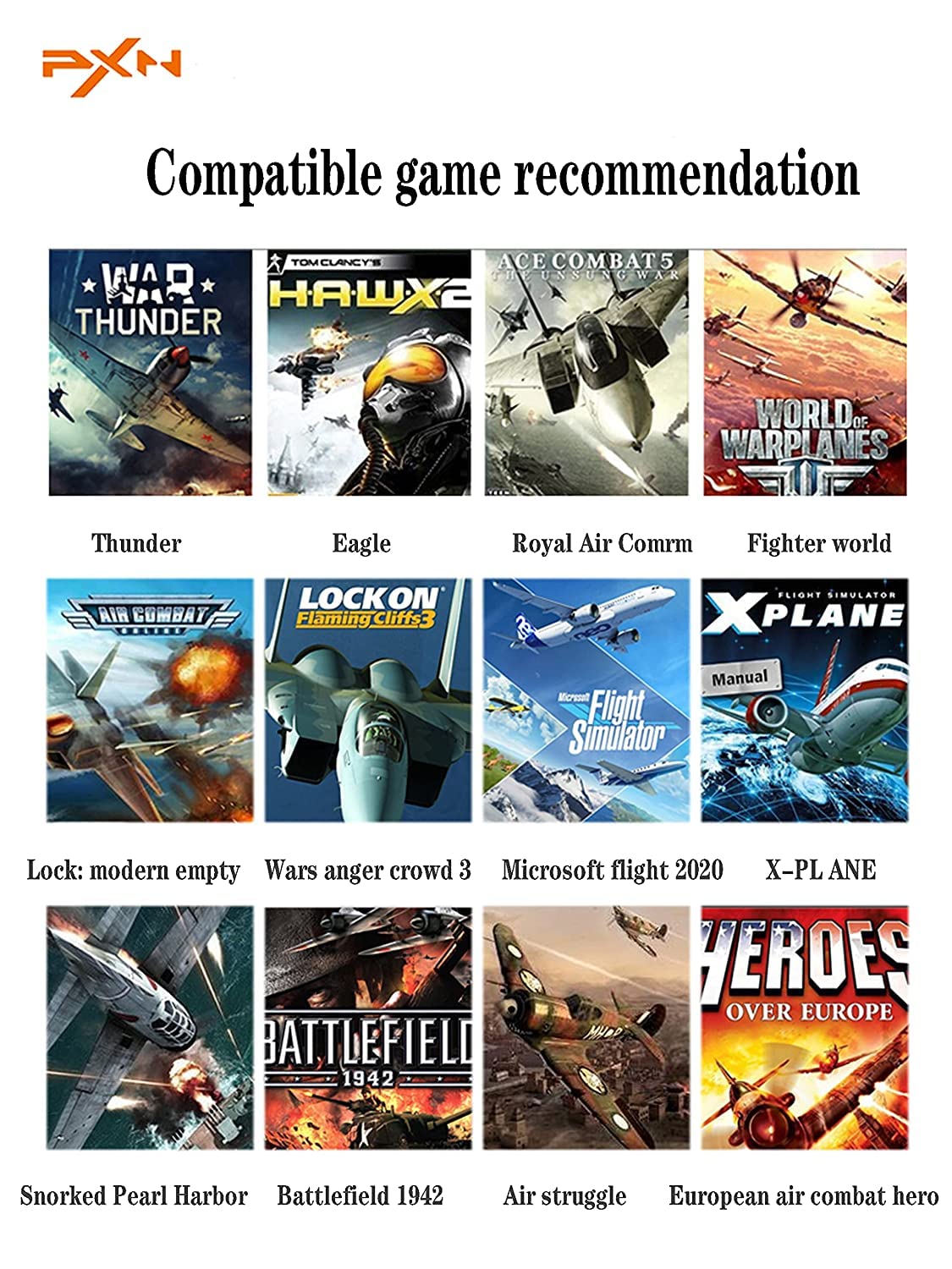 • Характеристики на продукта: PXN-2119 PRO се състои от „кобилица“ и „дроселова клапа“, със 7 оси, два твърди клавиша с 8 посоки и 16 независими контрола за движение, които могат да се захранват от 16 x 3 функционални клавиша. Разширението предлага истинско интерактивно изживяване, съвместимо с почти летящи игри: World of Tanks, War Thunder, Assault Skyline, Microsoft Flight Simulator 2020, X Plane 10 и др. (Забележка: , Asphalt 8)