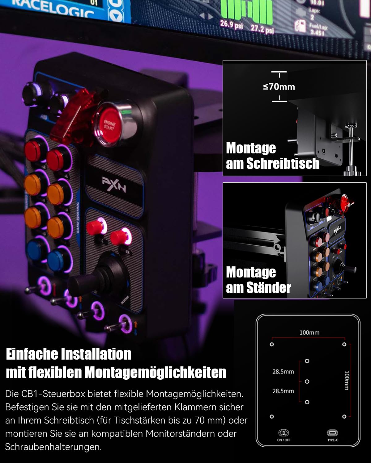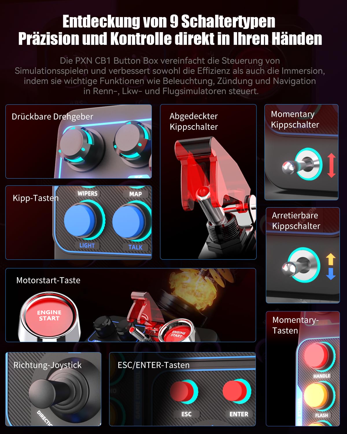 PXN CB1 Button Box е напълно персонализируем спомагателен контролер за PC, предназначен за ентусиасти на симулационни игри. С 19 бутона, превключватели и копчета в 9 варианта, както и до 30 програмируеми входа, кутията предлага безпроблемно управление. С RGB осветление, гъвкави опции за монтаж и широка съвместимост, CB1 подобрява вашето игрово изживяване, като осигурява интуитивно и отзивчиво управление, без да е необходима клавиатура или навигация в менюто.