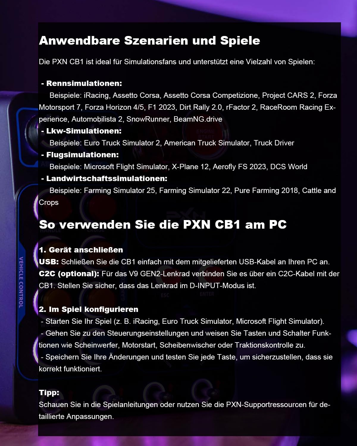 V9 GEN2 steering wheel: When the CB1 is connected to the PXN V9 GEN2 steering wheel via a C2C cable, additional functions can be adjusted and settings can be made via the PXN Wheel app. (Note: The CB1 only works in D-INPUT mode on PC in this configuration.)