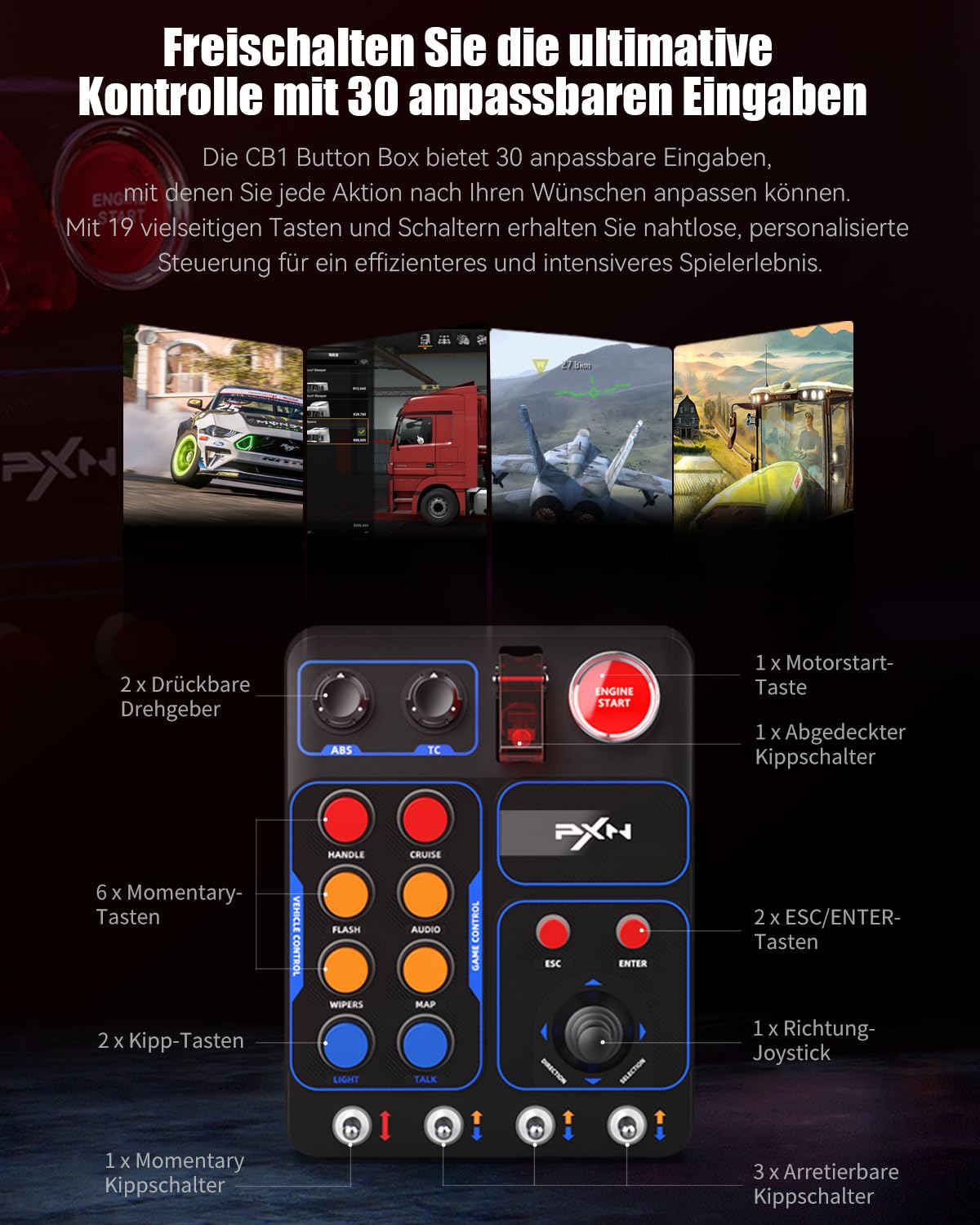 The CB1 includes 19 buttons, switches and knobs in 9 variants, with up to 30 programmable inputs. These buttons and switches can be customized for various functions in simulation games, such as engine control, lighting and other vehicle or machine controls.