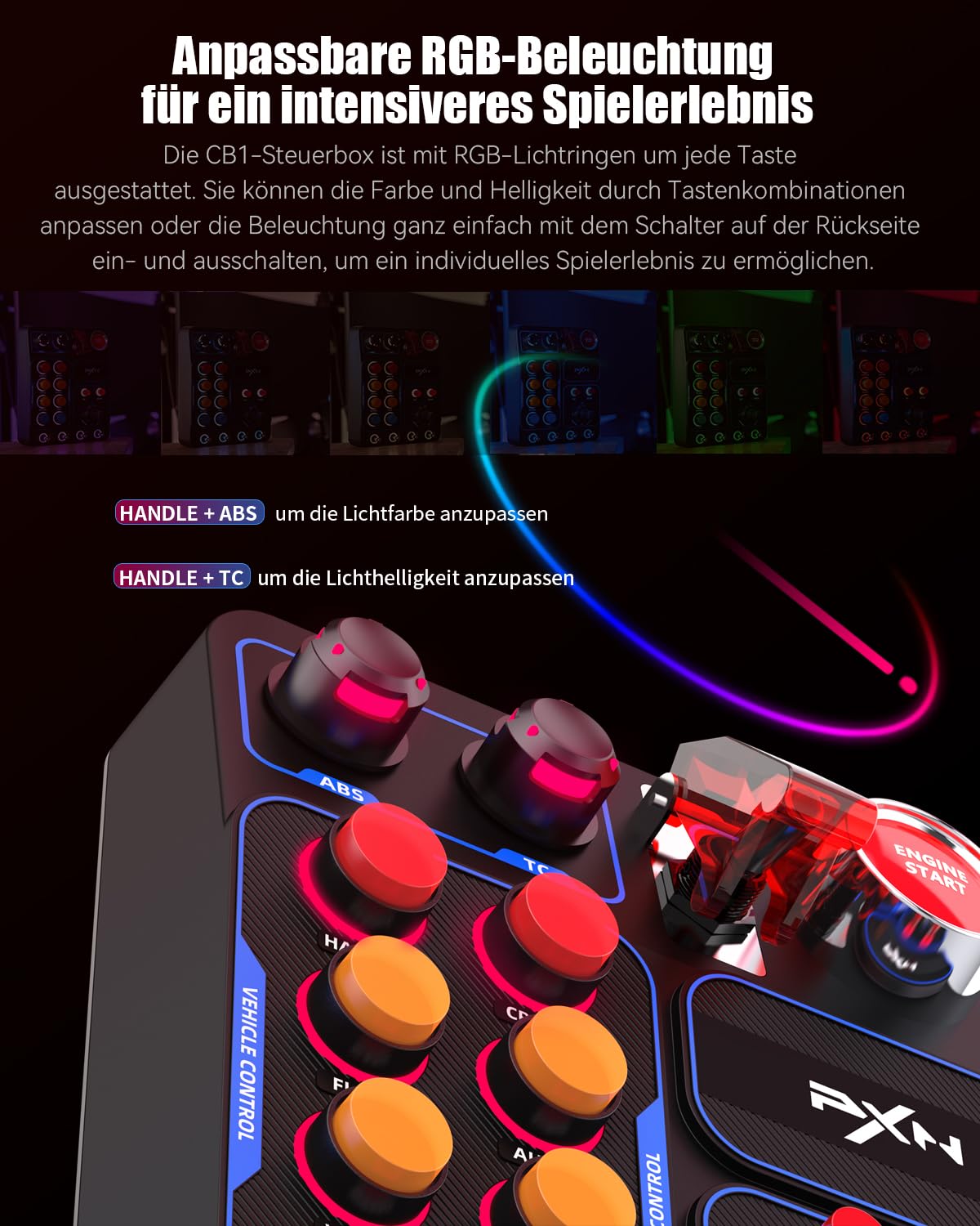 Most buttons of the PXN CB1 Button Box are equipped with RGB lighting rings, which can be adjusted for colour and brightness with the key combination "HANDLE" + "ABS"/"TC". A switch on the back allows you to quickly turn the lights on and off. These customizable lighting effects are easy to adjust to personalise and visually highlight your setup.