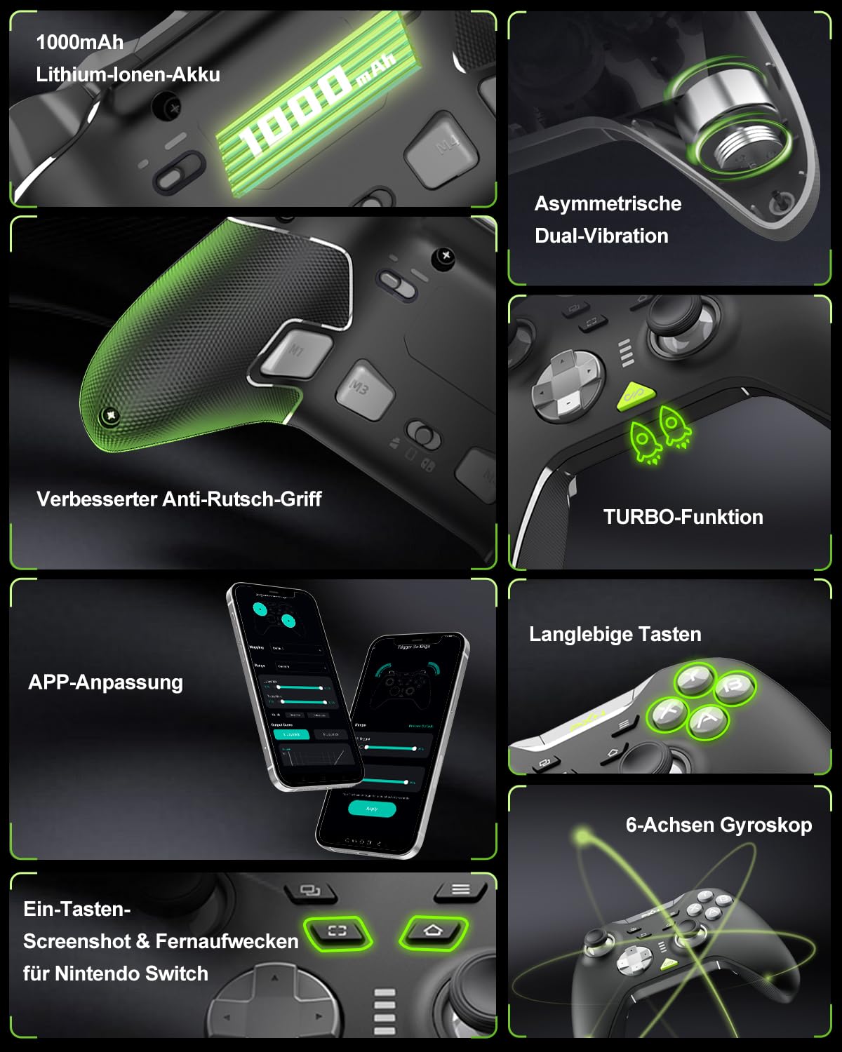 • Други характеристики: Акумулаторна литиево-полимерна батерия 1000 mAh. Поддръжка на приложения: позволява ви да регулирате макро настройки, назначения на бутоните, интензивност на вибрациите, настройки на джойстика и други. ● 6-осен жироскоп ● POM пръстени: Подобряват издръжливостта на джойстика и осигуряват още по-плавна работа. ● Асиметрична вибрационна обратна връзка с двойни мотори. ● Събуждане с един бутон за превключващи конзоли.