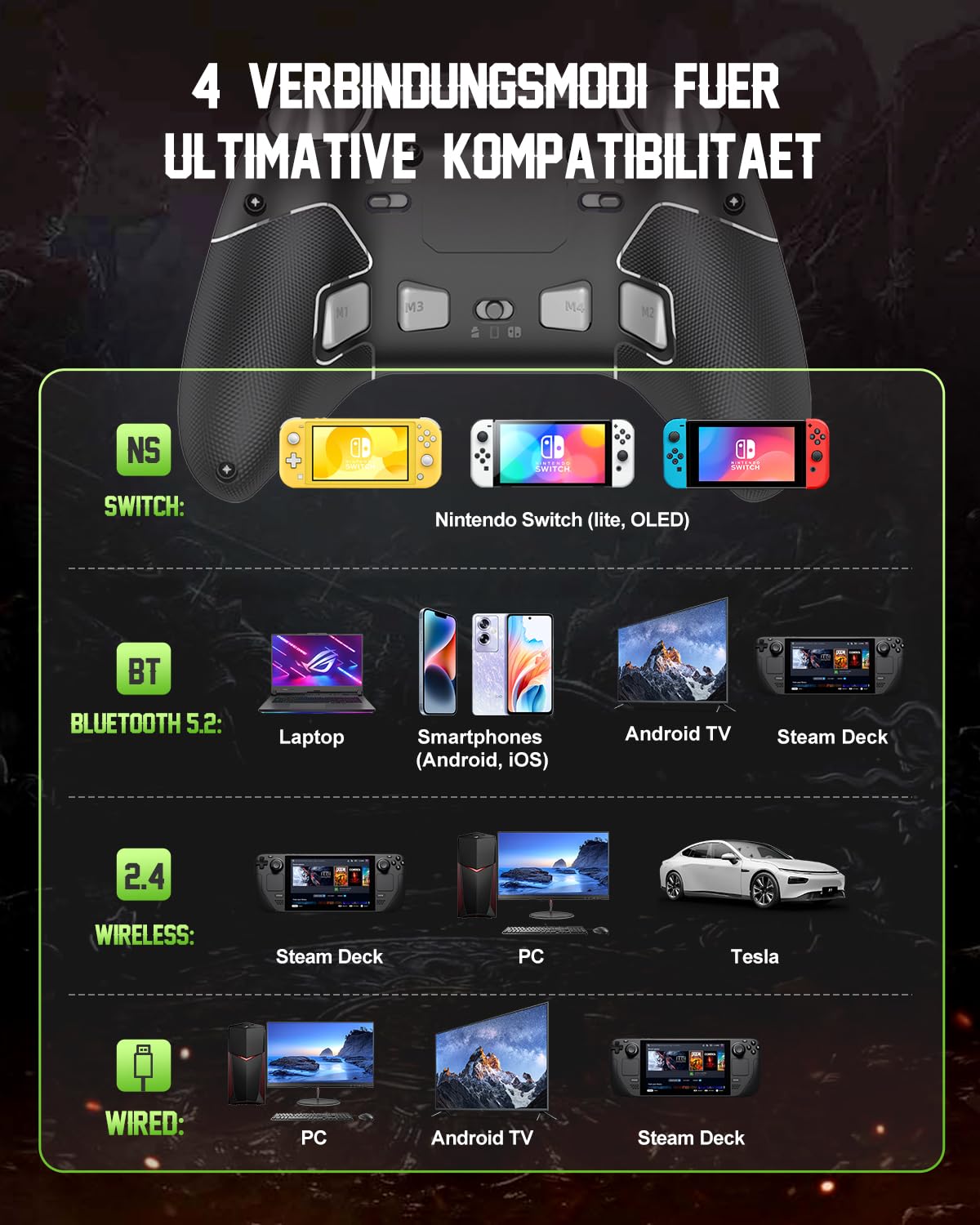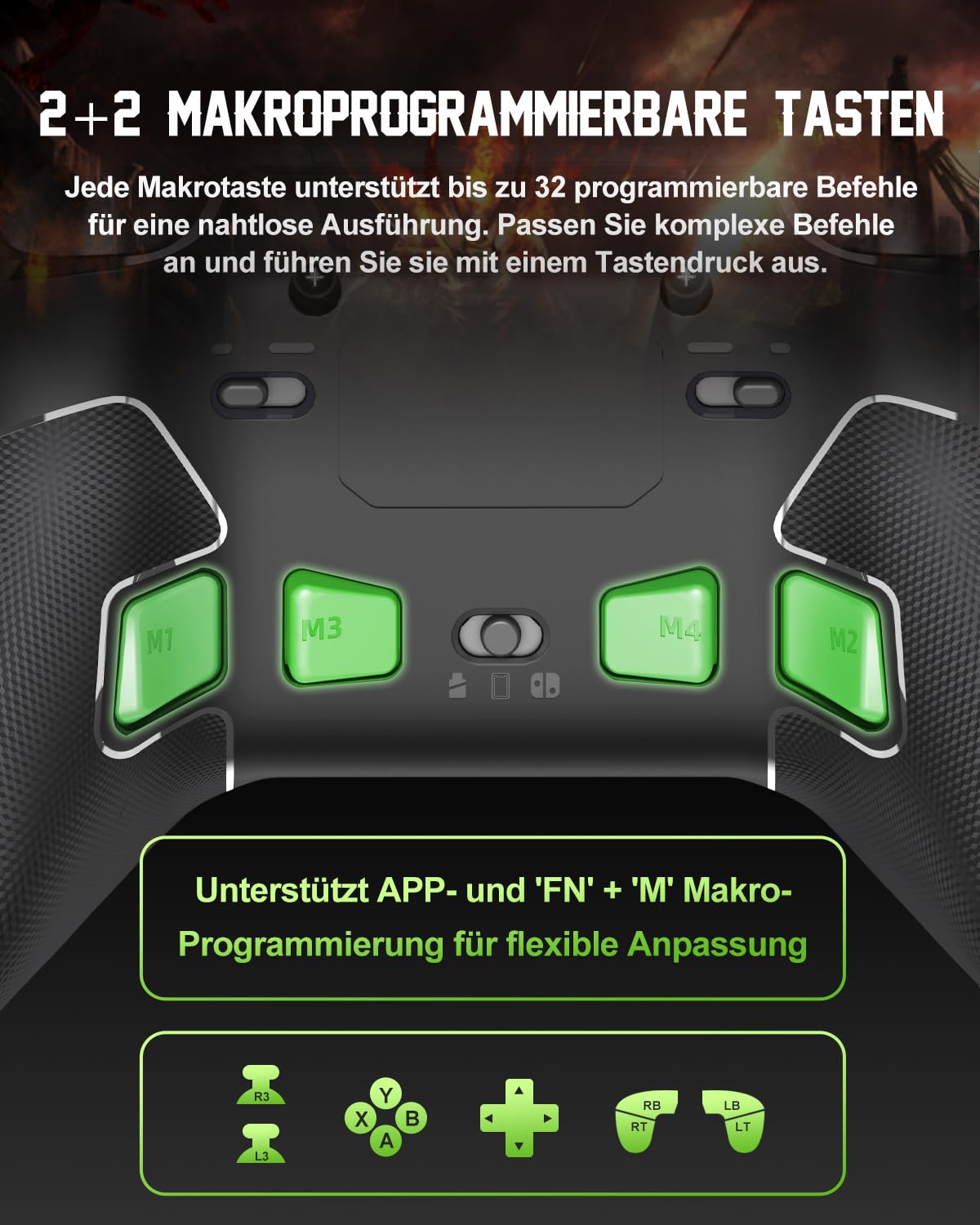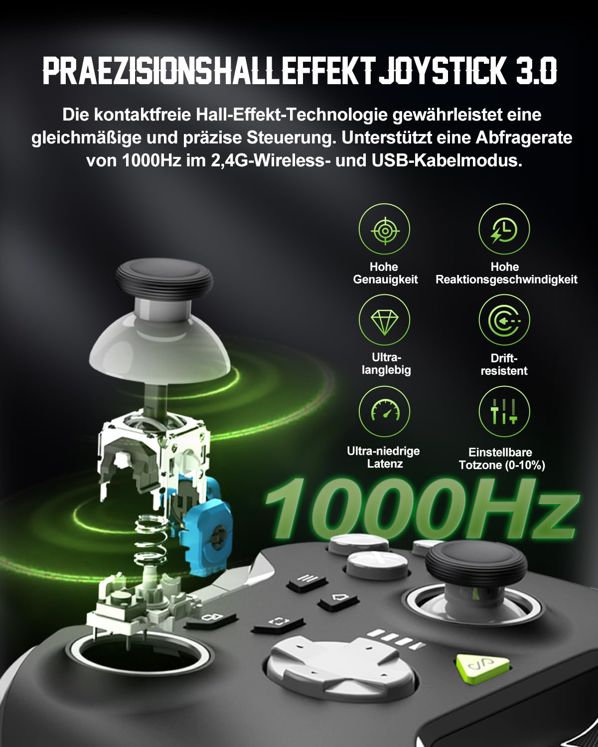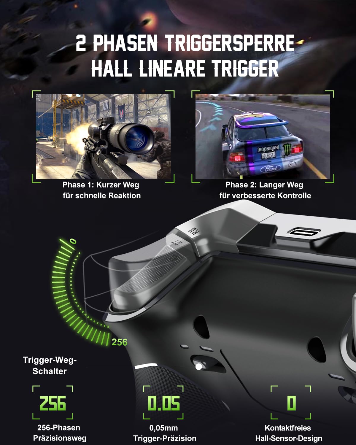 • Геймърски контролер за подобрения от 2025 г.: с джойстик, 4 макро бутона, 3 режима на свързване (2.4G/Bluetooth 5.2/Switch), 2-степенно заключване на спусъка, FN бутон, POM пръстени, вибрационна обратна връзка, батерия 1000 mAh, инструмент за настройка на приложението и 6-осен жироскоп. Съвместим с PC, Switch, Android и iOS.