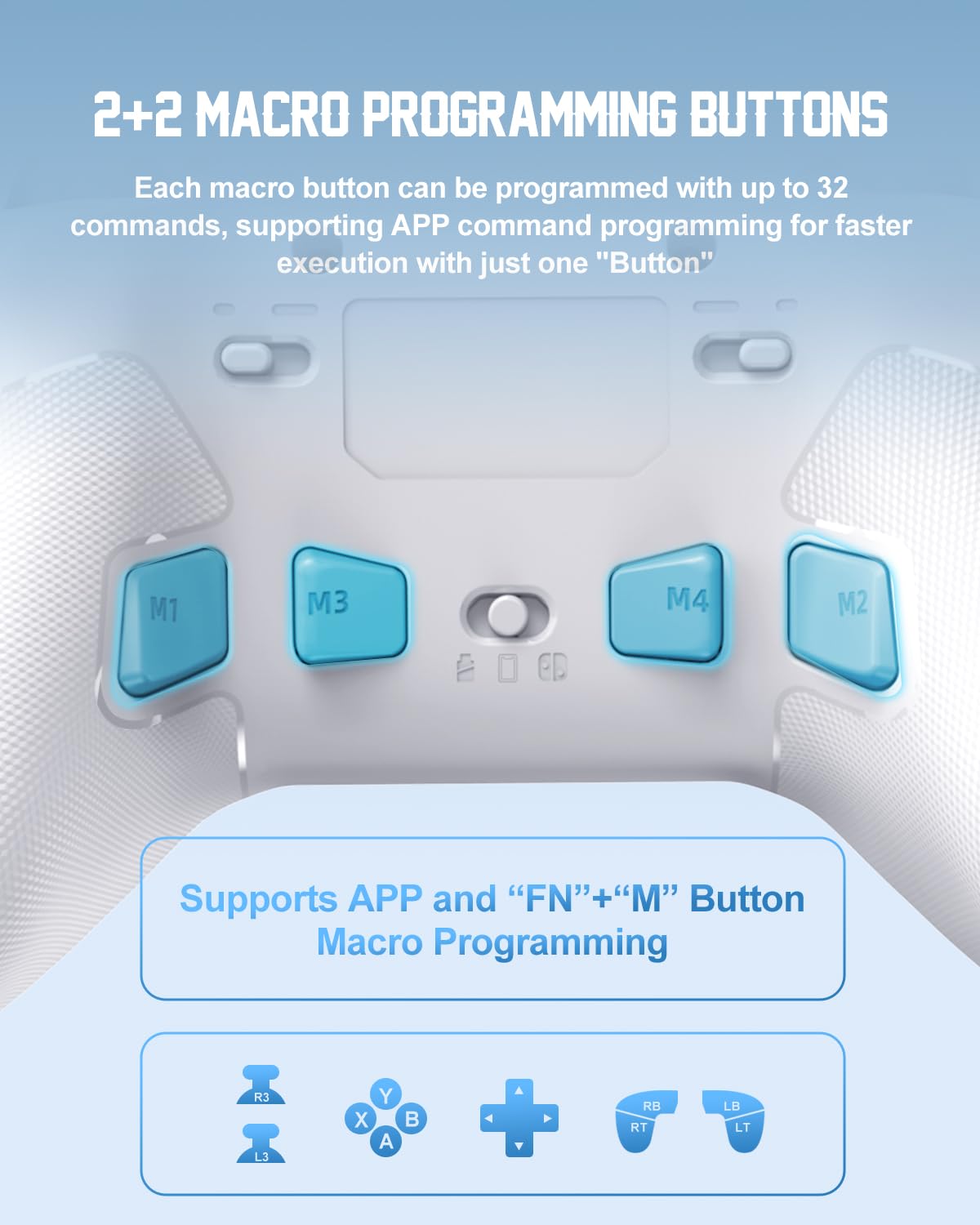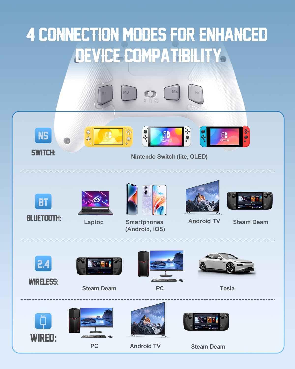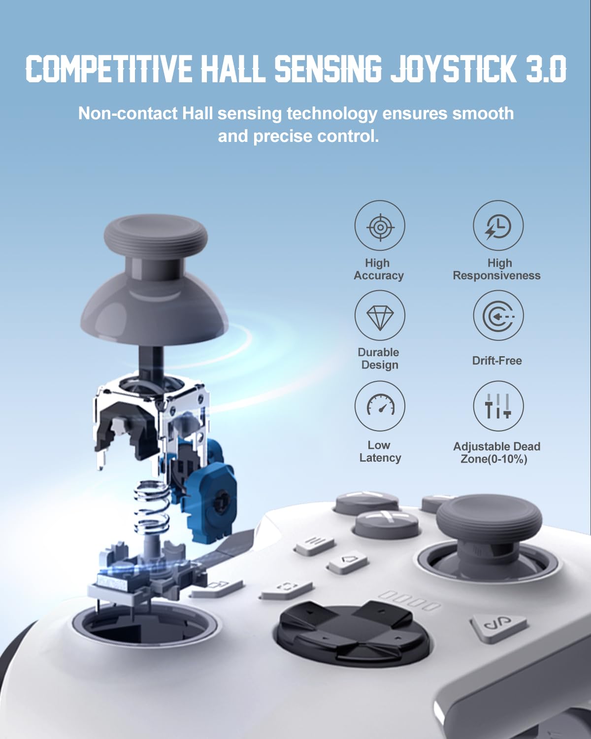 • Геймърски контролер за подобрения от 2025 г.: с джойстик, 4 макро бутона, 3 режима на свързване (2.4G/Bluetooth 5.2/Switch), 2-степенно заключване на спусъка, FN бутон, POM пръстени, вибрационна обратна връзка, батерия 1000 mAh, инструмент за настройка на приложението и 6-осен жироскоп. Съвместим с PC, Switch, Android и iOS.