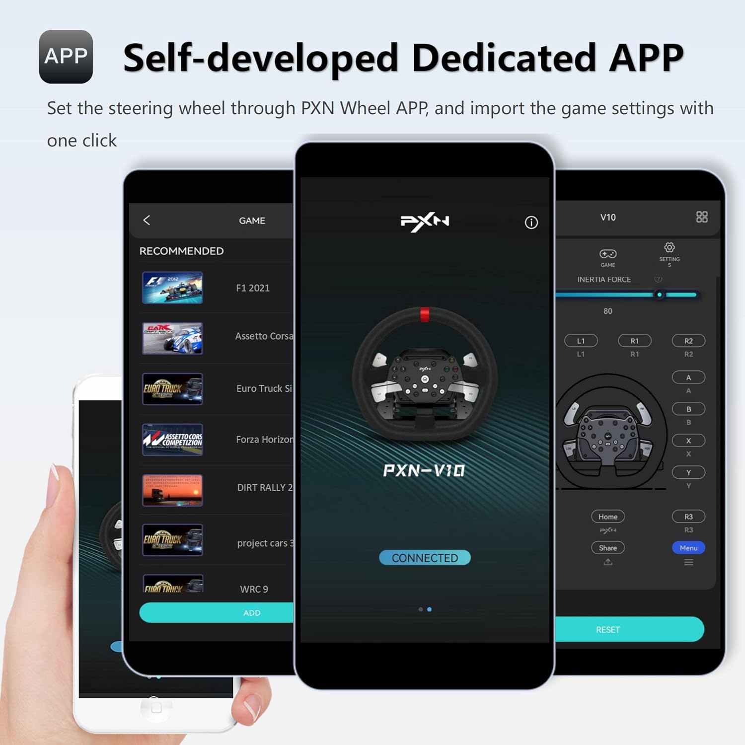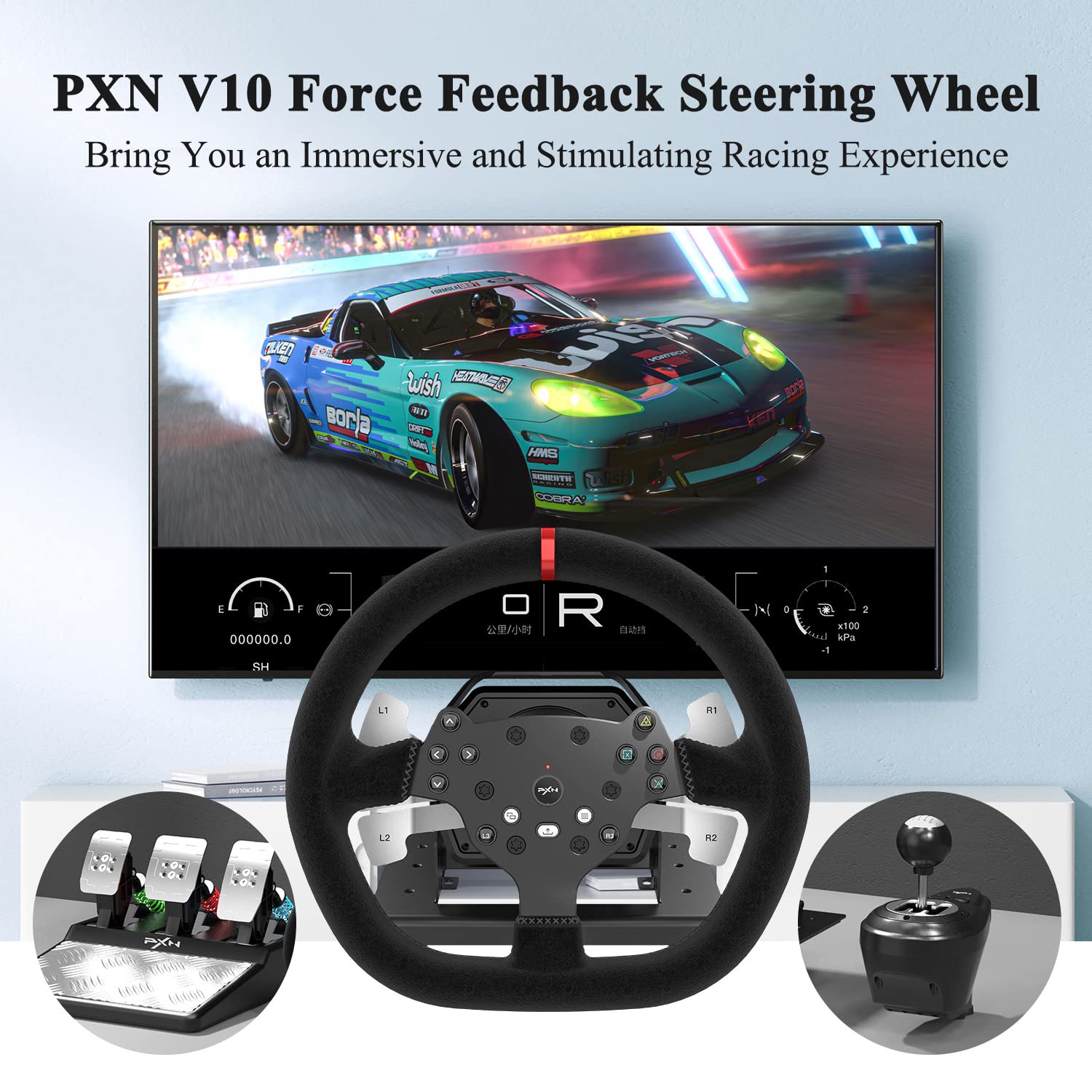 • 270/900° PC волан: можете да завъртите състезателния велосипед PXN V10 със силова обратна връзка на два кръга и половина, симулирайки шофиране на истинска кола, което ви позволява да се насладите на стимулиращи и завладяващи състезания. 270 градуса са подходящи за състезателни игри, 900 градуса са подходящи за симулаторни игри. Нещо повече, истинският състезателен велосипед със силова обратна връзка е оборудван със спираловидни зъби, които осигуряват плавно и тихо управление.