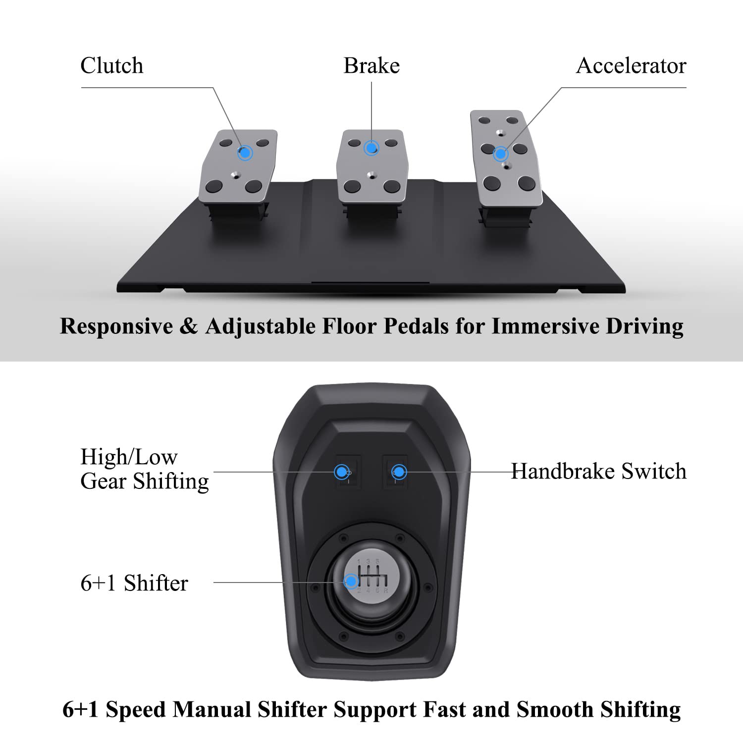 • Поглъщащо шофиране: PXN V9 геймърски волан за Xbox с педали и 6+1 предавки, като високата предавка може да достигне до 12, колко е вълнуващо! Скорости с "H" модел за бързо и плавно превключване. Чувствителни, регулируеми педали на пода с газ, чувствителна на натиск спирачка и функция на съединителя ви позволяват да ускорявате, спирате и превключвате с усещането, че управлявате истинска кола.