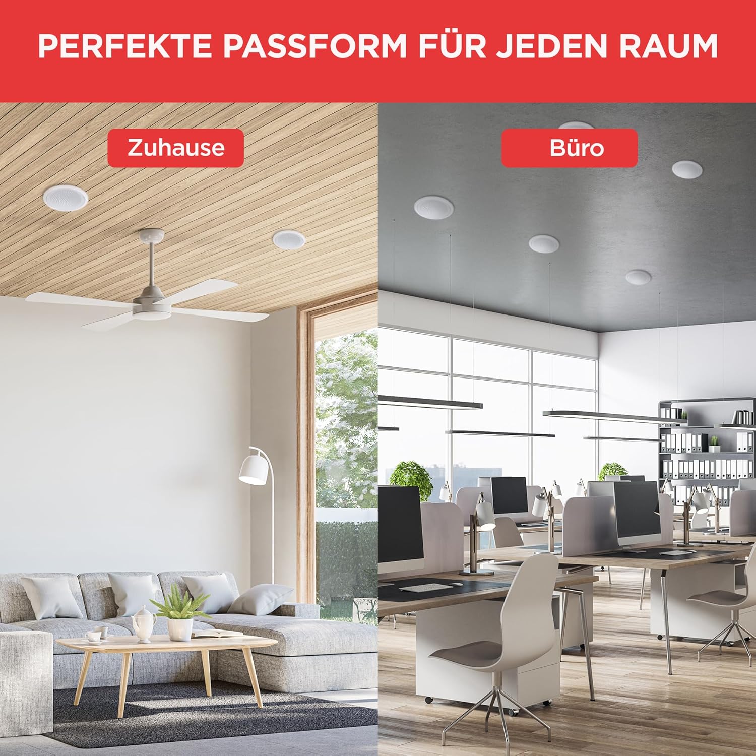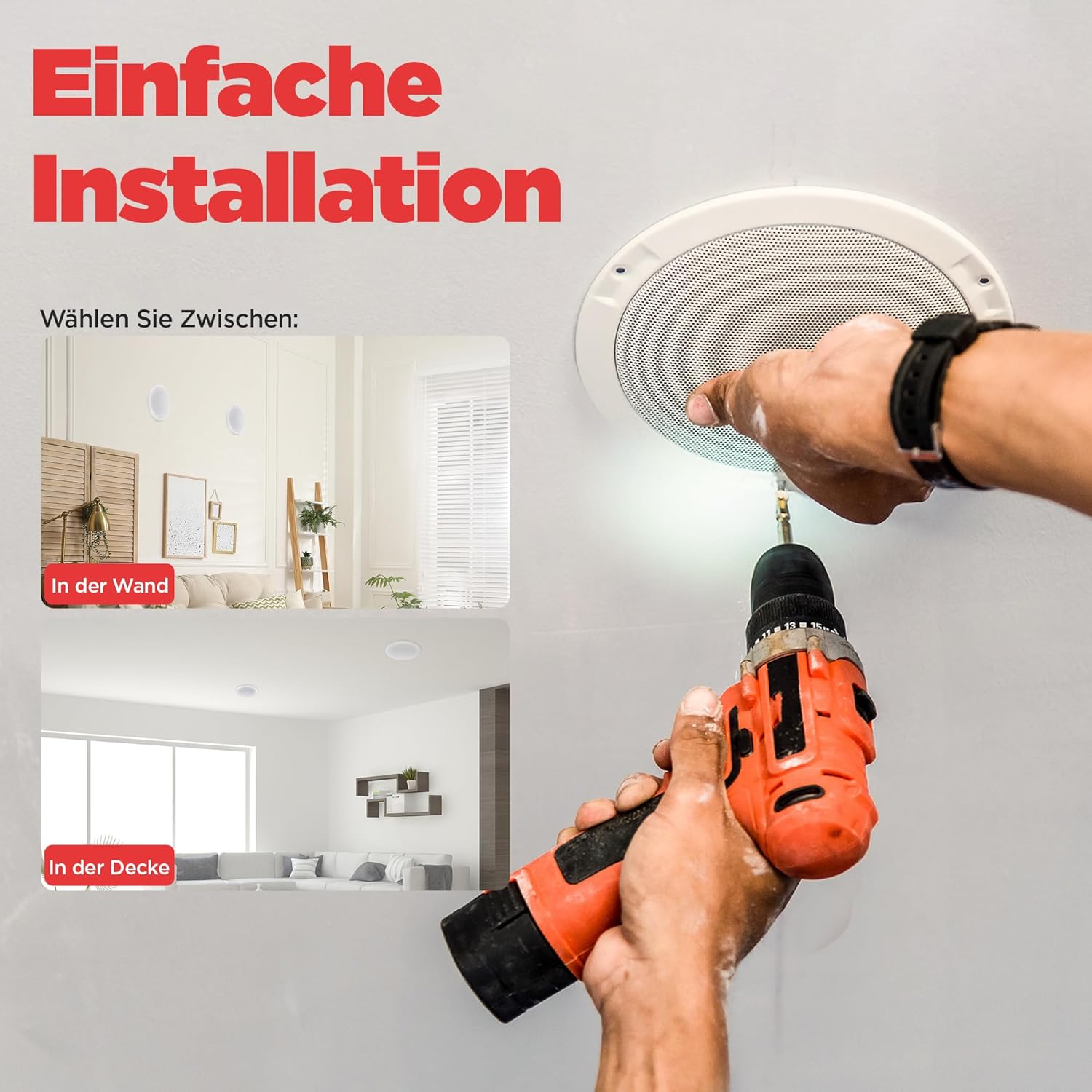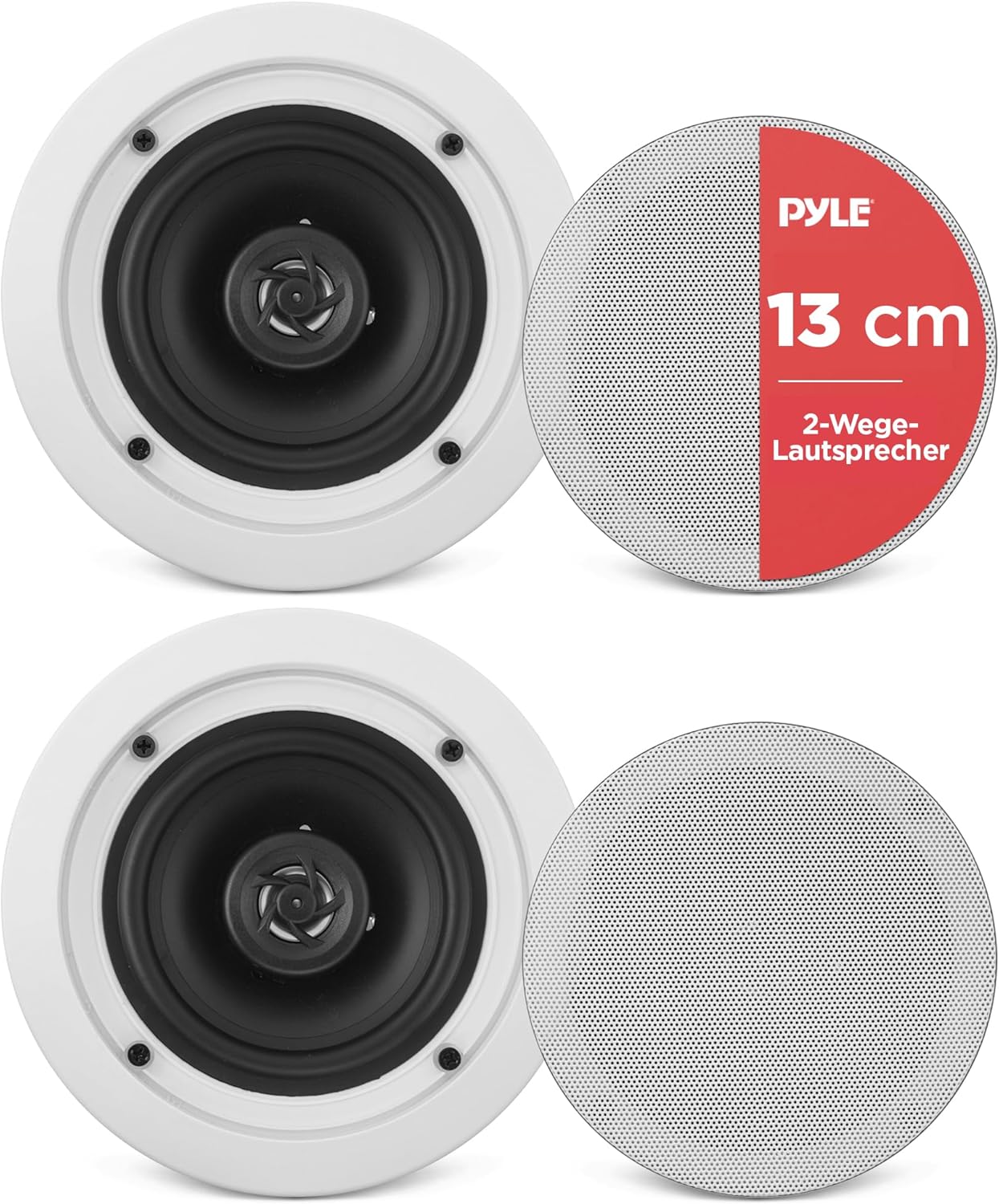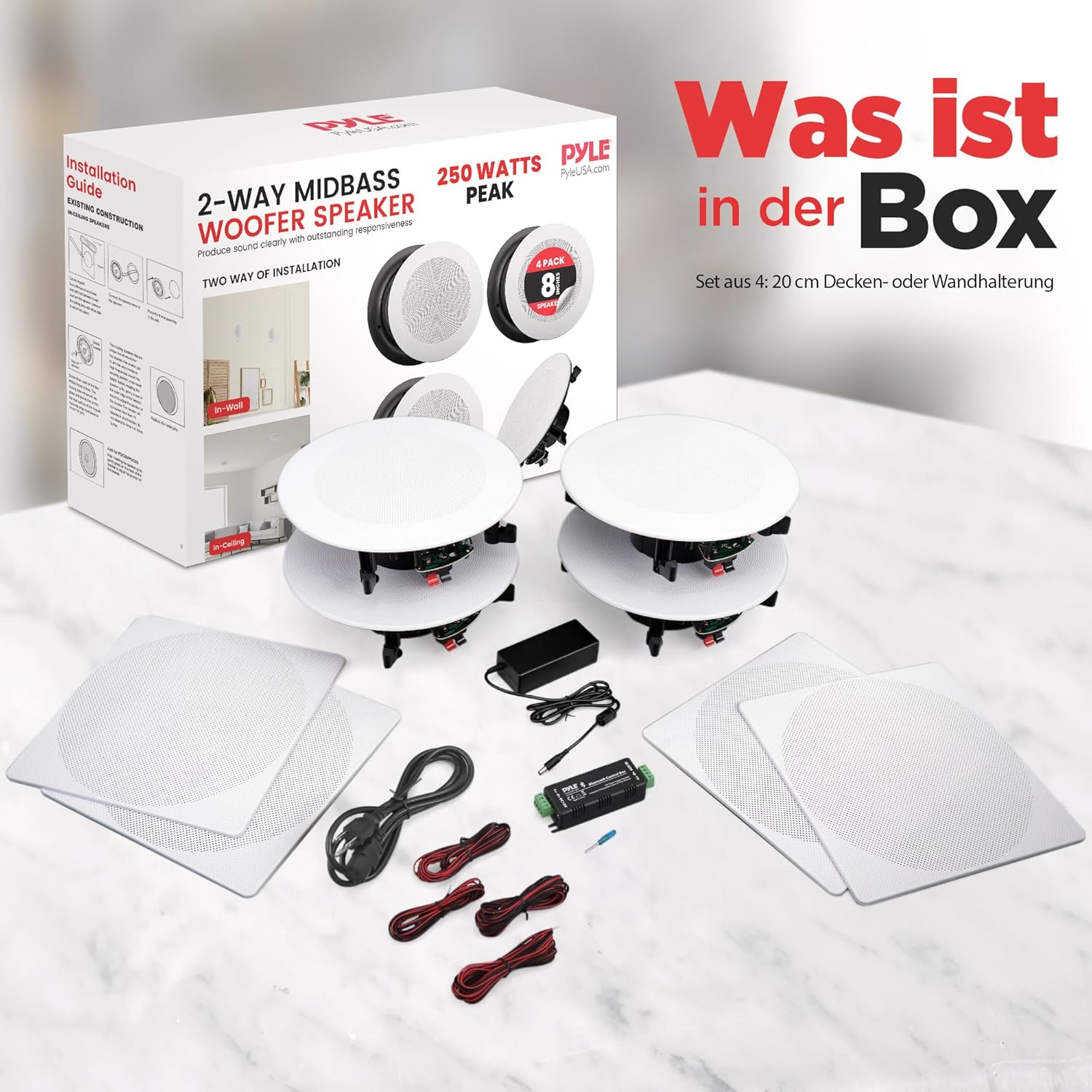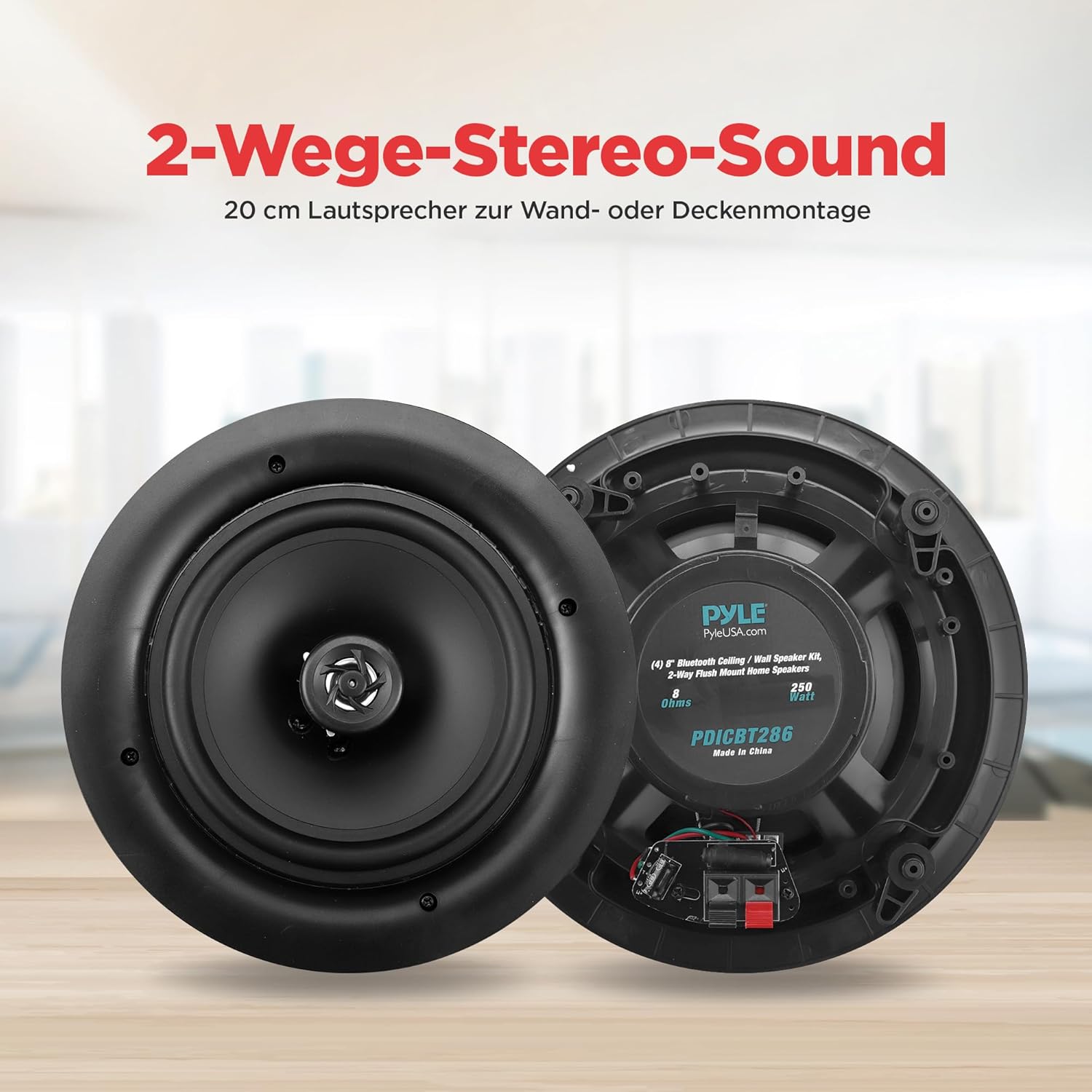 Pyle 20 см вграден високоговорител за таван, Bluetooth високоговорител за таван, 4 стенни високоговорителя, 2-лентов високоговорител, 250 W 4-канален усилвател, високочестотен говорител, стерео озвучителна система, стенен монтаж, кръгъл/квадратен