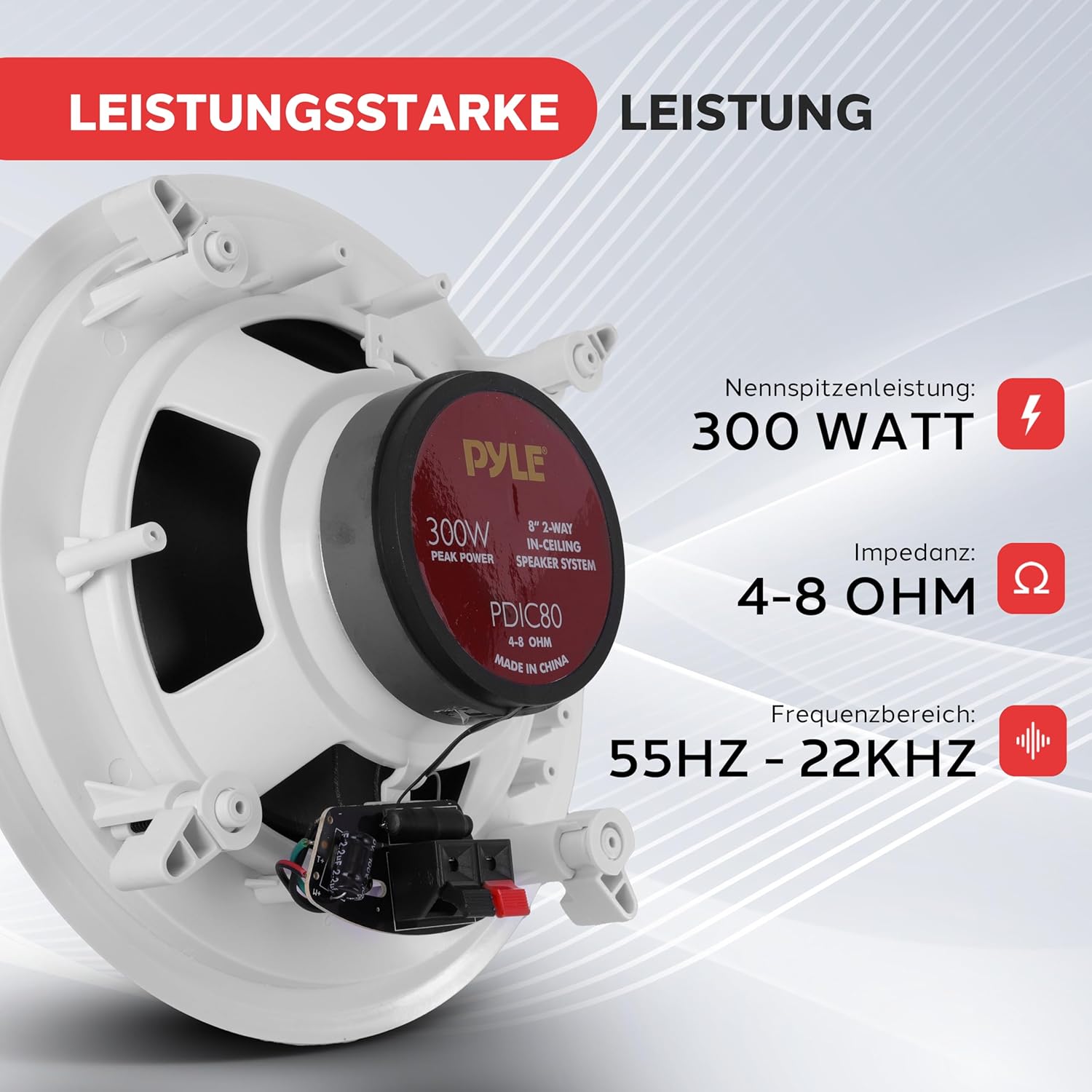 • Честотна характеристика 50Hz-20kHz: 8-инчовата високоговорителна система Pyle има директно реагираща 1-инчова високотемпературна звукова бобина и честотна характеристика. Този вграден високоговорител е оборудван с изключителен импеданс от 4 до 8 ома и впечатляваща товарна мощност от 250 вата.