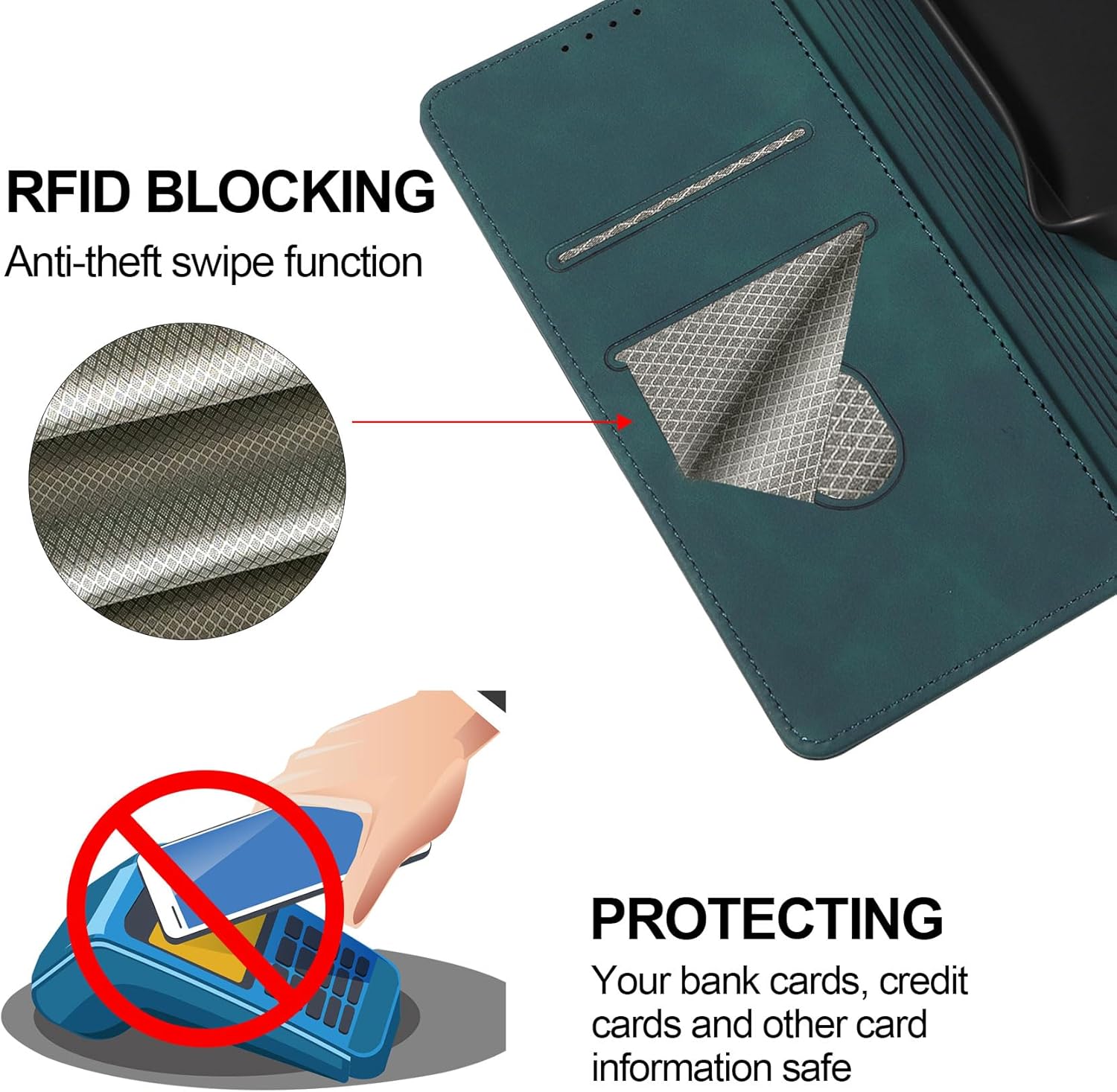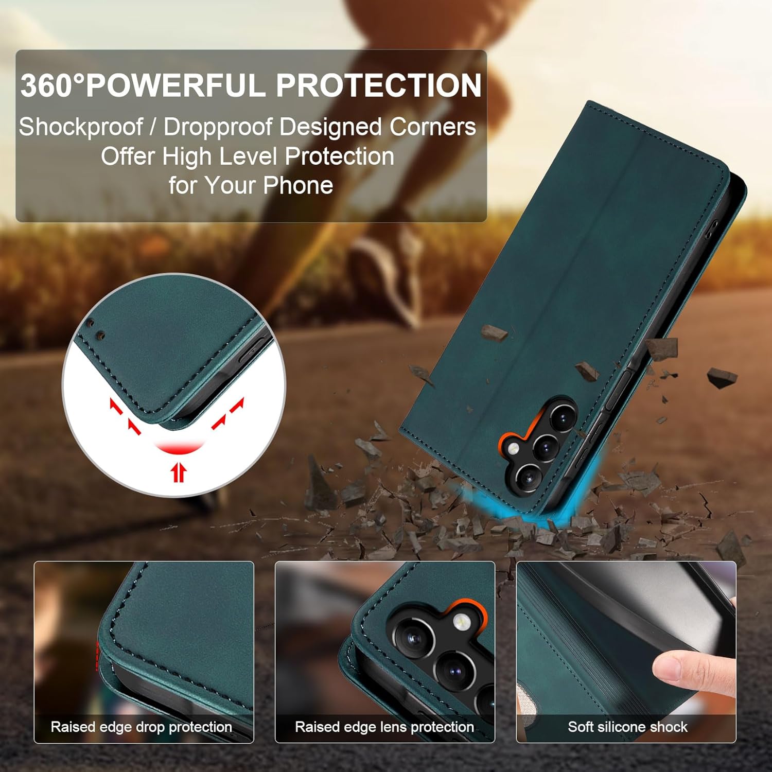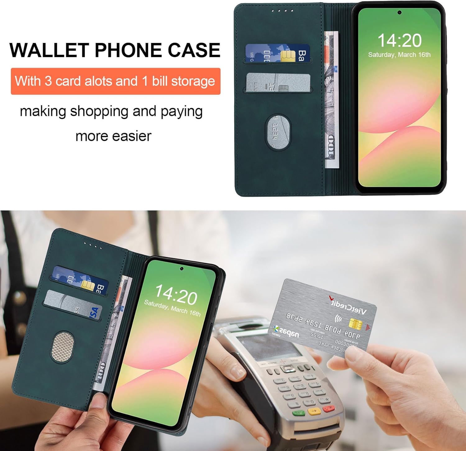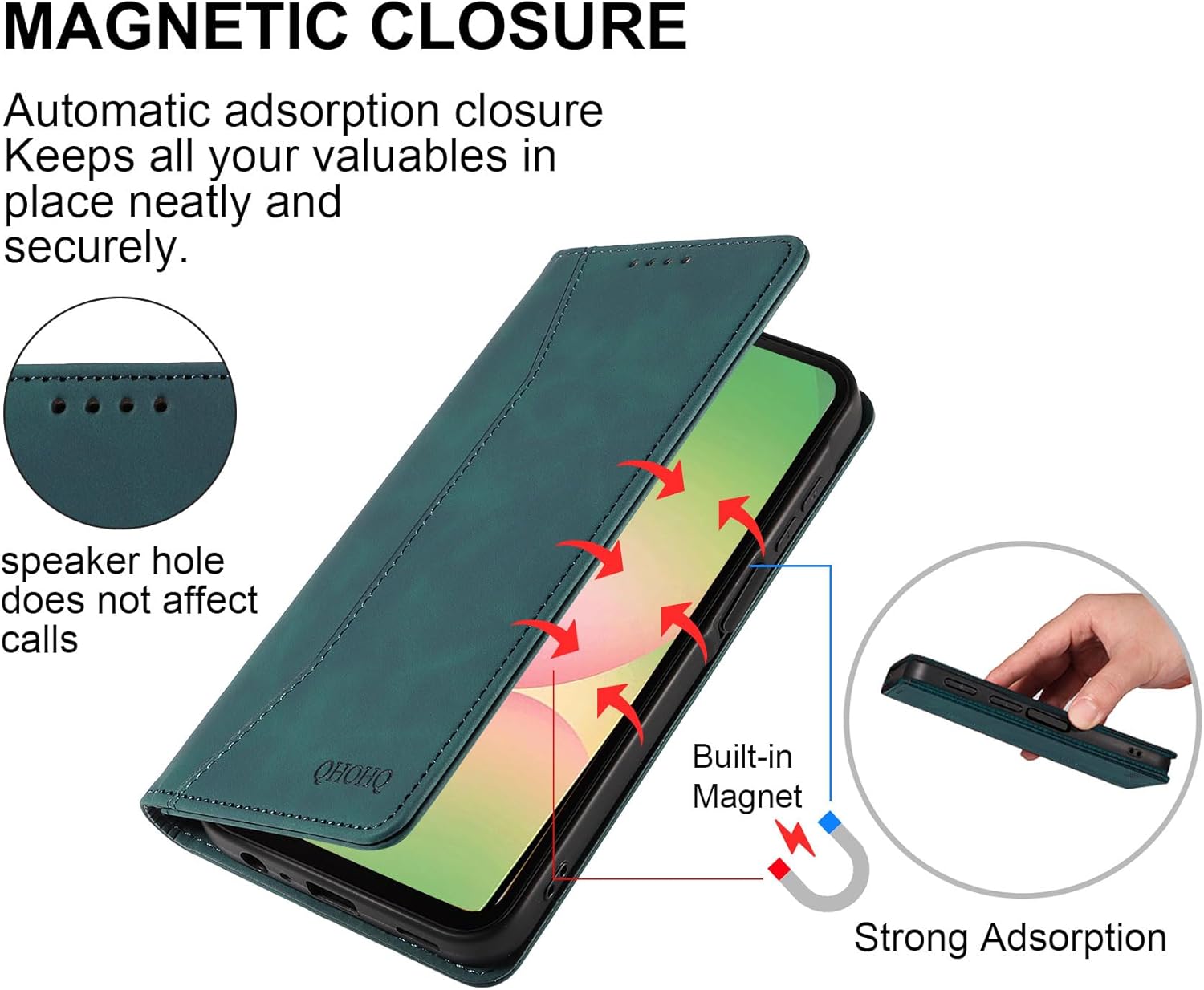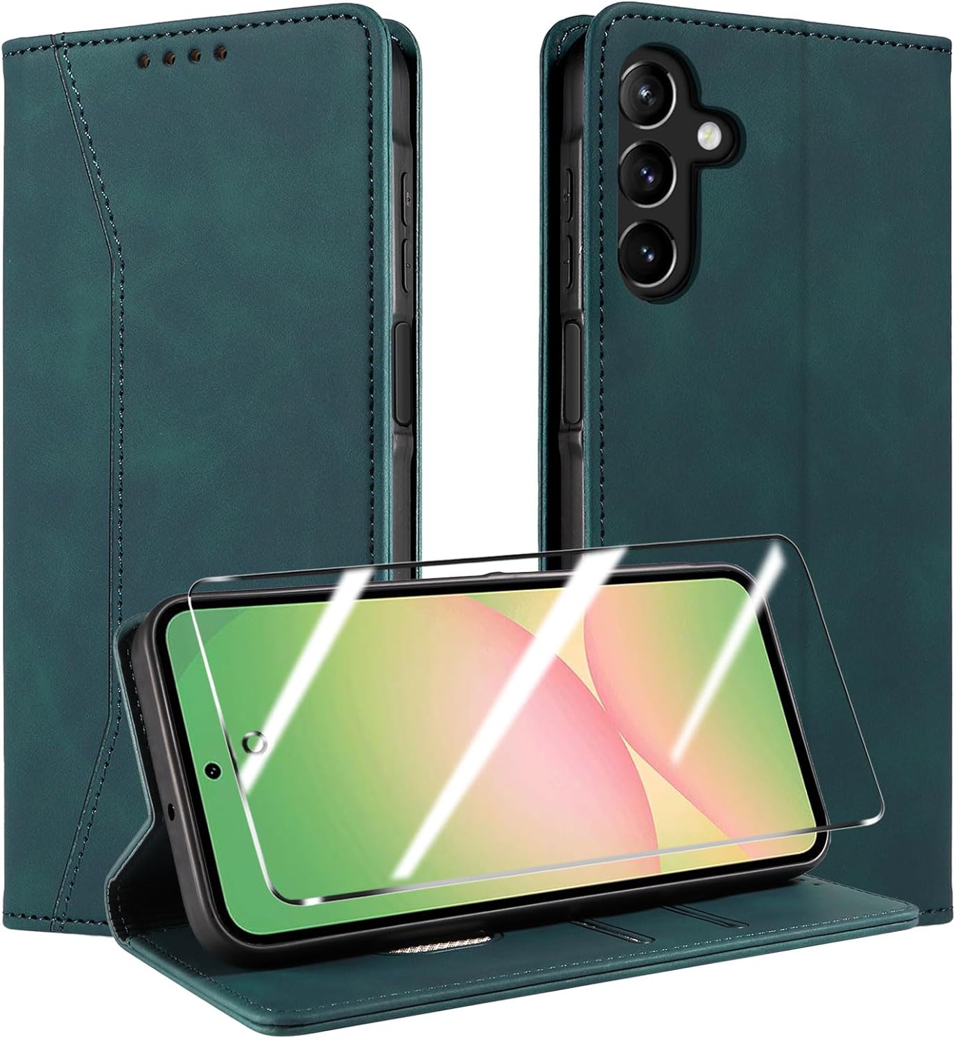 QHOHQ калъф за мобилен телефон за Samsung Galaxy A56 / A36 5G, калъф със закалено стъкло, първокласен кожен защитен калъф, RFID блокиране, магнитен сгъваем калъф-чантичка, многофункционален, удароустойчив, морско зелено