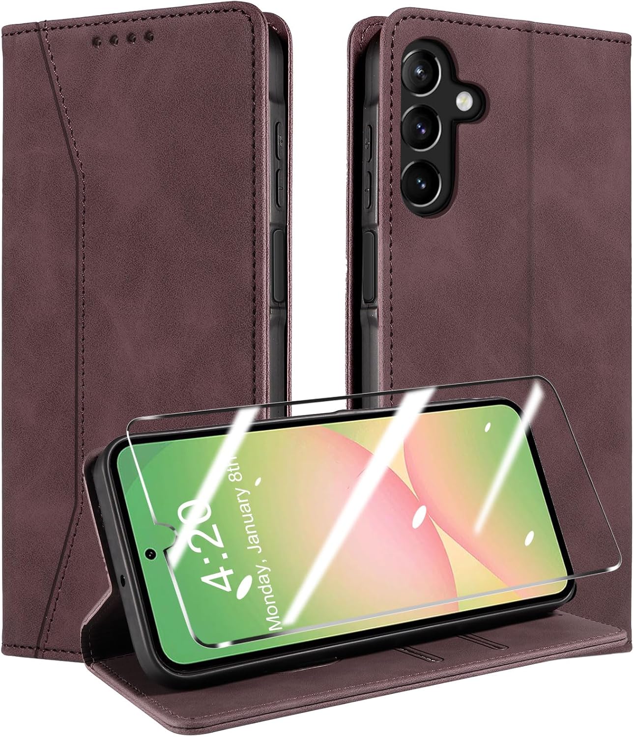 QHOHQ калъф за мобилен телефон за Samsung Galaxy A56 / A36 5G, калъф със закалено стъкло, първокласен защитен калъф от кожа, RFID блокиране, магнитен сгъваем калъф-чантичка, многофункционален, удароустойчив, бордо червен