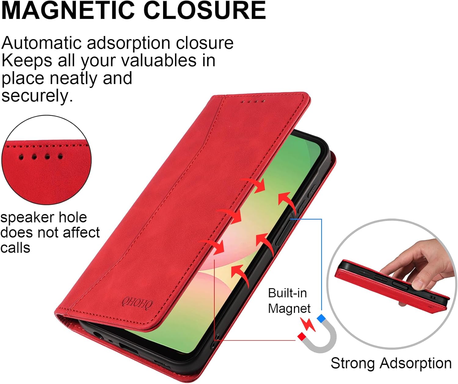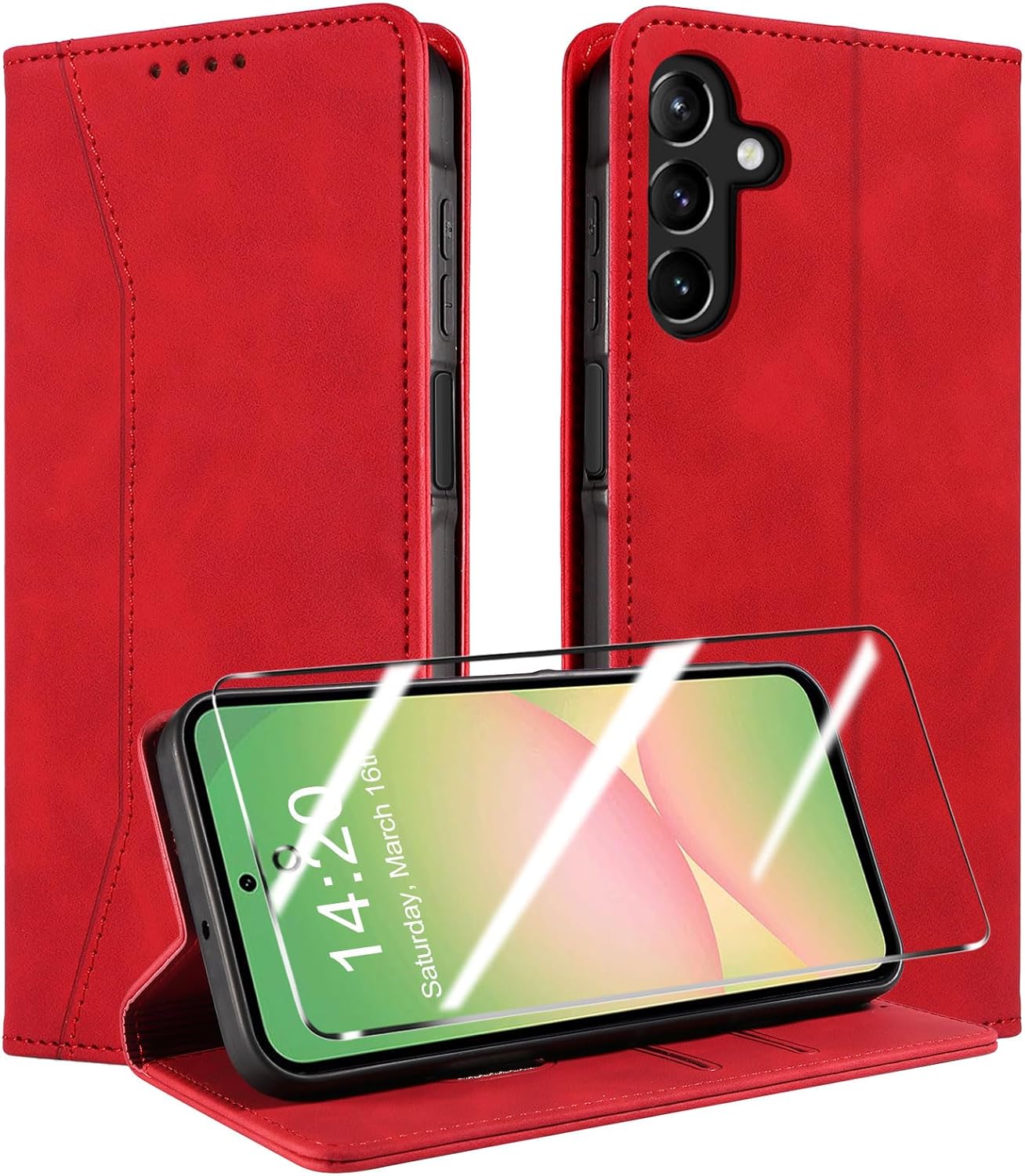 QHOHQ калъф за мобилен телефон за Samsung Galaxy A56 / A36 5G, калъф със закалено стъкло, първокласен защитен калъф от кожа, RFID блокиране, магнитен сгъваем калъф-чантичка, многофункционален, удароустойчив, червен