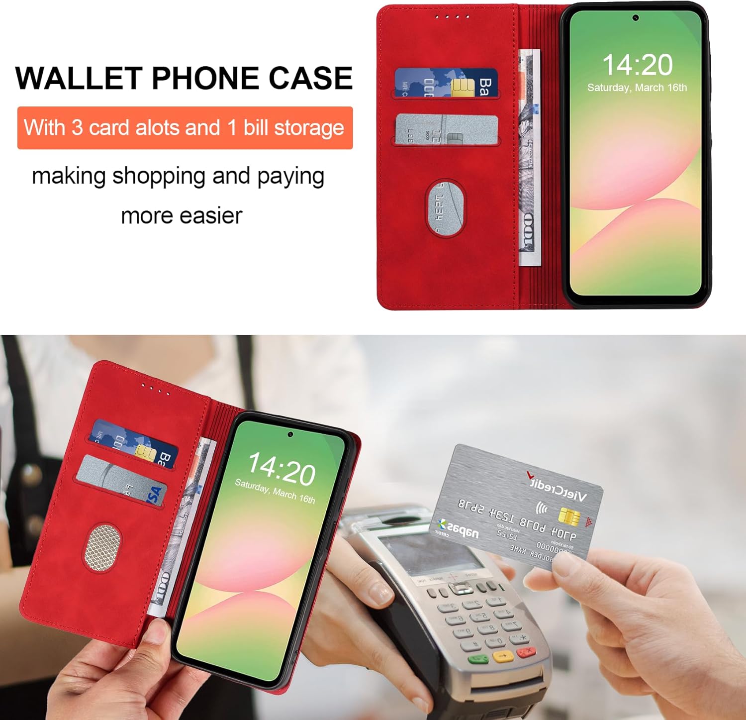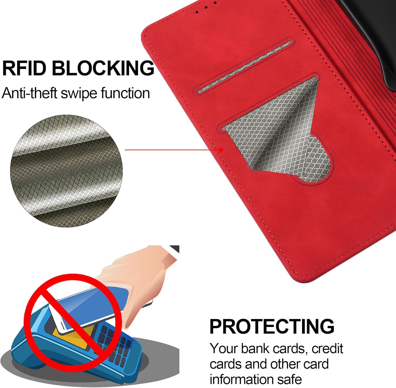 • Стил на портфейл и функция за защита срещу кражба: Подбрани екраниращи материали, изработени с технология за радиочестотна идентификация (съкращения: RFID), за да предпазят вашата банкова карта, кредитна карта и друга информация за картата от кражба. Калъф за мобилен телефон тип портфейл с 2 слота за карти и 1 допълнително отделение за пари, този кожен калъф е перфектната комбинация от калъф за мобилен телефон и портфейл. С него можете лесно да транспортирате ежедневните си вещи.