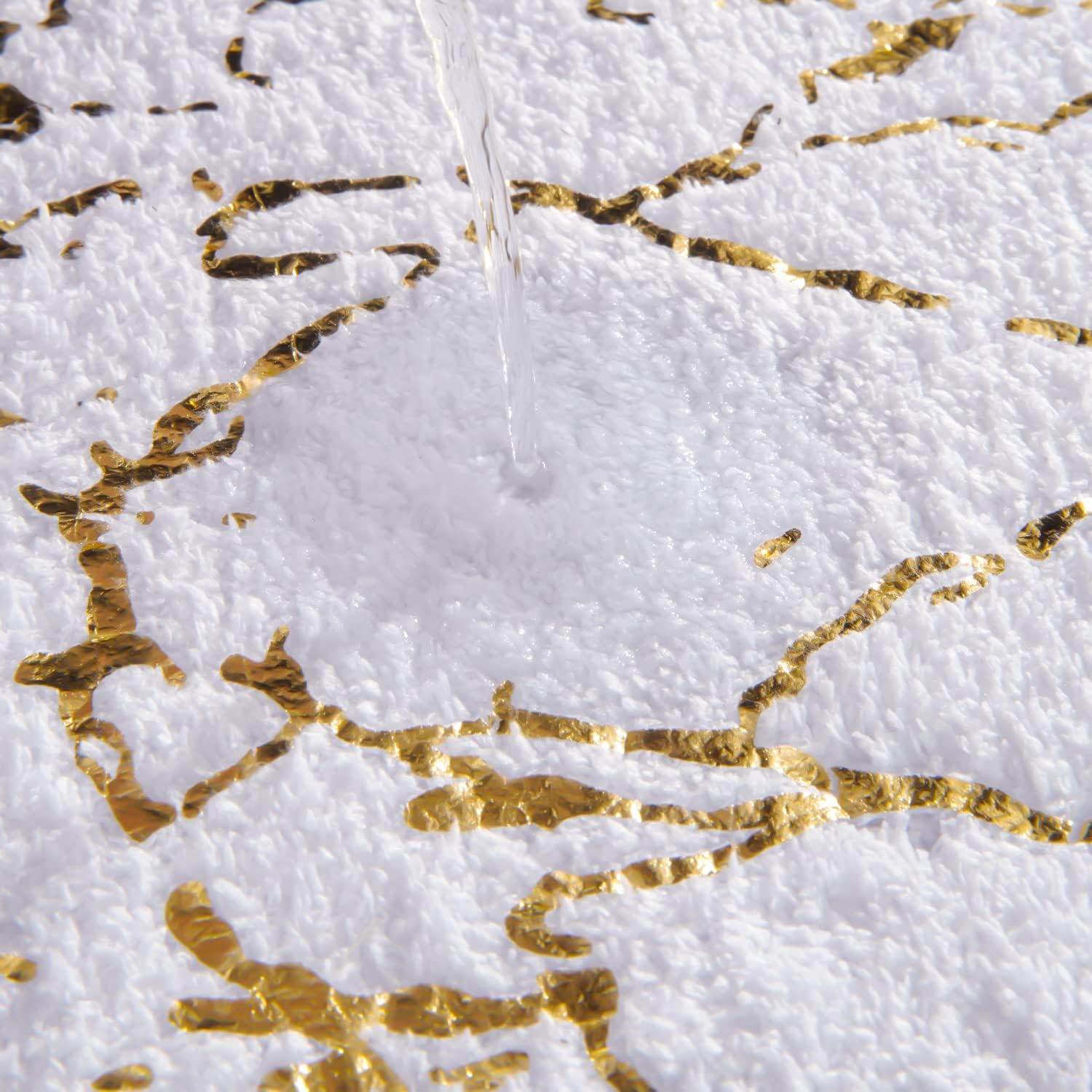 Под въздействието на високи температури, нанесени върху микрофибърната повърхност с внесено лепило чрез машина с високо налягане, златното фолио се вгражда дълбоко в повърхността.