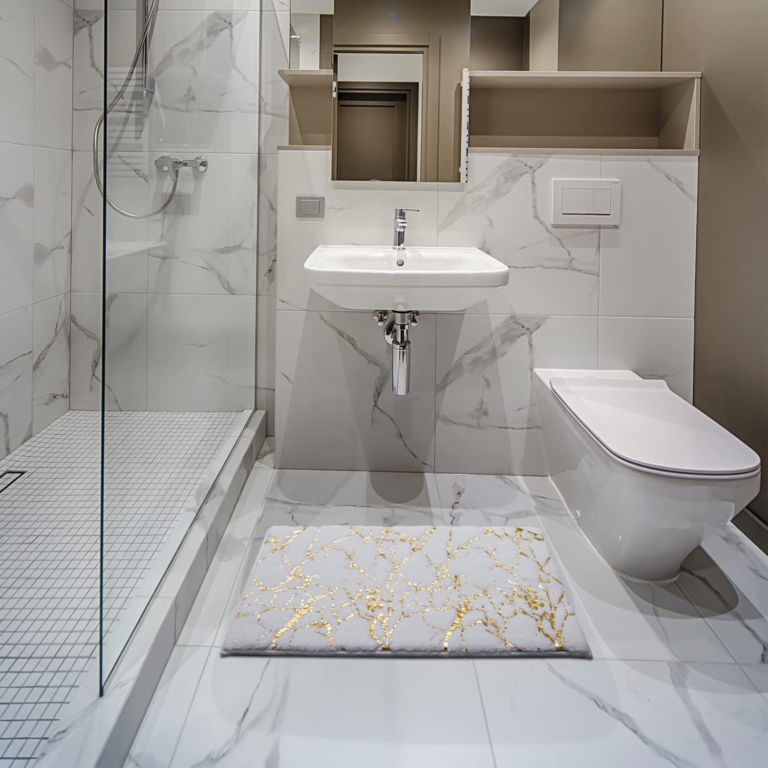 The golden pattern makes this floor mat look more luxurious and the decoration of the bathroom is a good choice.