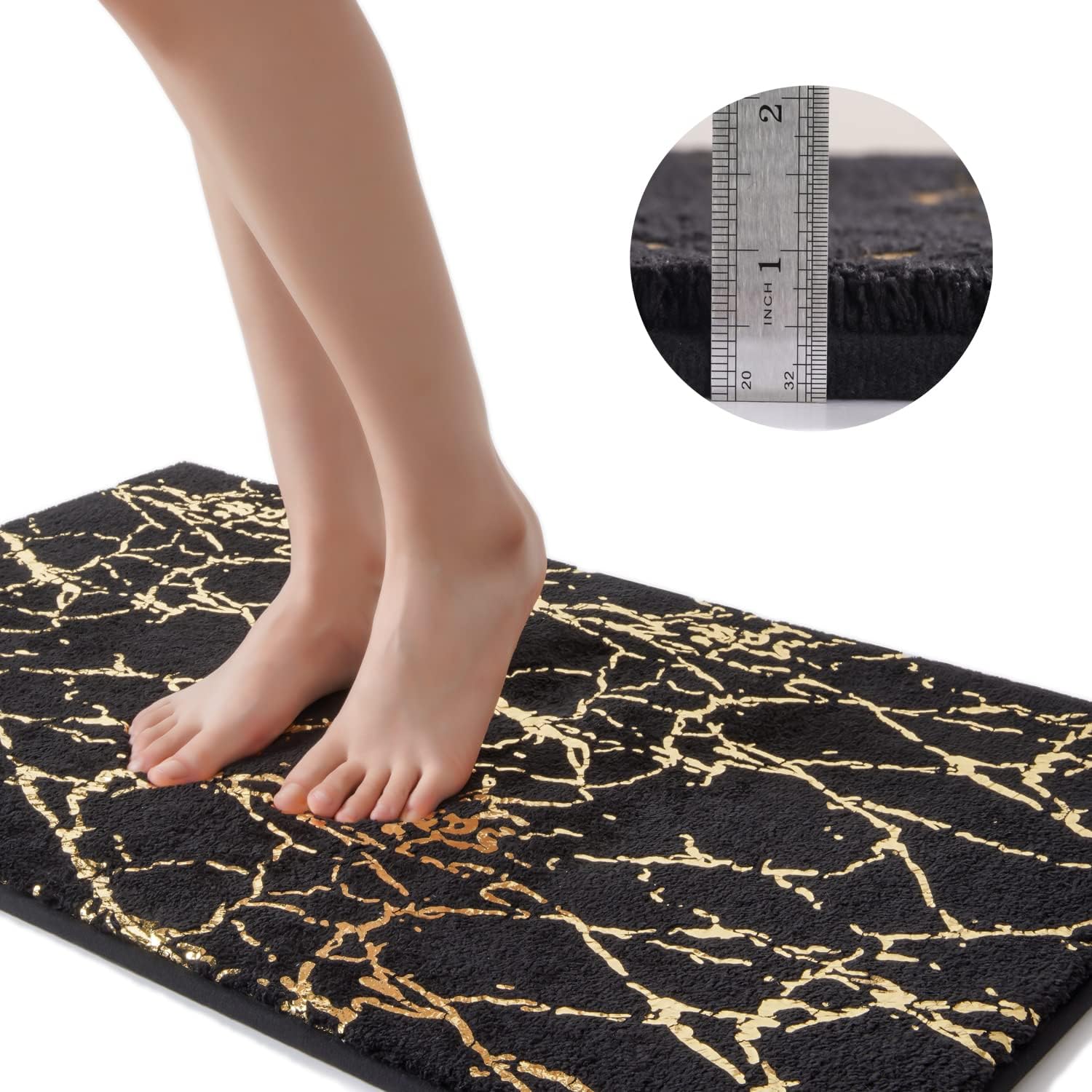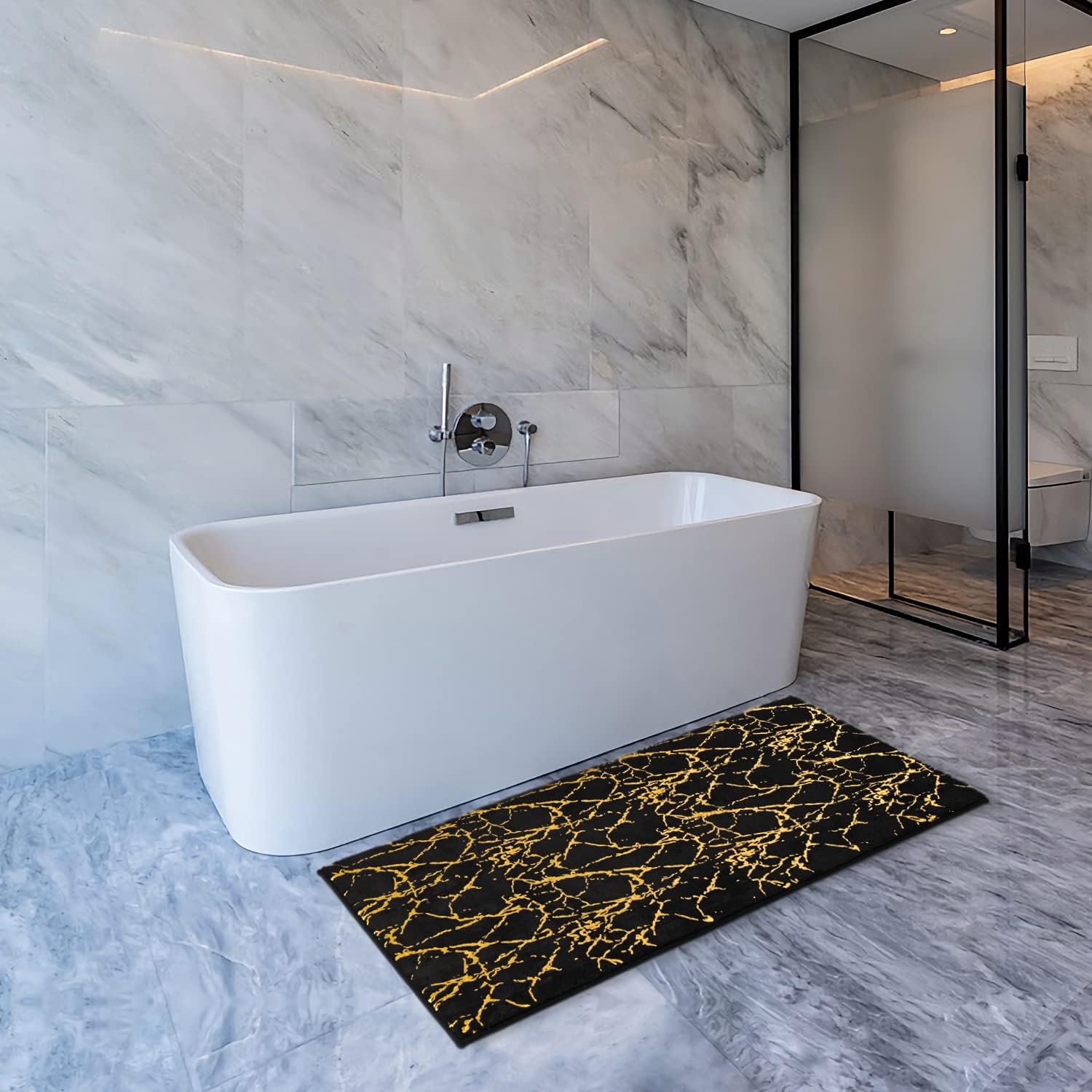 The golden pattern makes this floor mat look more luxurious and the decoration of the bathroom is a good choice.