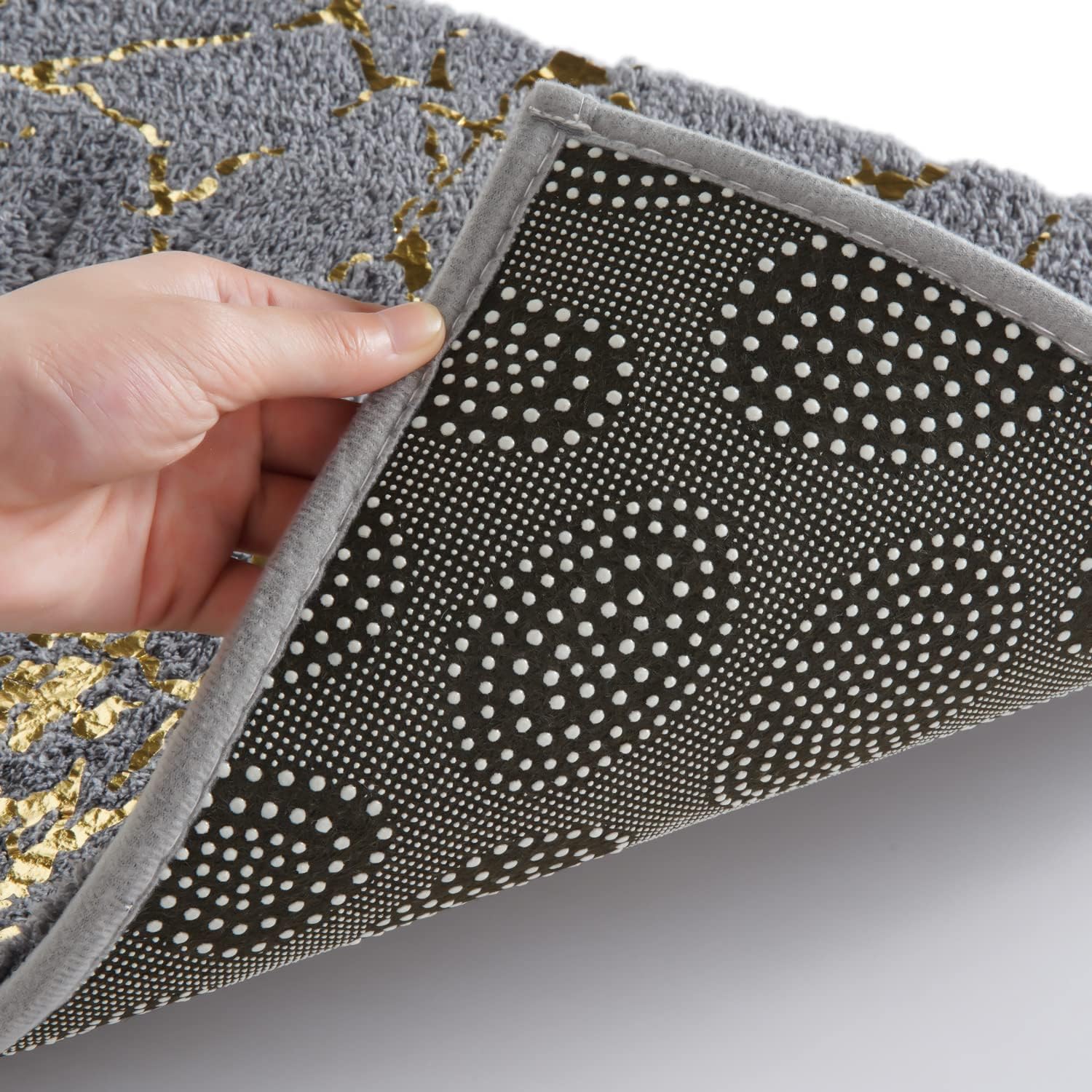 The golden pattern makes this floor mat look more luxurious and the decoration of the bathroom is a good choice.