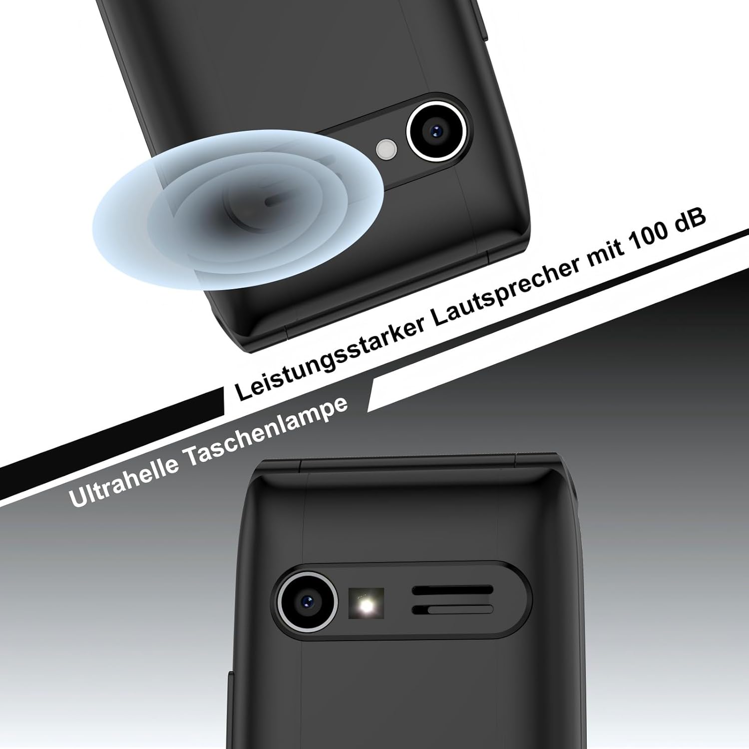 Qubo Senior Мобилен Телефон Сгъваем Мобилен Телефон Без Договор, Мобилен Телефон с Големи Бутони, GSM Сгъваем Мобилен Телефон SOS Функция за Спешно Повикване, Фенерче, FM Радио, 2.4-инчов Цветен Дисплей, Черен