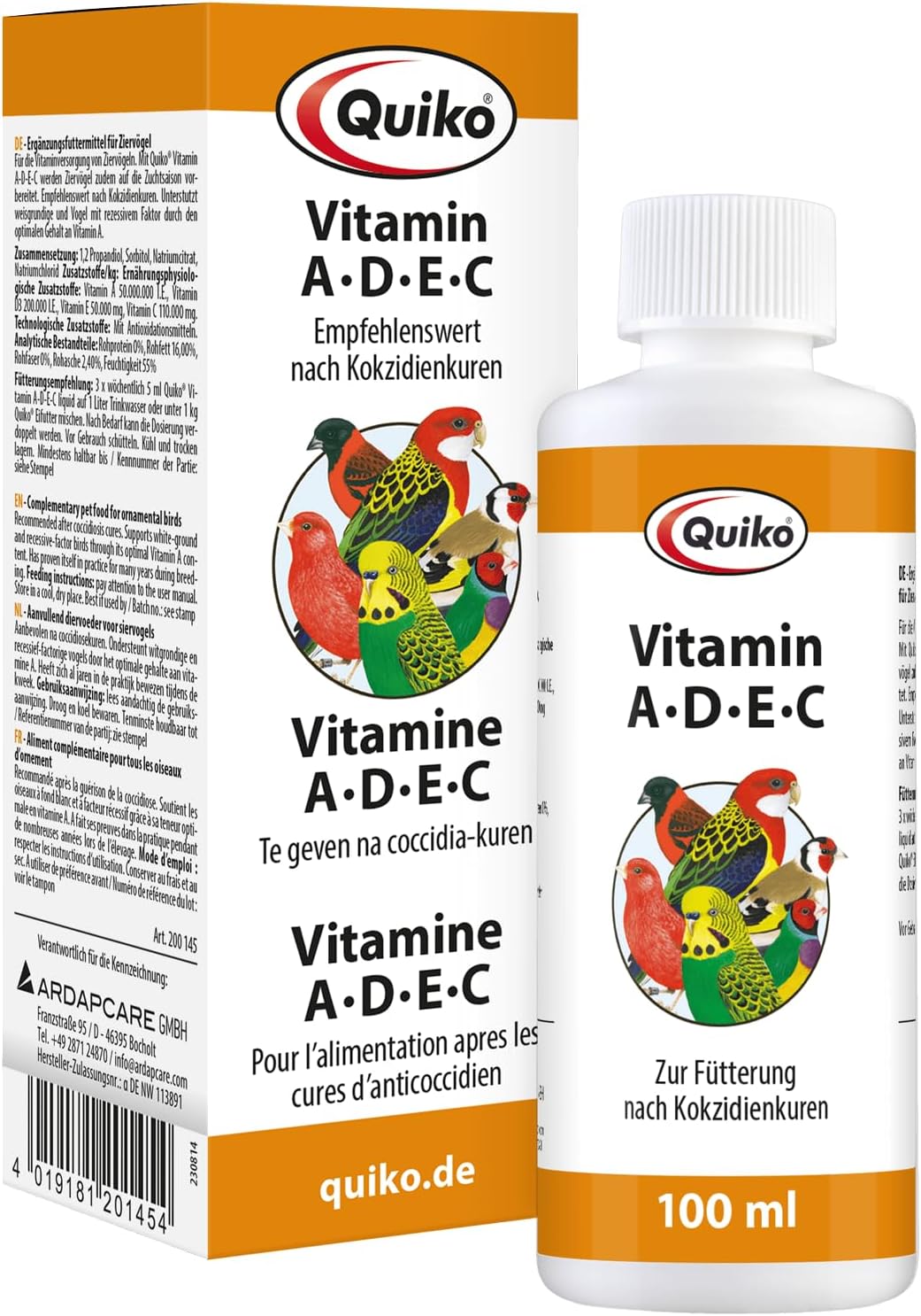 Допълнителна храна за декоративни птици. Препоръка за хранене: Смесете 5 мл течност Quiko Vitamin ADEC в 1 литър питейна вода или в 1 кг храна за яйца Quiko 3 пъти седмично. Дозата може да се удвои, ако е необходимо.
