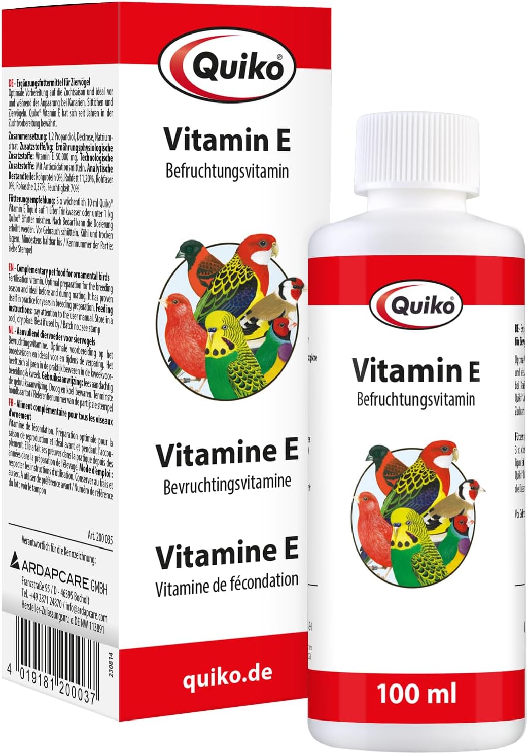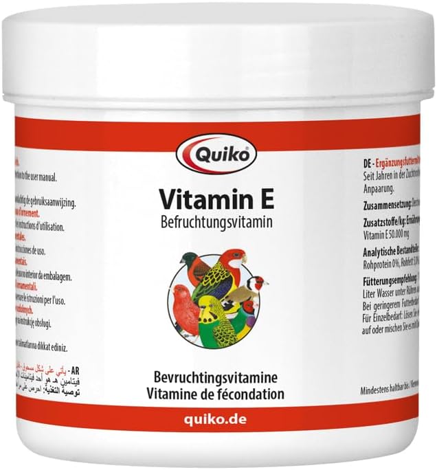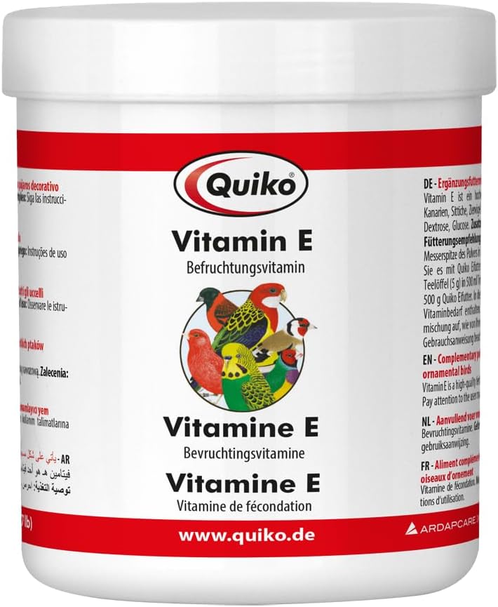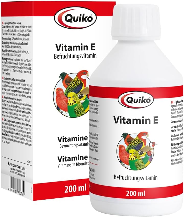 Допълнителна храна за декоративни птици: Смесете 10 мл течност Quiko Vitamin E в 1 литър питейна вода или в 1 кг храна за яйца Quiko 3 пъти седмично. Дозата може да се увеличи при необходимост.