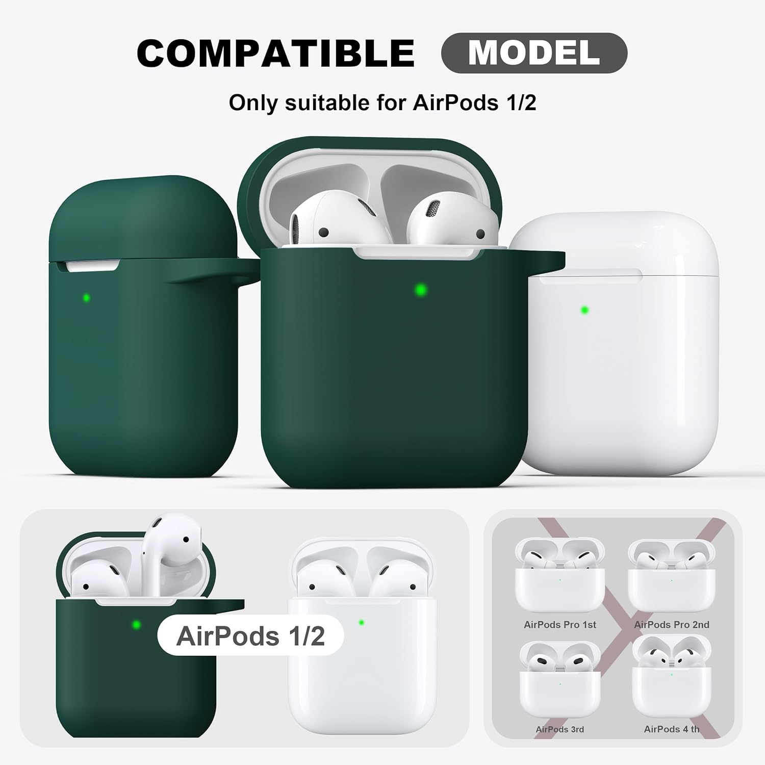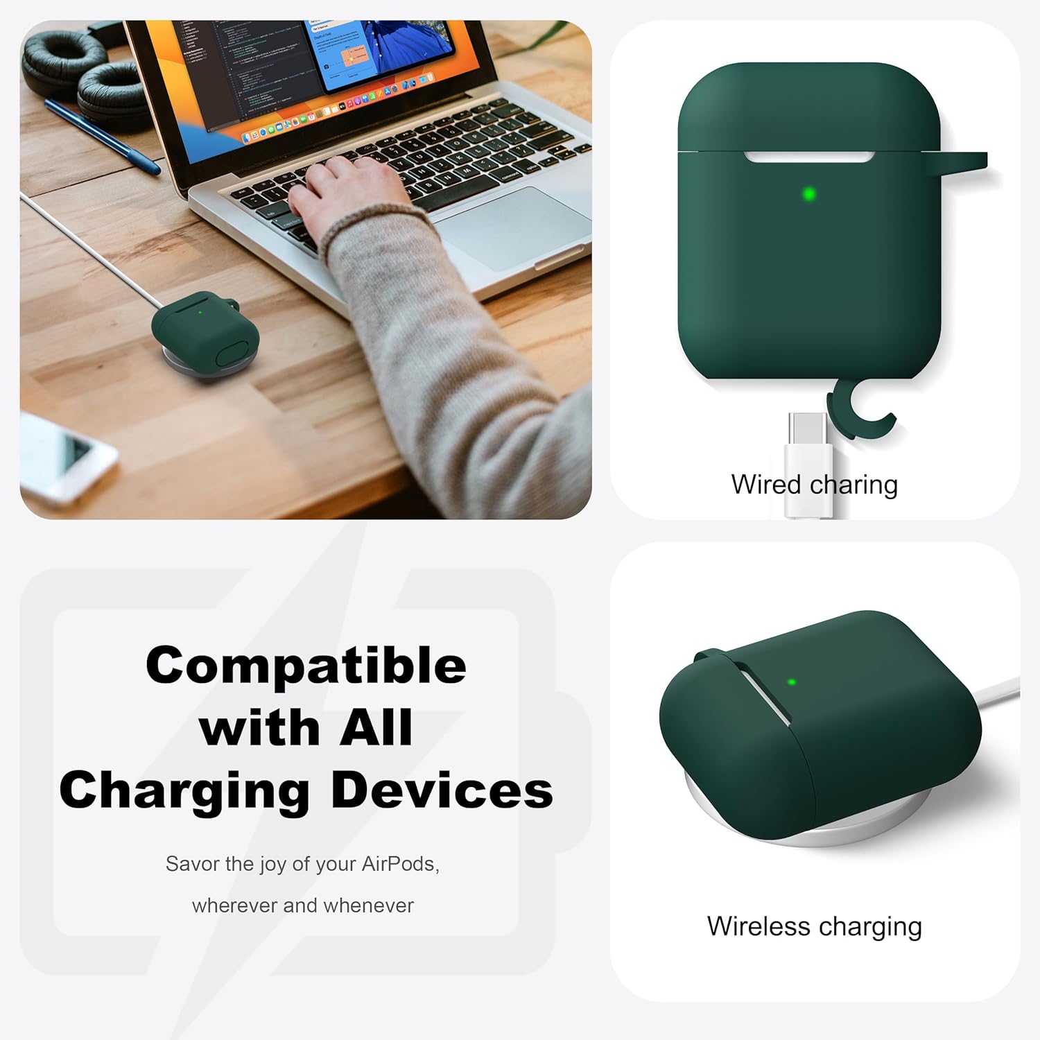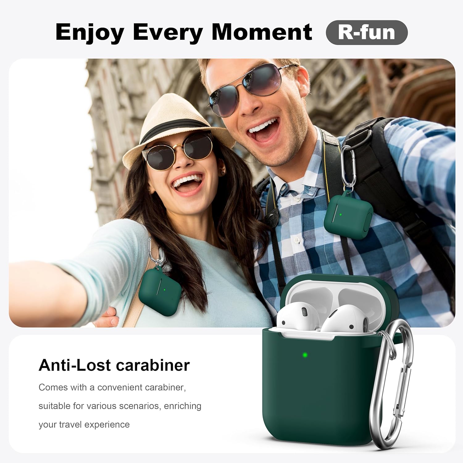 R-fun Съвместим с AirPods 2-ро поколение 2019, калъф за 1-во поколение 2016 с комплект за почистване и ключодържател, мека силиконова защита за Apple AirPods, черно-зелен
