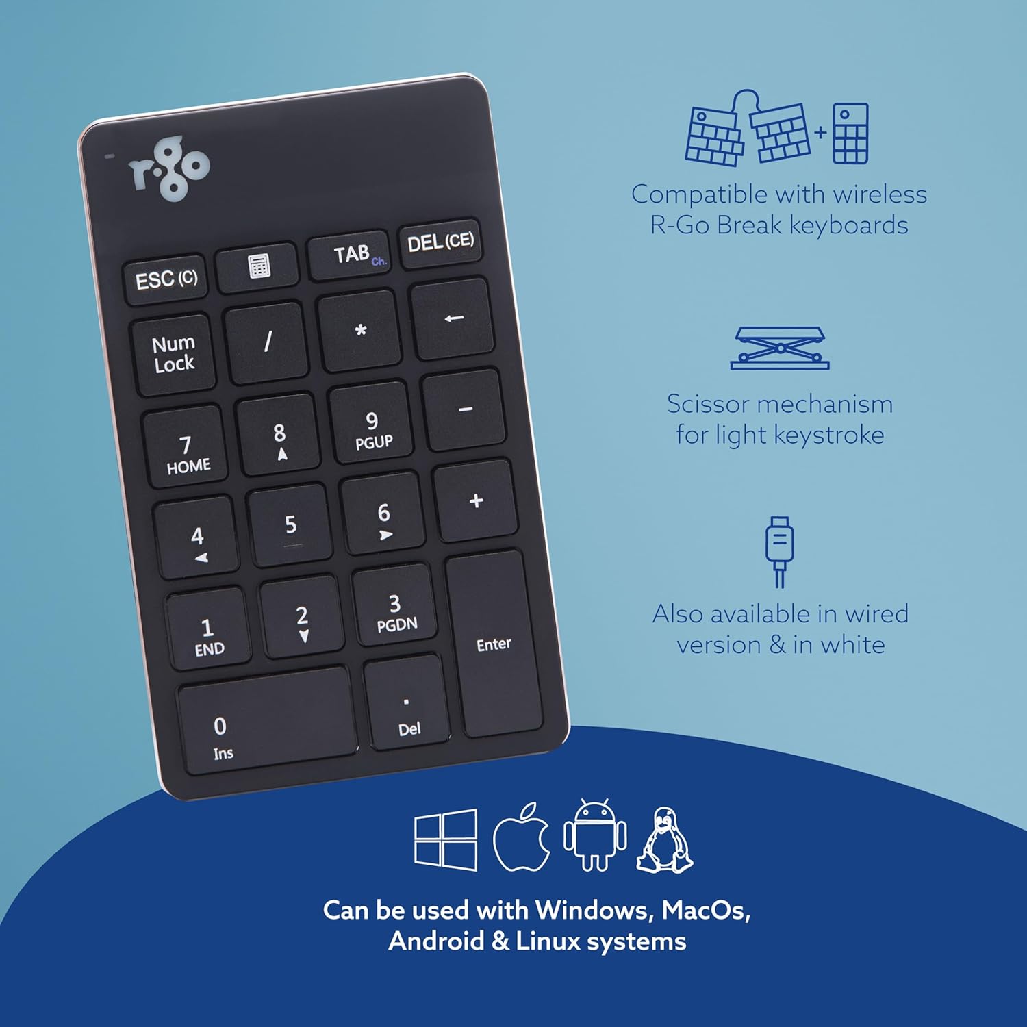 • Съвместимост: тази цифрова клавиатура се предлага с кабел и без кабел. Кабелната версия има 1,5 м USB кабел. Безжичната версия работи чрез Bluetooth връзка. Използвайте отделно или с клавиатури R-Go Break.