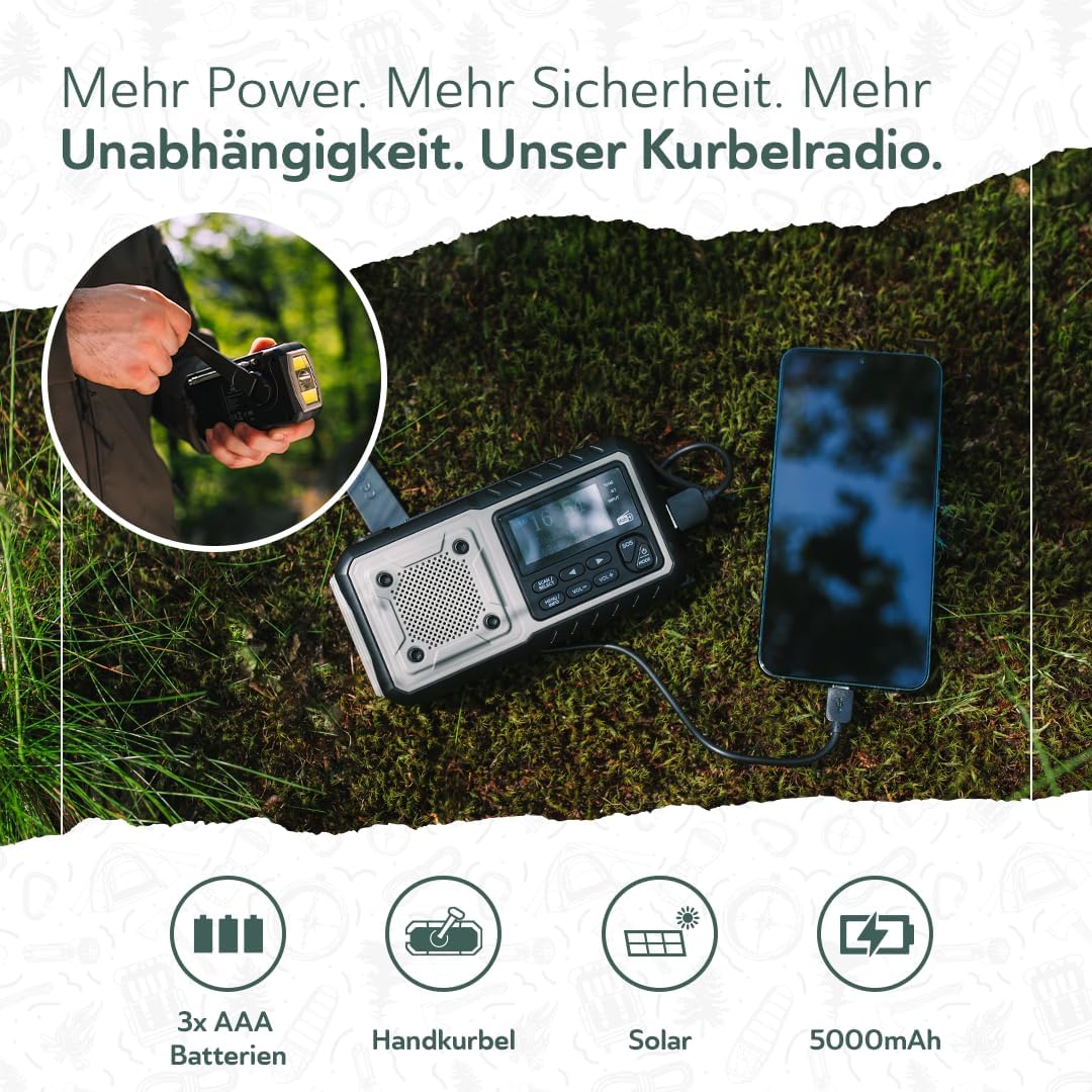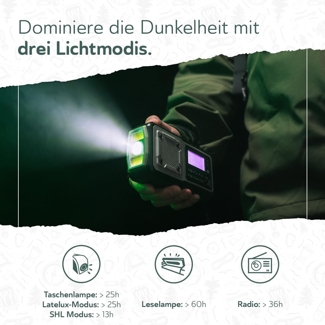 • Електричество на открито. Независимо дали обичате къмпингуване, туризъм или по друг начин попадате в тежки ситуации - с нашата аварийна радиостанция определено сте се погрижили за всичко. Благодарение на захранването, ние генерираме до 3 пъти повече енергия от конвенционалните аварийни радиостанции!