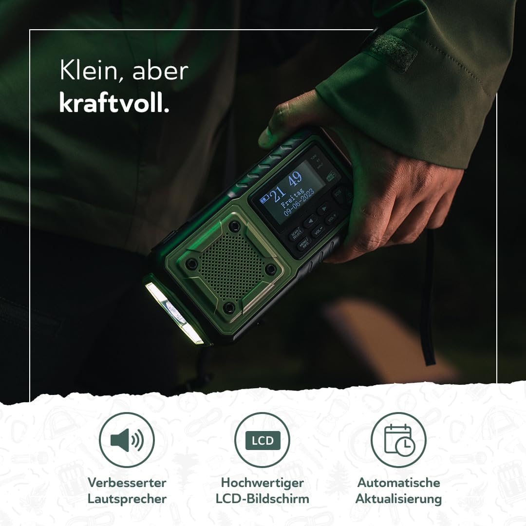 • Универсално и практично: Нашето радио с кранче предлага не само висококачествено радио удоволствие, но и вградена функция за аларма за перфектно начало на деня. Контролът за опазване на околната среда и безопасност гарантира, че винаги сте в крак с времето. Лесен достъп и неограничено удоволствие от слушането.