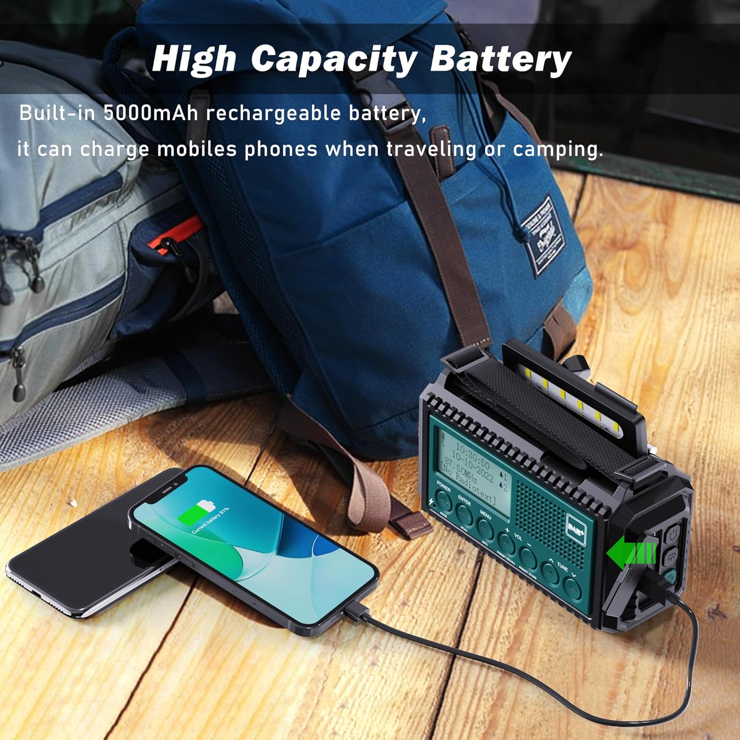 • Пет метода за зареждане и аварийно радио: DAB+ радио чрез кабел тип C, соларен панел, AAA батерия (не е включена), вградена батерия с голям капацитет или ръчно зареждане. Разполага с презареждаща се батерия, можете също да зареждате мобилния си телефон или други устройства чрез USB кабел. При спешни случаи или приключения на открито, соларното радио може да се използва като източник на захранване, което е много практично. Ръчната каишка и карабинерът улесняват закрепването към раницата.
