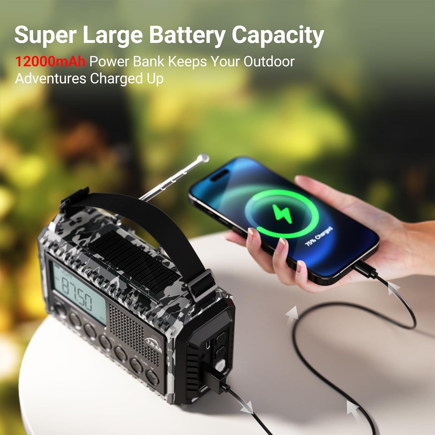Радио с манивела и батерия 12000 mAh, презареждащо се, преносимо къмпинг радио с фенерче и лампа за четене, аварийно радио AM/FM/SW тип C връзка, SOS алармено динамо радио за туризъм, на открито