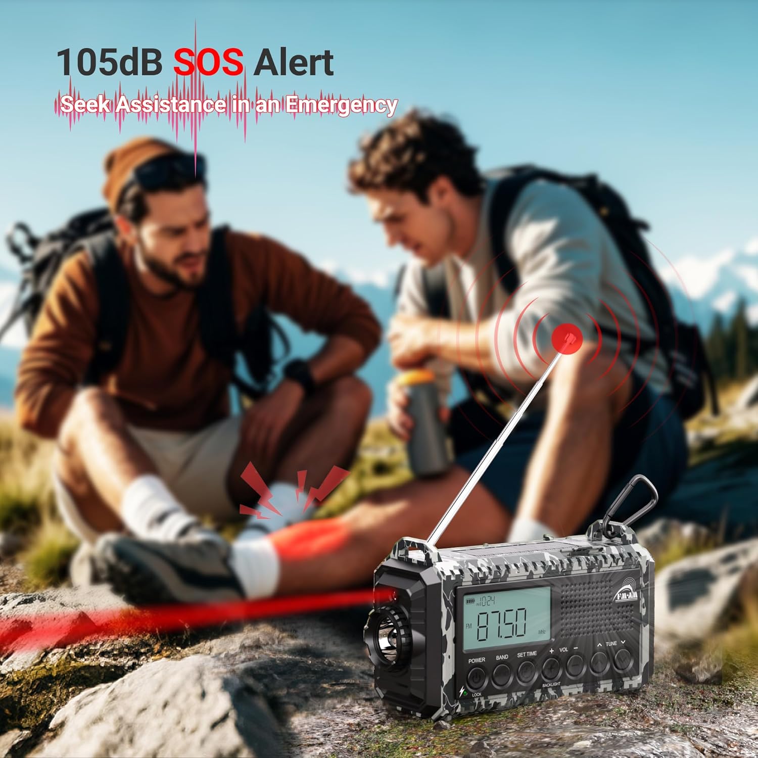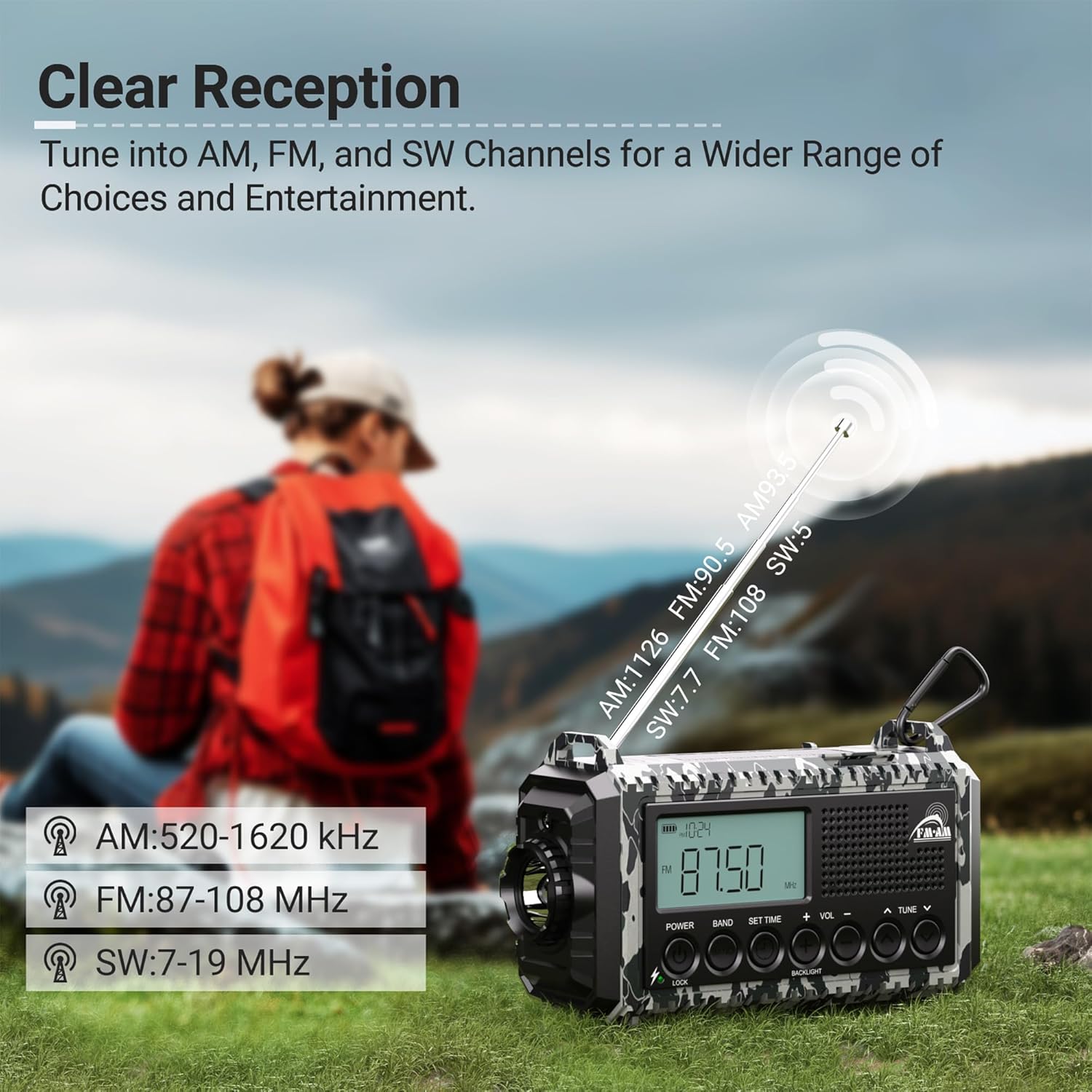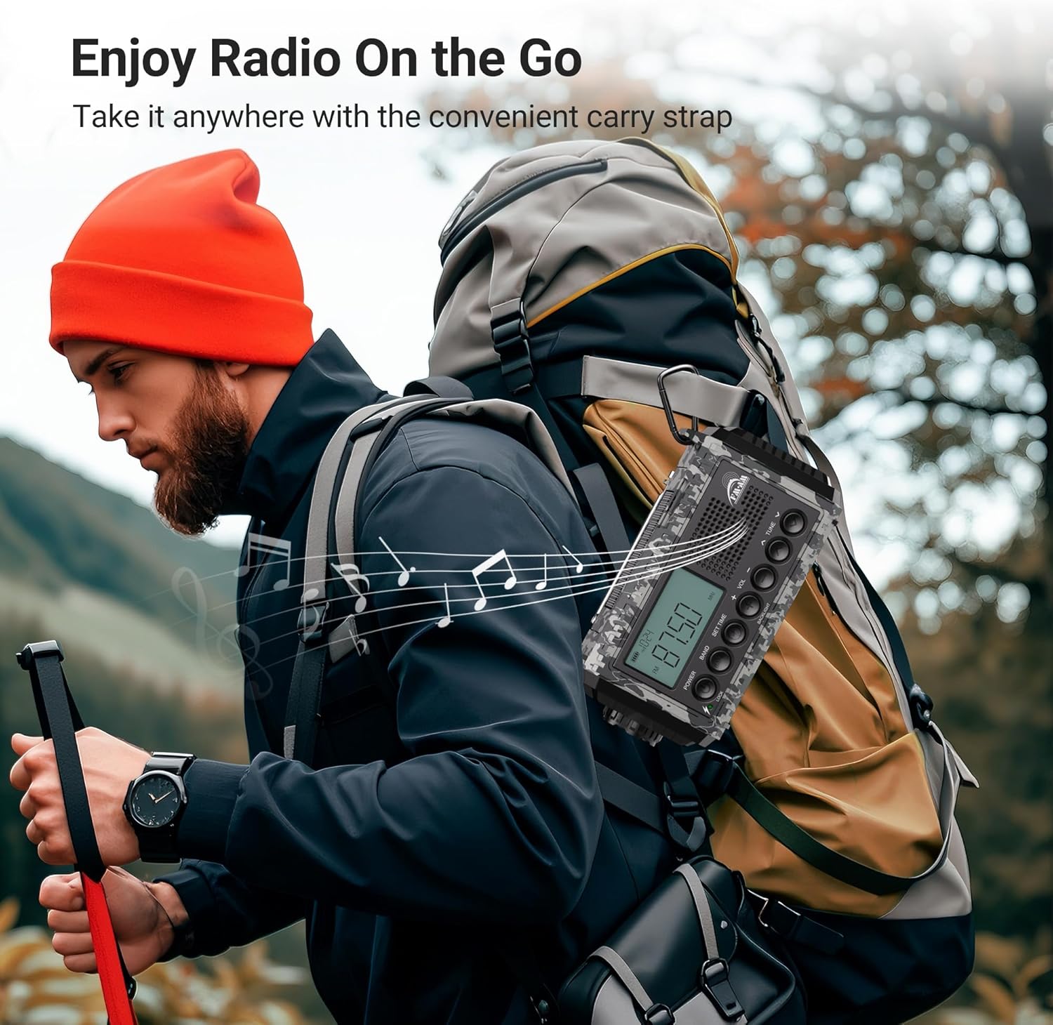 • SOS-ALL-ALL & ВОДОУСТОЙЧИВО IP: Соларното радио за открито е много подходящо за дейности на открито, като къмпинг и планинарство. Ръчната каишка и карабинерът улесняват закрепването му към раницата. Когато сте в опасност, моля, натиснете бутона SOS, радиото с манивела ще мига в червено и ще издаде звук, достатъчно силен, за да привлече вниманието на спасителите. Водоустойчиво IPX4, малки капки дъжд, пръскащи се върху устройството, няма да го повредят. Забележка: Не потапяйте във вода.