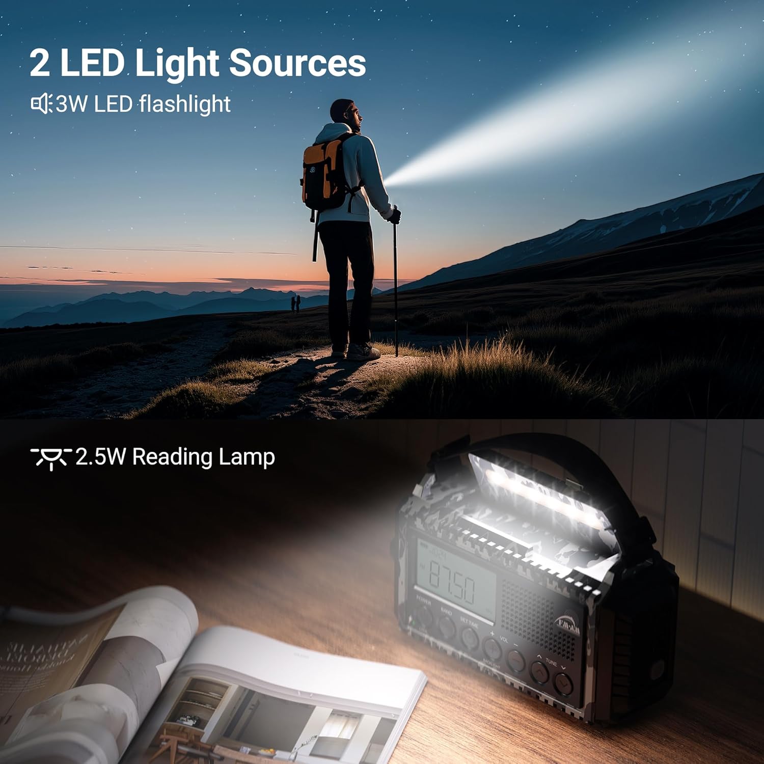 • Светлина и сгъваема светлина: слънчевото радио има фенерче и лампа за четене, има две опции за яркост: висока яркост или нормална яркост. Яркото фенерче може да ви осигури светлина и по-добро виждане в тъмното, а сгъваемата лампа за четене може да регулира ъгъла за лесно четене през нощта. Отговаря на вашите различни нужди за нощна употреба.