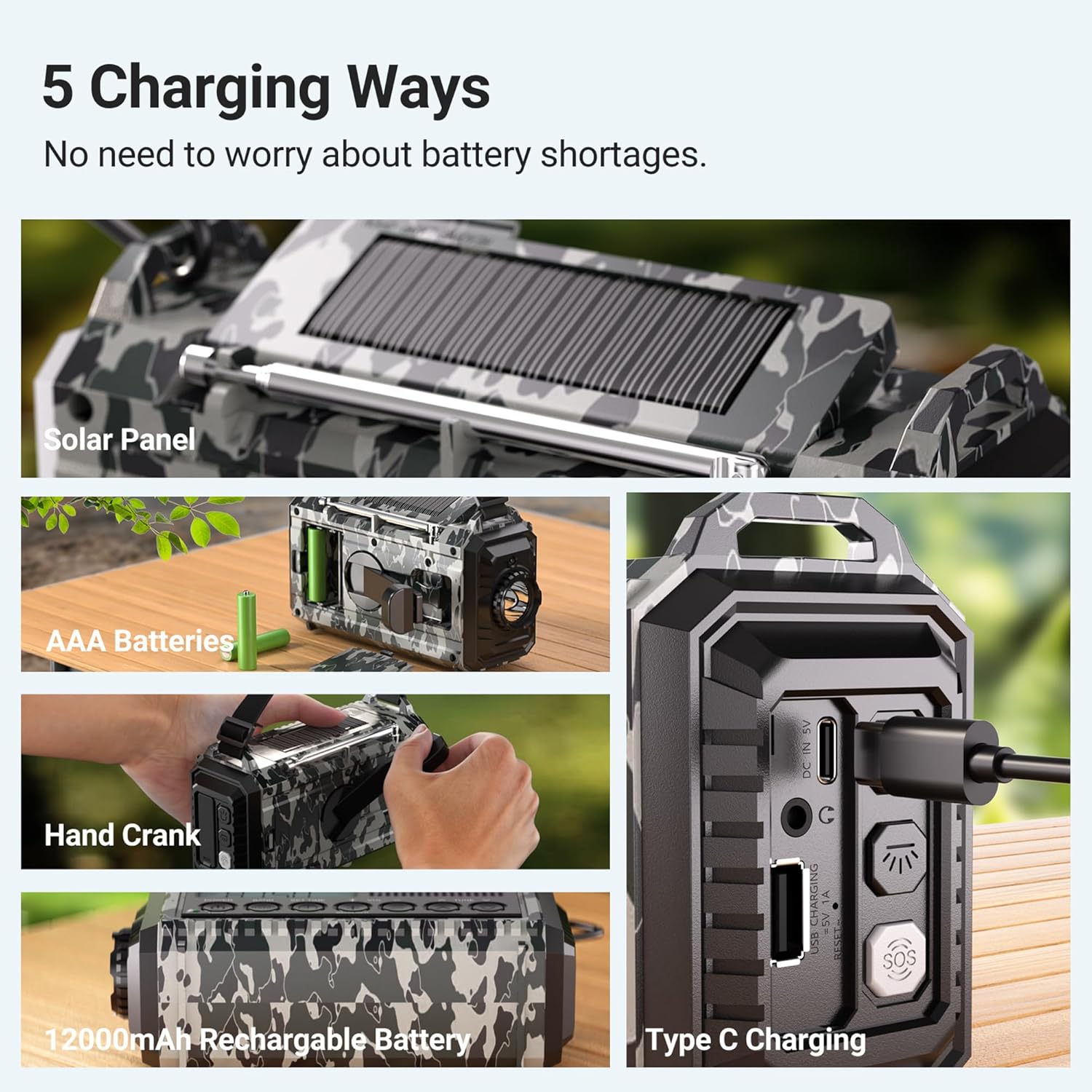 • Пет режима на зареждане и захранващи ръчки: преносимо радио чрез Type-C кабел, соларен панел, AAA батерия (не е включена), вградена батерия с голям капацитет или ръчна манивела. Тъй като слънчевият панел е малък и служи основно за удължаване на живота на батерията, е много трудно устройството да се зареди напълно само със слънчева енергия. В случай на спешност или когато няма електричество на открито, можете да използвате ръчната манивела за аварийно зареждане. Зареждането чрез Type-C е най-ефективният и бърз начин за зареждане на това радио при ежедневна употреба.