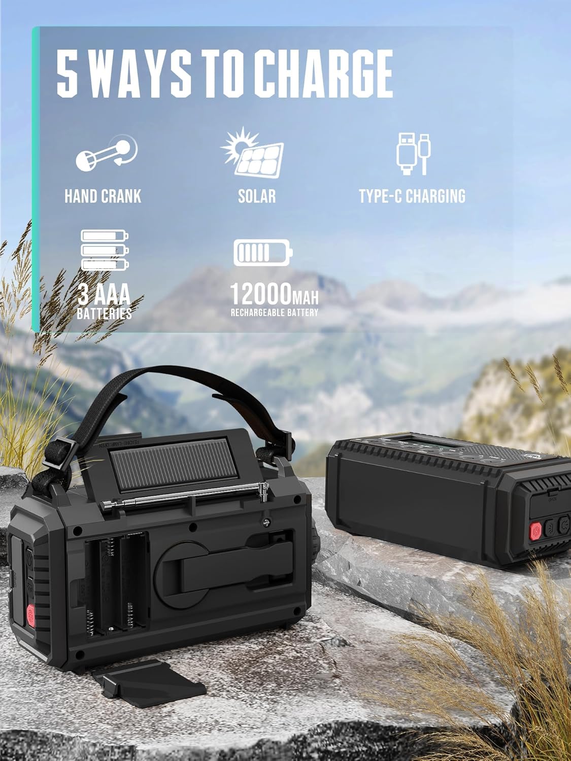 • 【12 000 mAh аварийно радио със слънчева батерия и ръчно зареждане - Универсалното енергийно устройство】​​​​3 пъти зареждане: Бързо зареждане с Type-C​+ Соларно зареждане​ (дори в облаци!) + ​Аварийно захранване с ръчна манивела​ (нямате мрежа? Няма проблем!). ​До 4 пъти по-голям капацитет от конвенционалните радиостанции с манивела