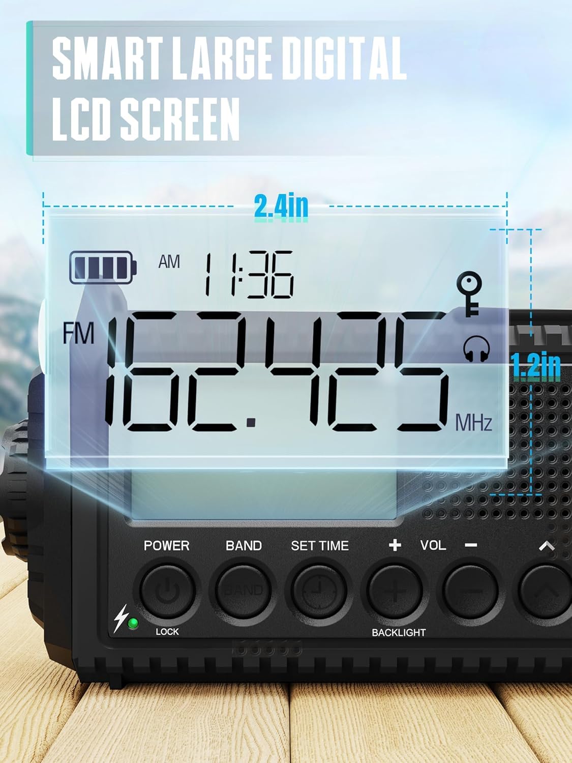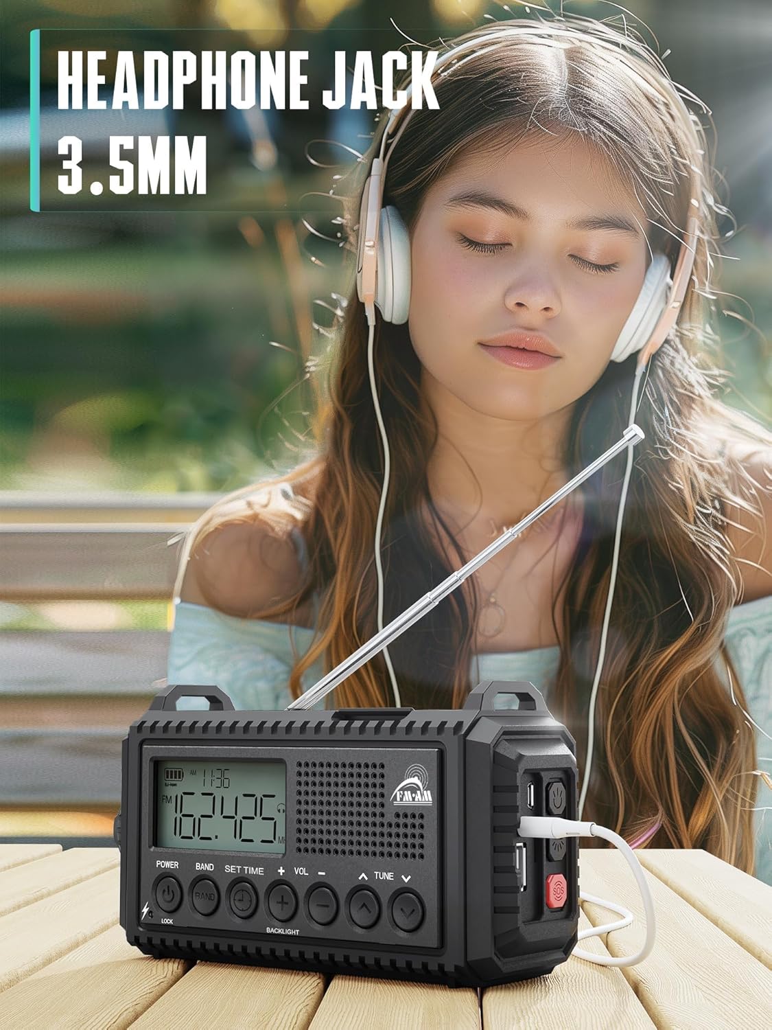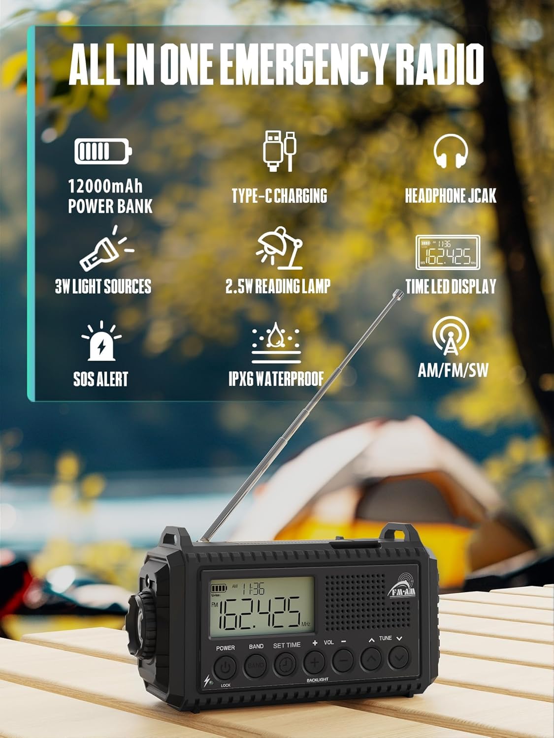 • 【6-в-1 Многофункционално радио за спешни случаи и на открито】​ SOS аларма 12 000 mAh външна батерия LED фенерче AM/FM/SW цифрово радио Лампа за четене Жак за слушалки Вграден часовник ​Компактно и преносимо: Само 172x94x63 мм / 522 г - Идеално за раница и чанта за спешни случаи!