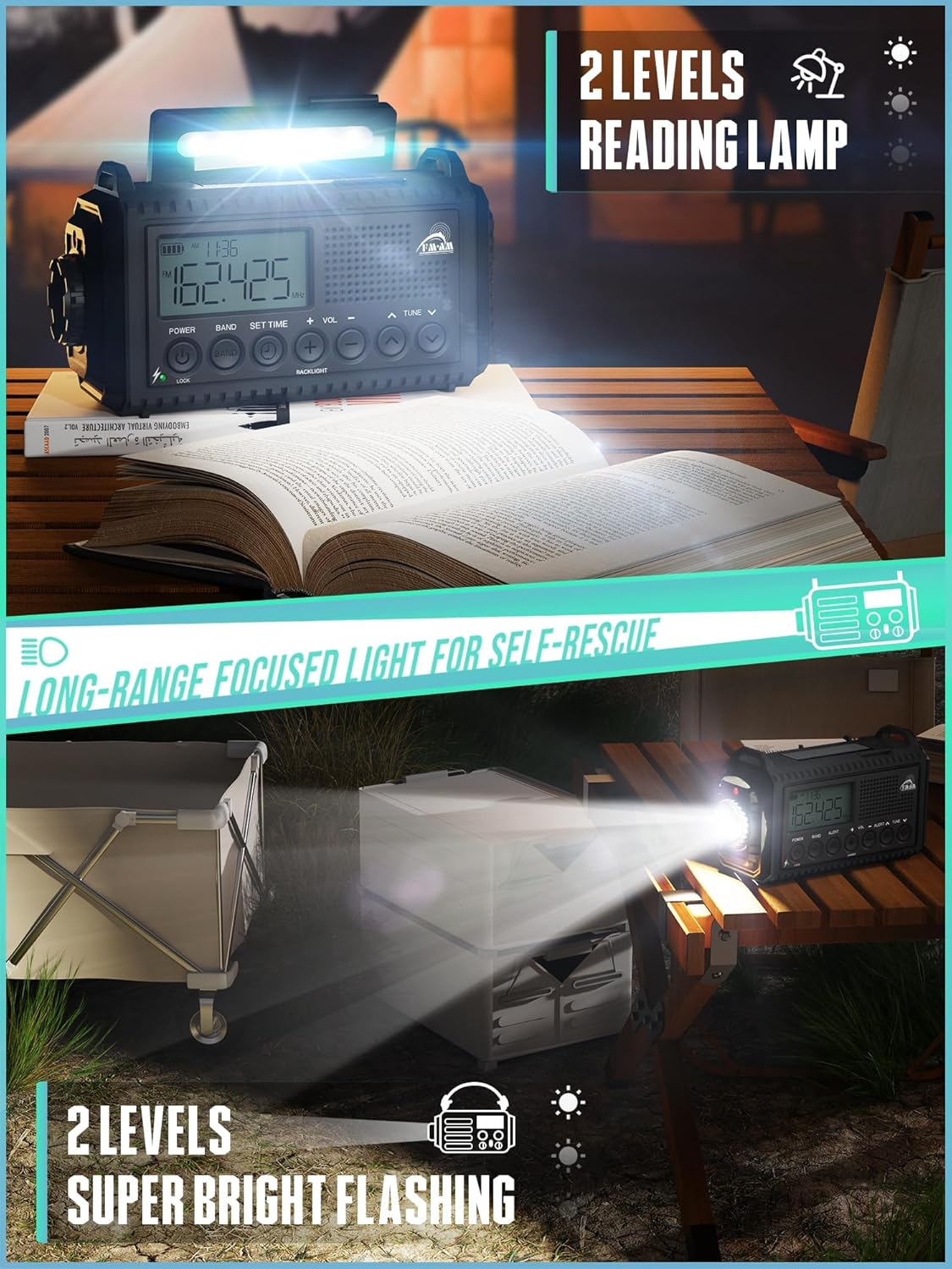 • 【Изключително издръжлив - 3 дни захранване без прекъсване】​​ ​Радио: 50+ часа (50% сила на звука) ​Фенерче: 40-50 часа (150 лумена) ​ Лампа за четене: 60-70 часа (120 лумена) ​SOS аларма: 24 часа непрекъсната работа