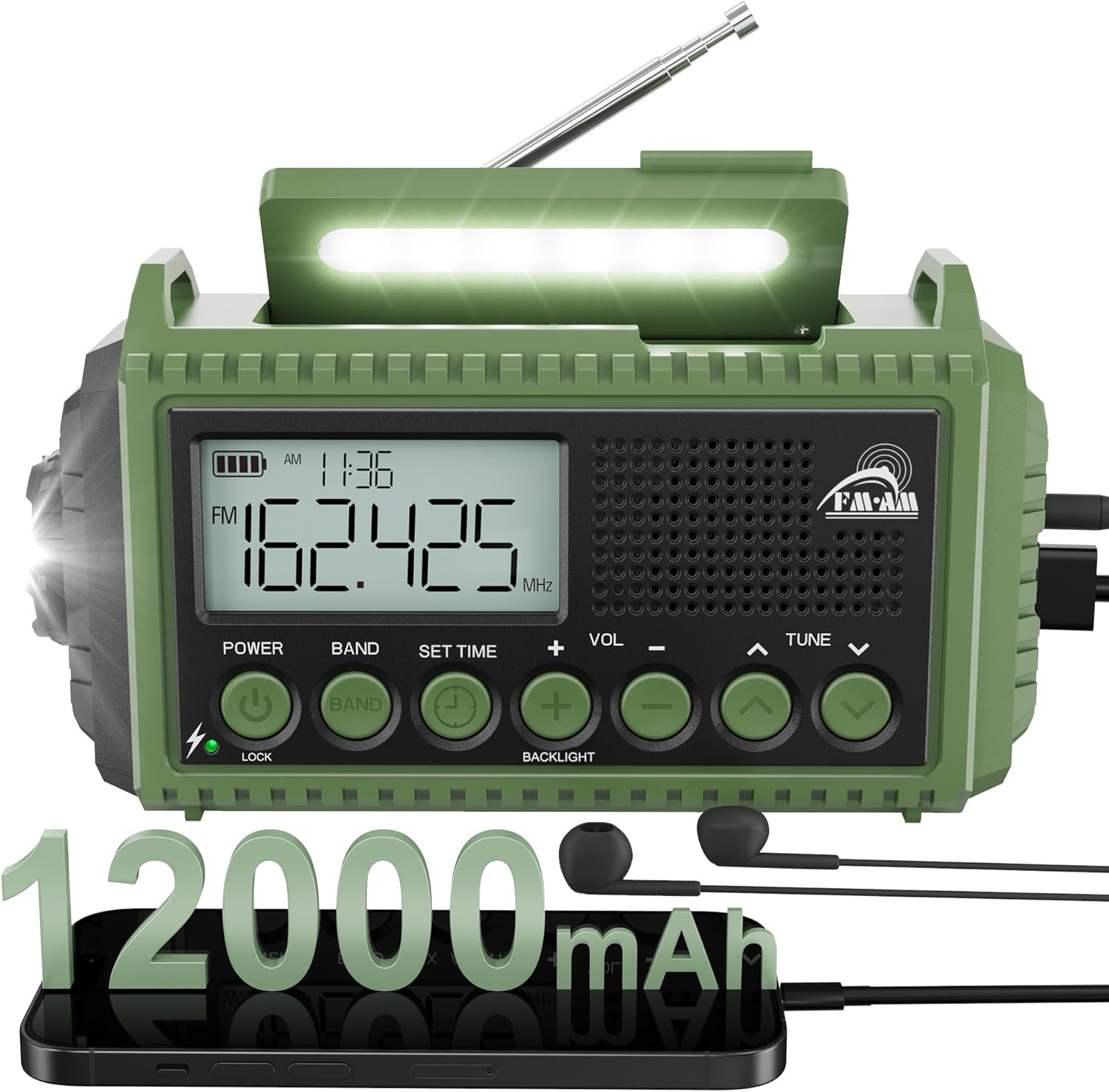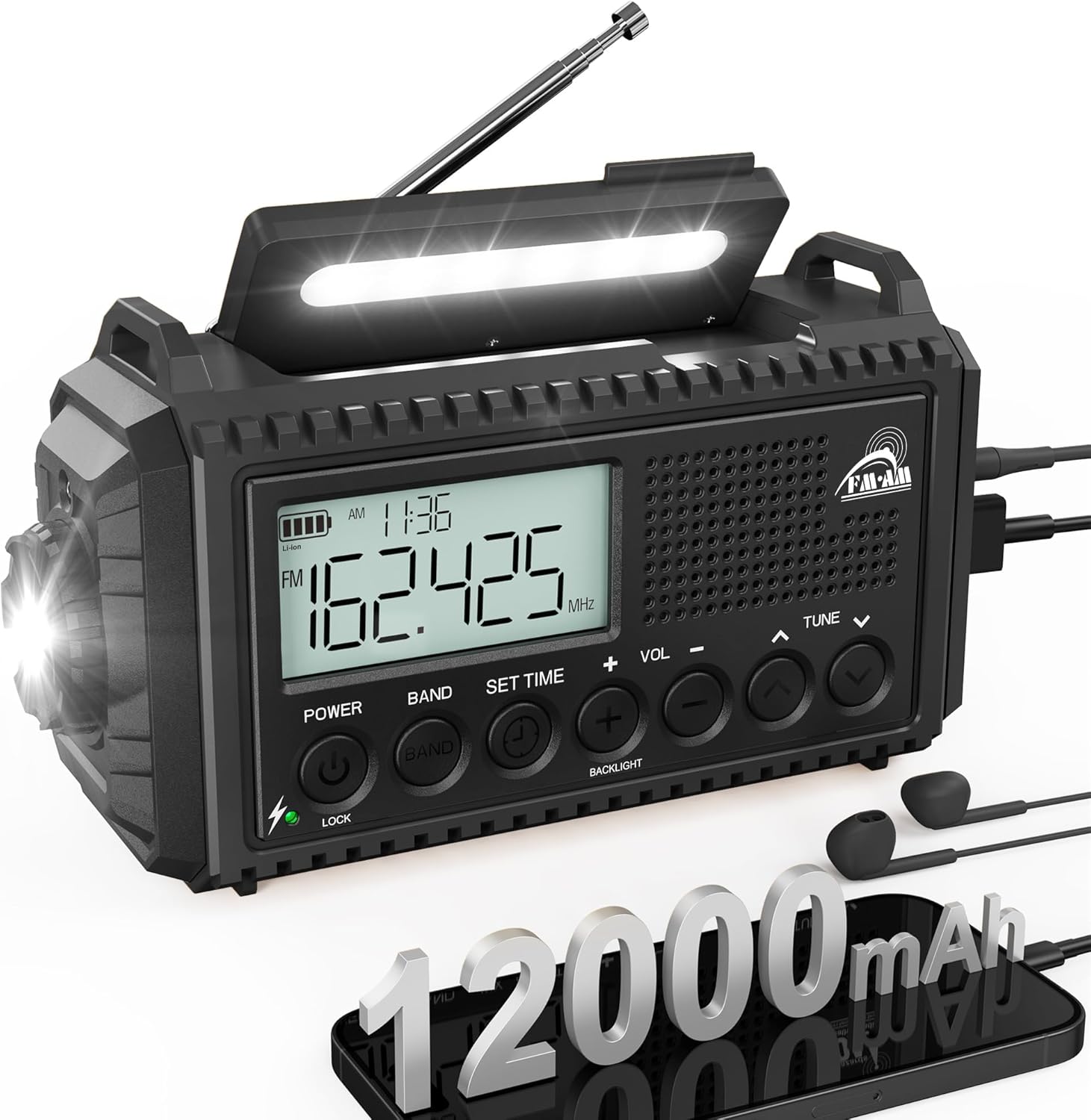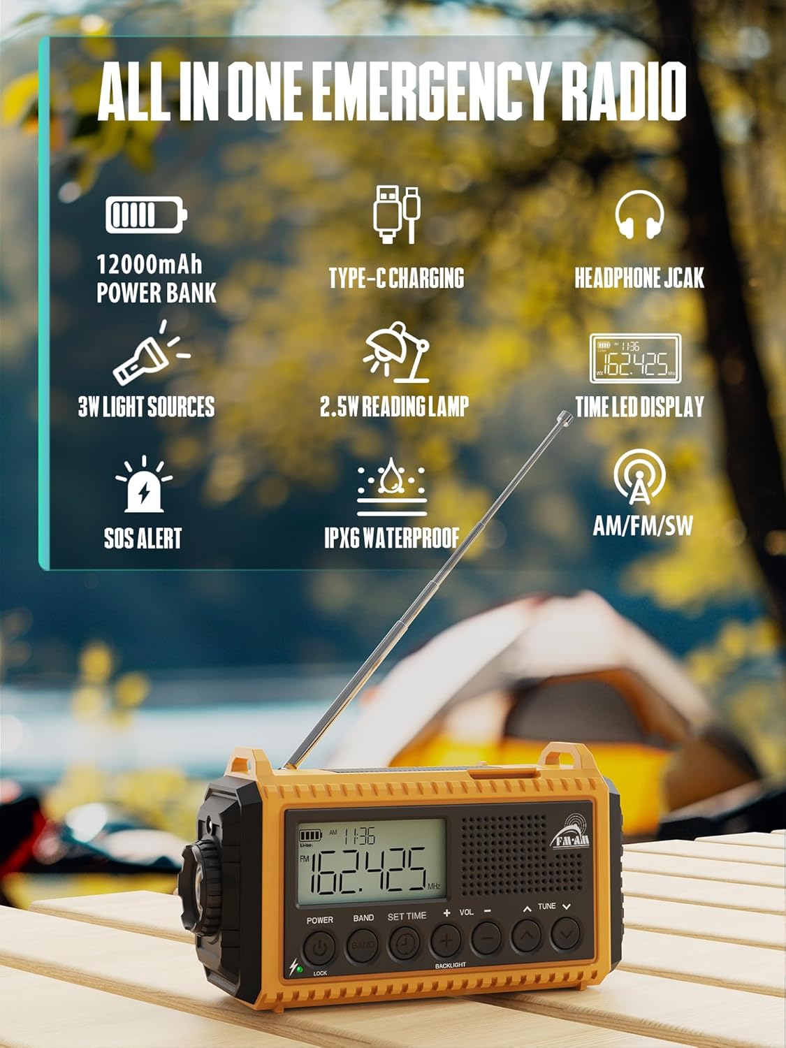 • 【6-в-1 Многофункционално радио за спешни случаи и на открито】​ SOS аларма 12 000 mAh външна батерия LED фенерче AM/FM/SW цифрово радио Лампа за четене Жак за слушалки Вграден часовник ​Компактно и преносимо: Само 172x94x63 мм / 522 г - Идеално за раница и чанта за спешни случаи!