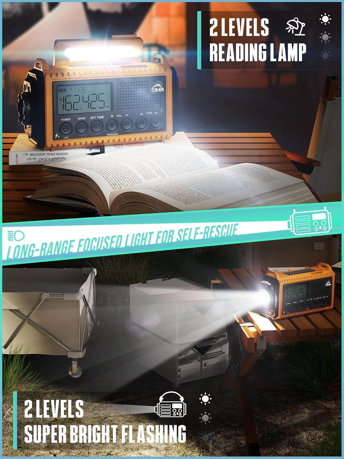 • 【Изключително издръжлив - 3 дни захранване без прекъсване】​​ ​Радио: 50+ часа (50% сила на звука) ​Фенерче: 40-50 часа (150 лумена) ​ Лампа за четене: 60-70 часа (120 лумена) ​SOS аларма: 24 часа непрекъсната работа