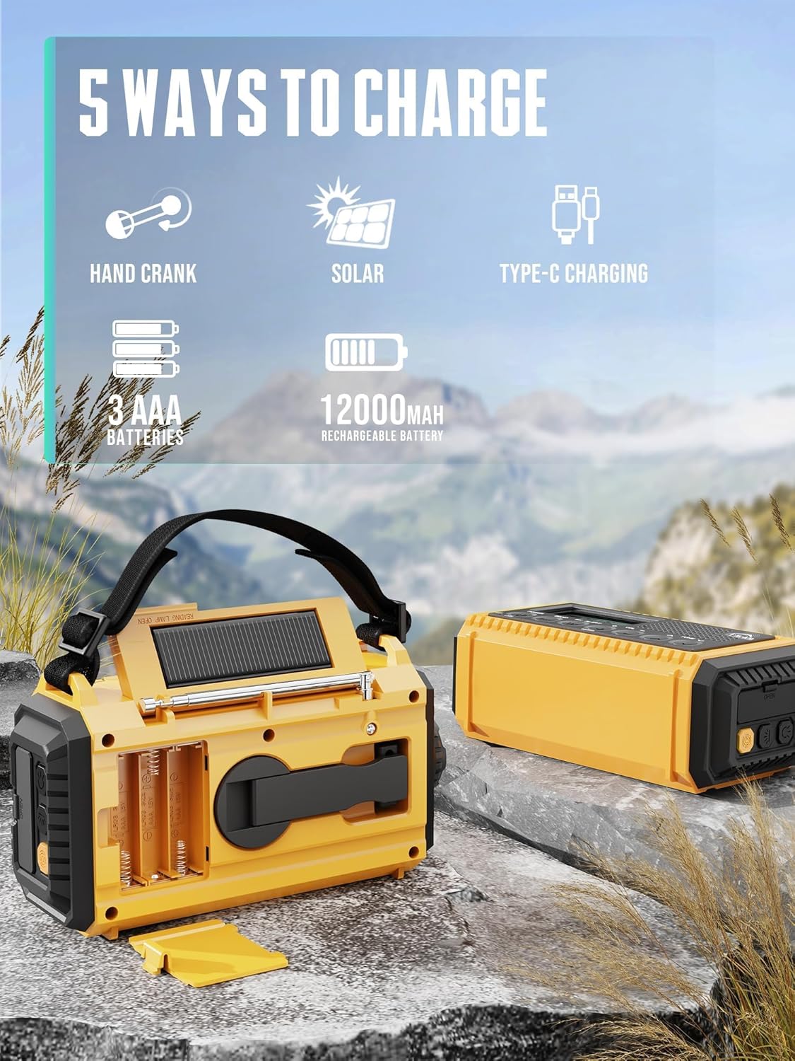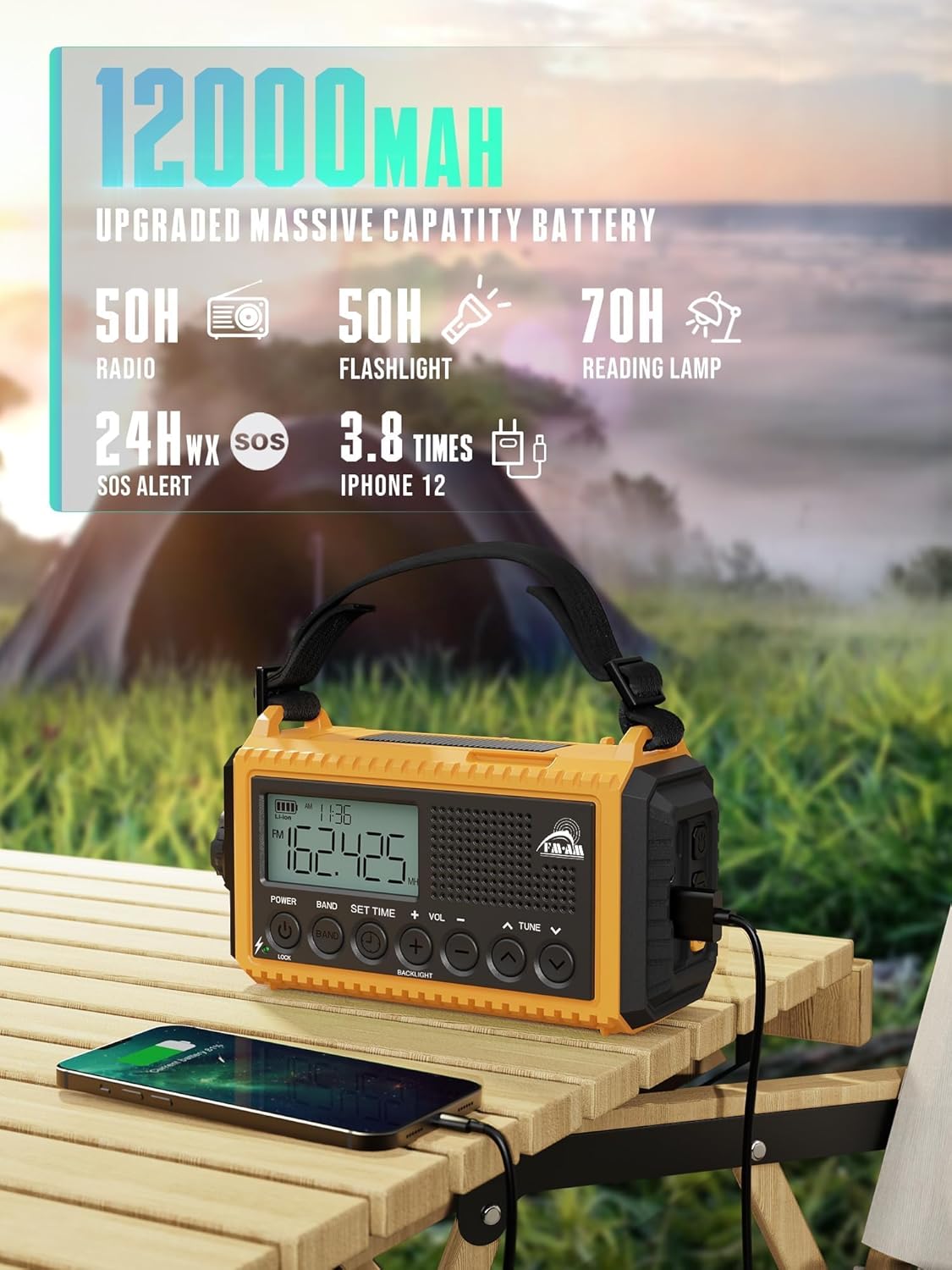 • 【12 000 mAh аварийно радио със слънчева батерия и ръчно зареждане - Универсалното енергийно устройство】​​​​3 пъти зареждане: Бързо зареждане с Type-C​+ Соларно зареждане​ (дори в облаци!) + ​Аварийно захранване с ръчна манивела​ (нямате мрежа? Няма проблем!). ​До 4 пъти по-голям капацитет от конвенционалните радиостанции с манивела