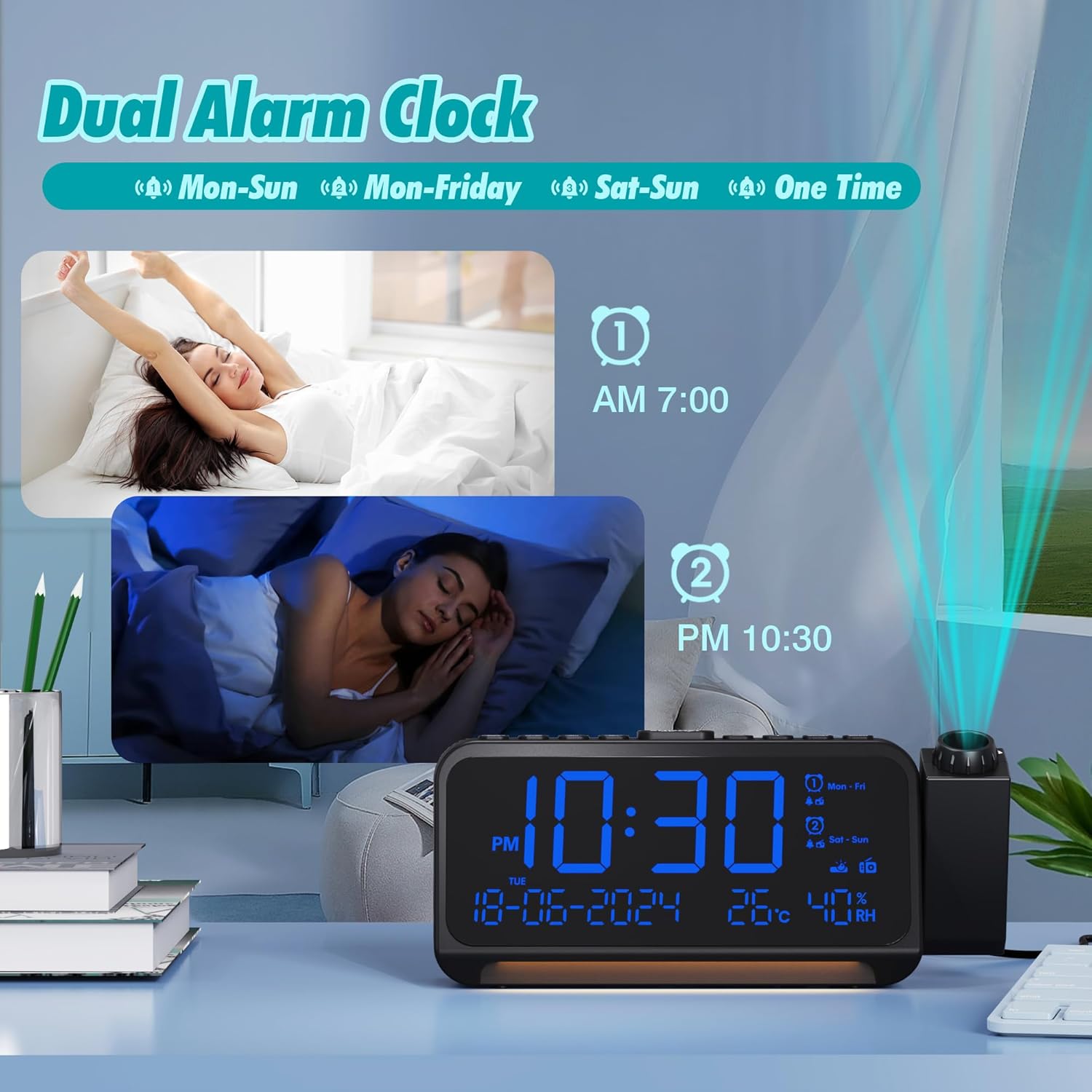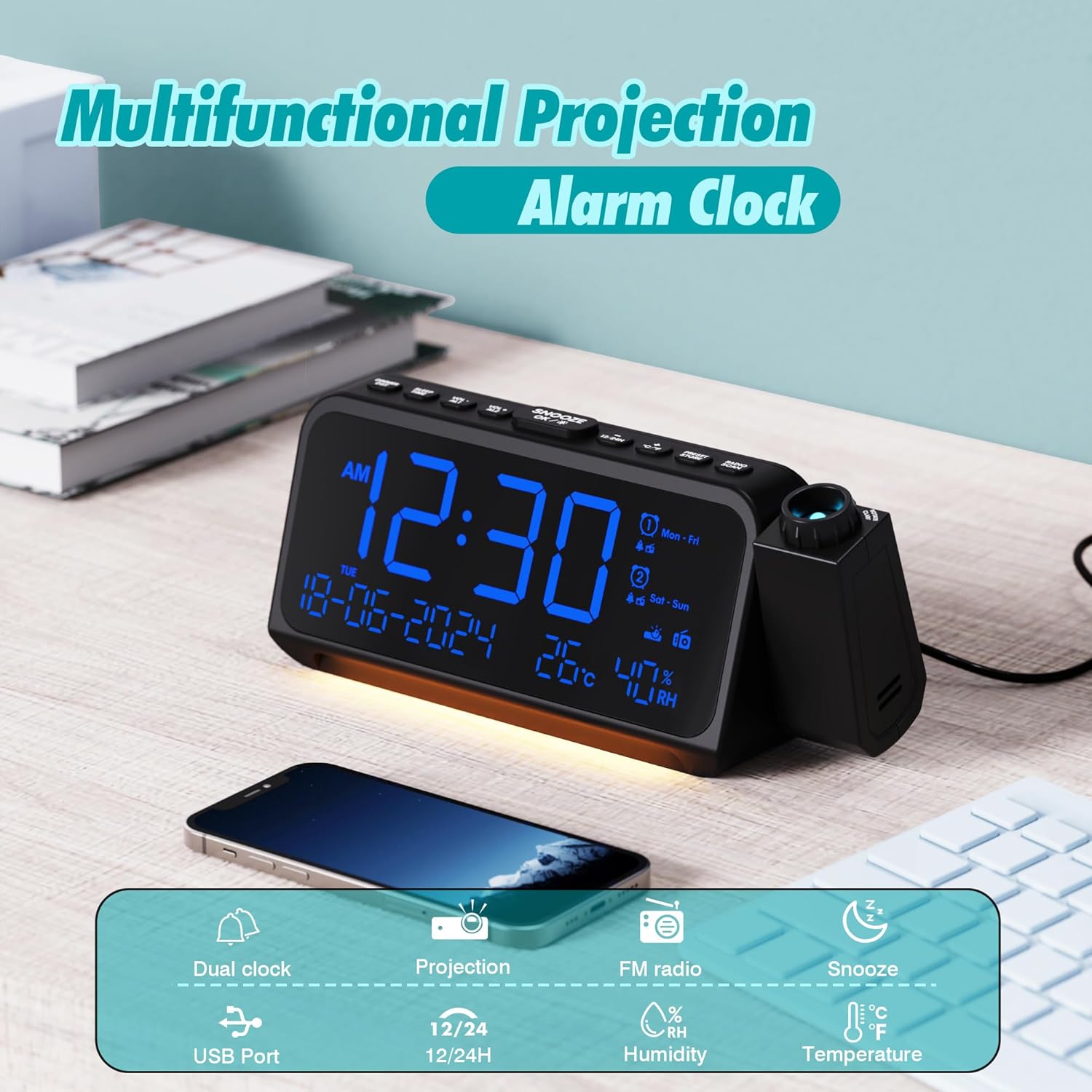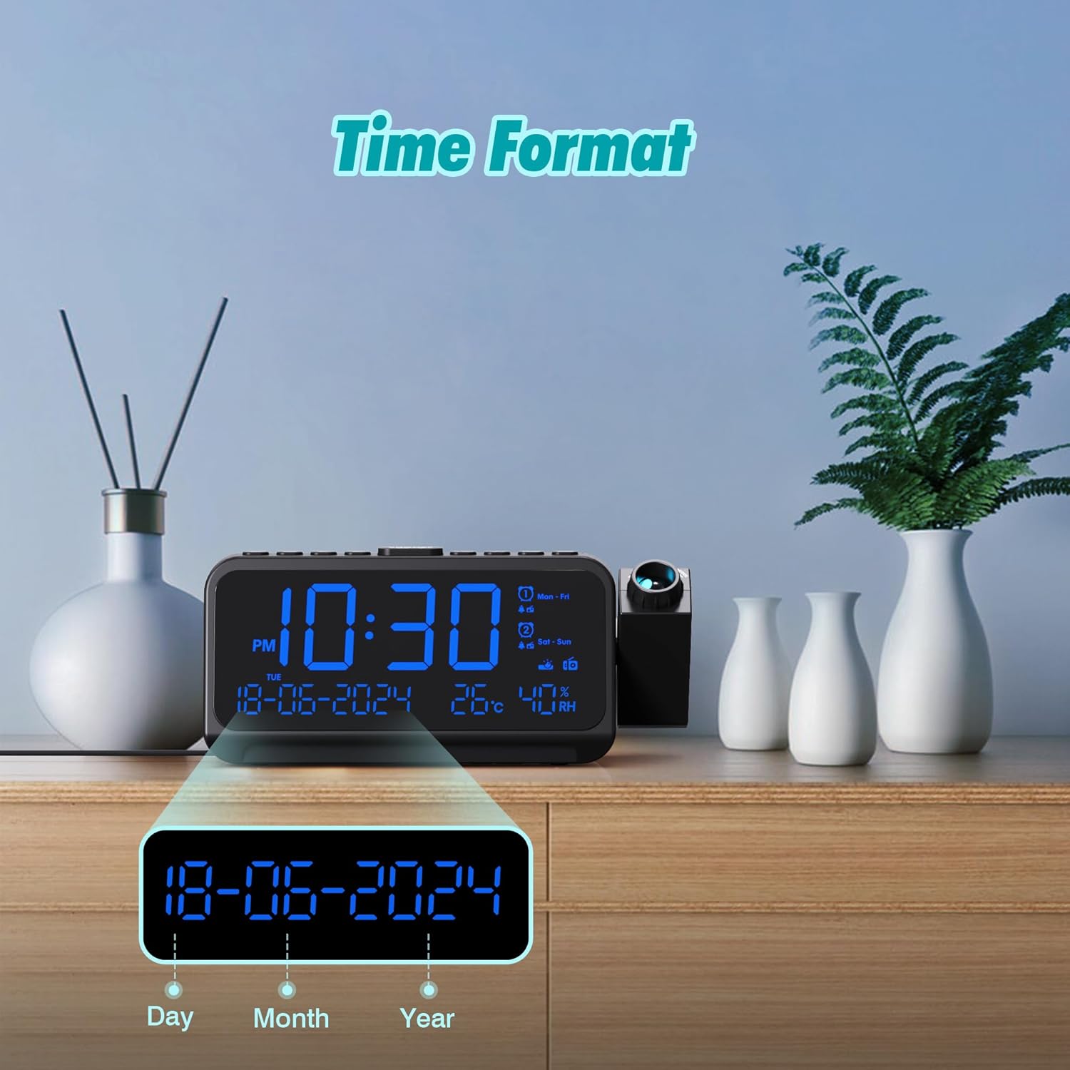 • 【2 порта за зареждане и резервно захранване на батерията】: USB портът за зареждане и портът за зареждане Type-C ви позволяват да зареждате 2 устройства едновременно, инсталирайте 2 AAA батерии (не са включени), за да защитите часа, датата и алармите в случай на прекъсване на захранването. Часовникът на проектора също така разполага с 12/24-часов формат на времето и лятно часово време.
