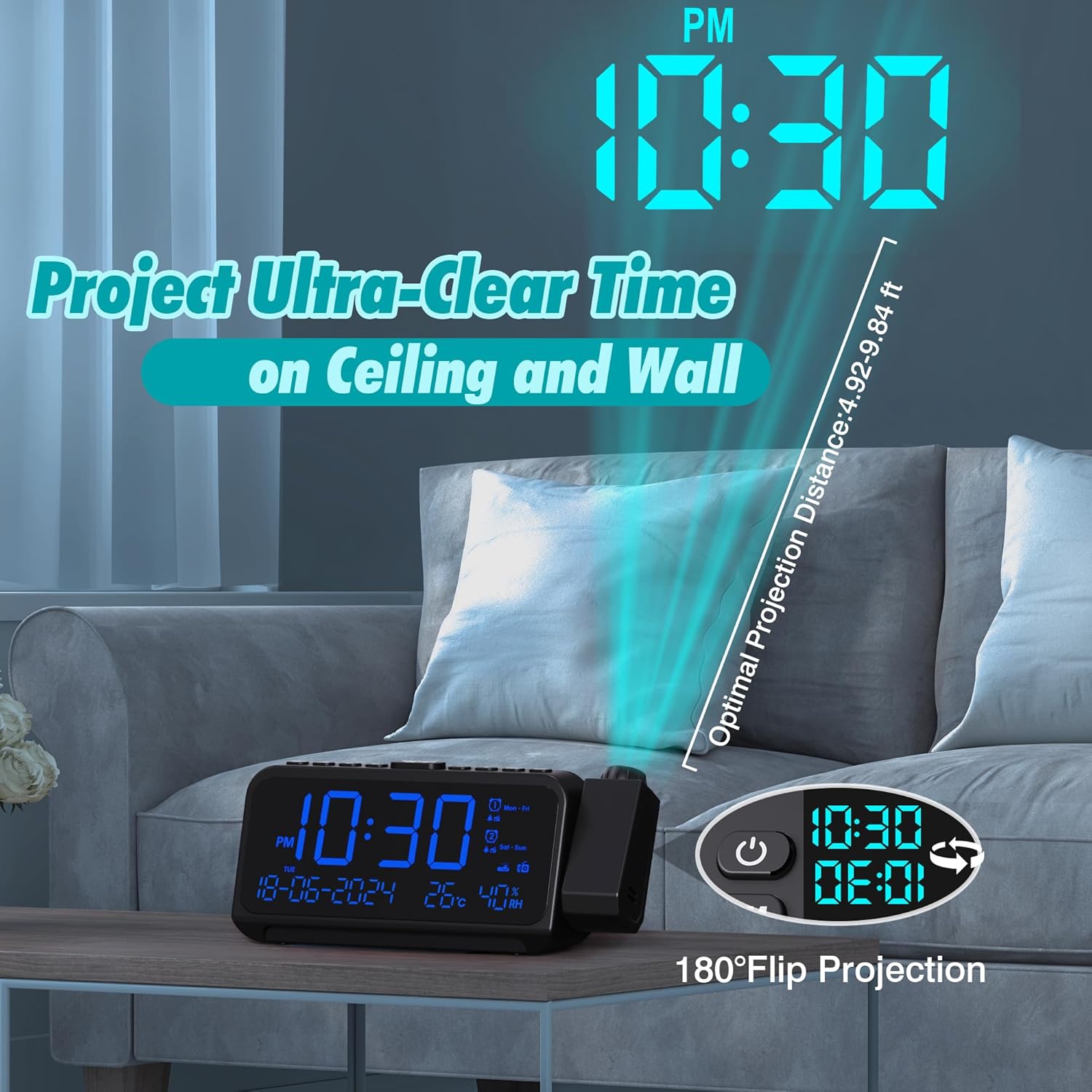 • 【Голям дисплей и показване на температура, влажност и дата】: Този цифров проекционен будилник с мониторинг на влажността и термометър ви позволява да сте в крак с промените в температурата и влажността на помещението. Можете също да изберете дисплея по Целзий или Фаренхайт, ако е необходимо. Големият екран може да показва изцяло часа, календара и датата. Многофункционалният дизайн се вписва идеално в семейния живот.