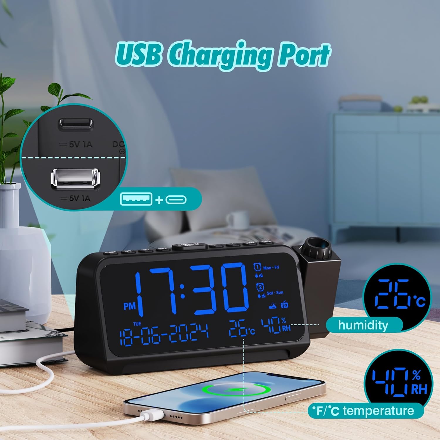 Радиобудилник с проекция за спалня, порт тип C и USB, двоен будилник за делнични/уикенд дни, проекционен будилник с DST димер и дисплей за температура и дата, цифров будилник за нощно шкафче