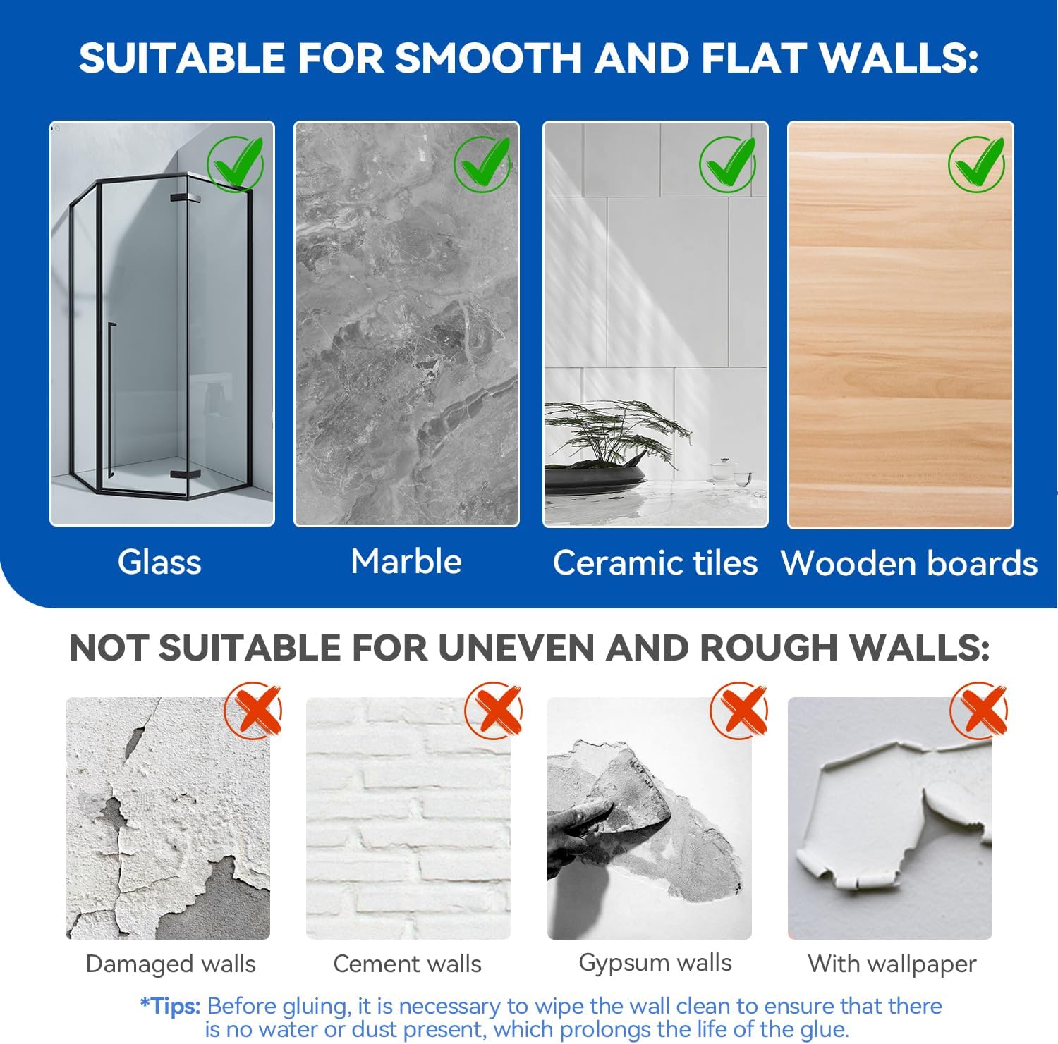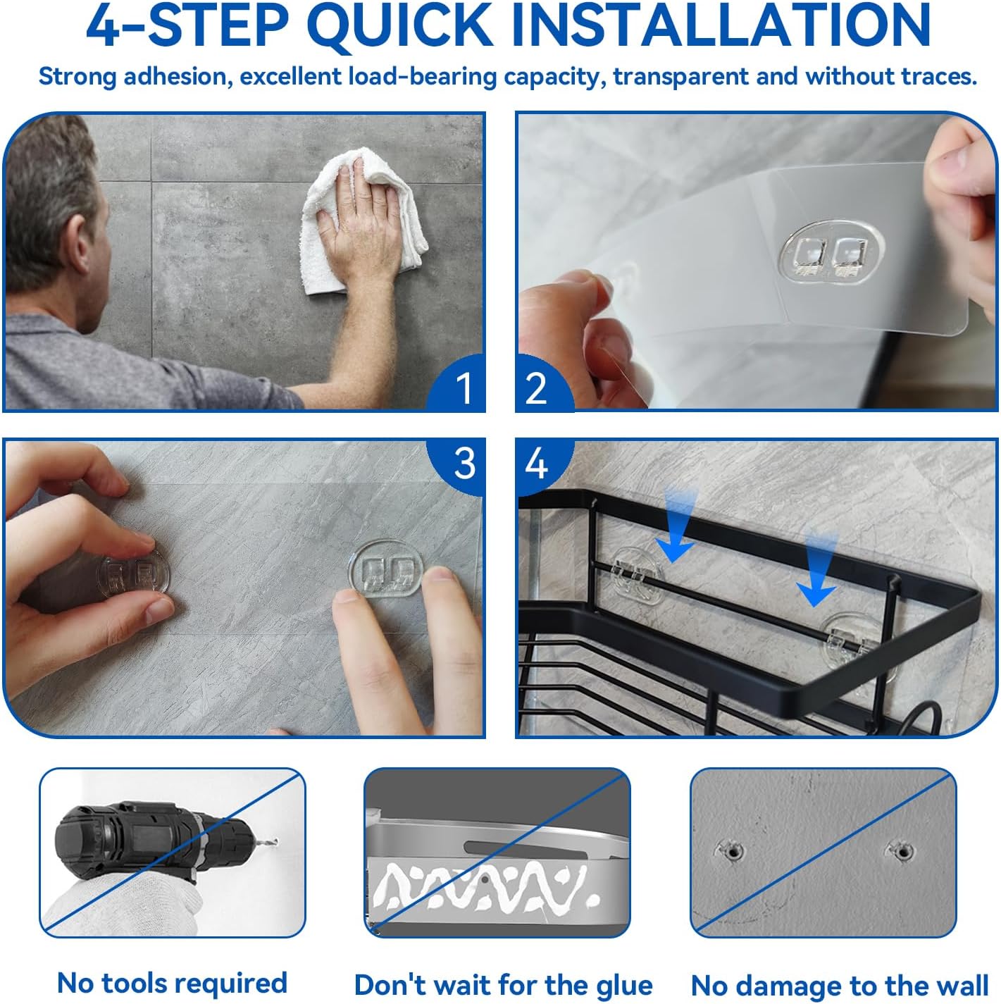 • 【БЕЗПЛАТЕН САМОЗАЛЕПВАЩ МОНТАЖ】Лесен монтаж със самозалепваща се подложка, спестяващ време и усилия по време на монтажа. Не е необходимо пробиване или сложни инструменти за монтаж. Подходящ за гладки стени (стъкло, керамични плочки, неръждаема стомана, дървени панели и пластмасови панели), не е подходящ за груби стени.