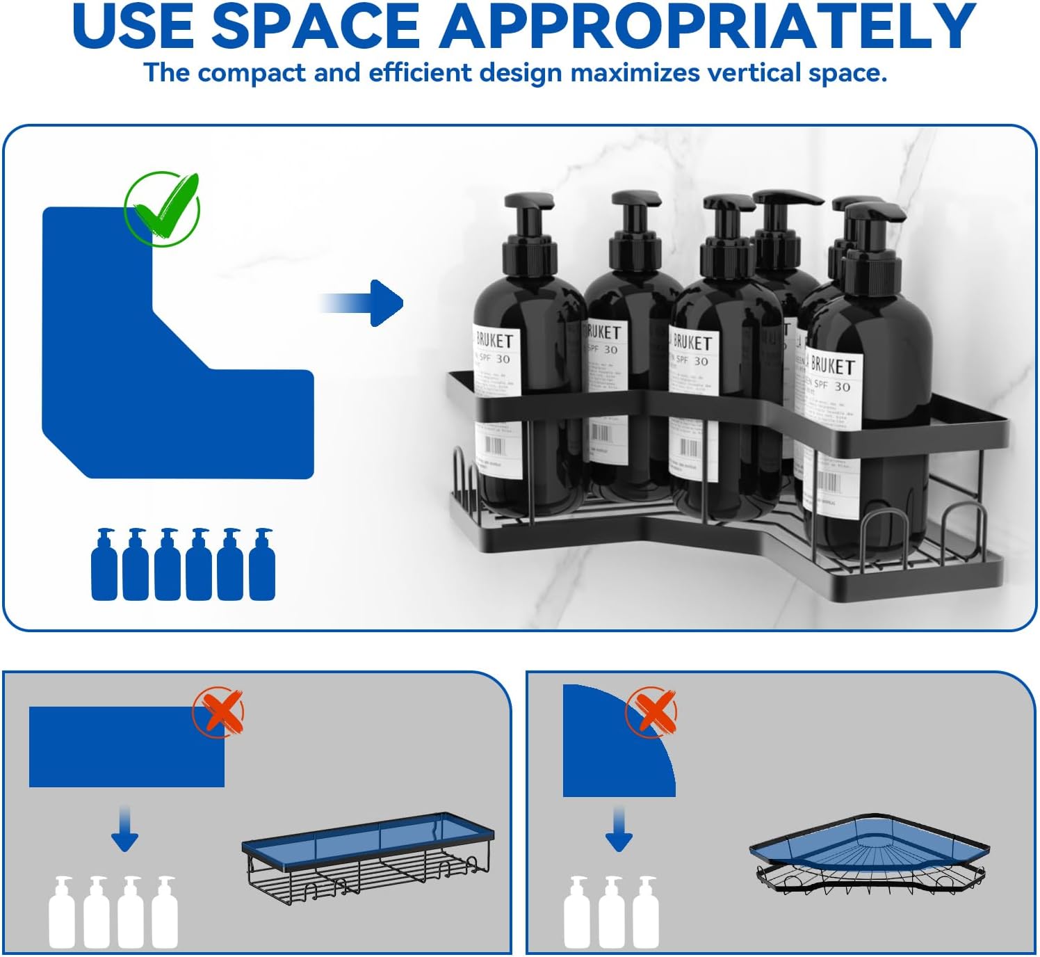 Рафт за душ, без пробиване, 4 части, черен (SM+1), рафт за душ, въглеродна стомана, с лепило, държач за шампоан за душ, кошница за душ, устойчива на ръжда, аксесоари за държачи за душ, баня