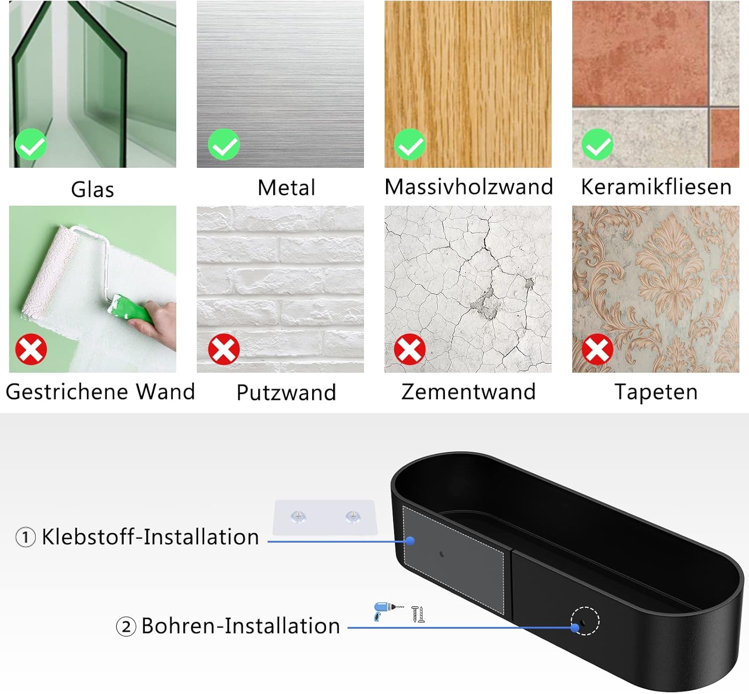 • Не е необходимо пробиване: Силно лепило, произведено по немска технология, по-здраво от конвенционалните самозалепващи лепила и вендузи, товароносимост до 10 кг, не е необходимо пробиване, предпазва стената от повреди. (За неравни стени предлагаме и аксесоари за пробиване)