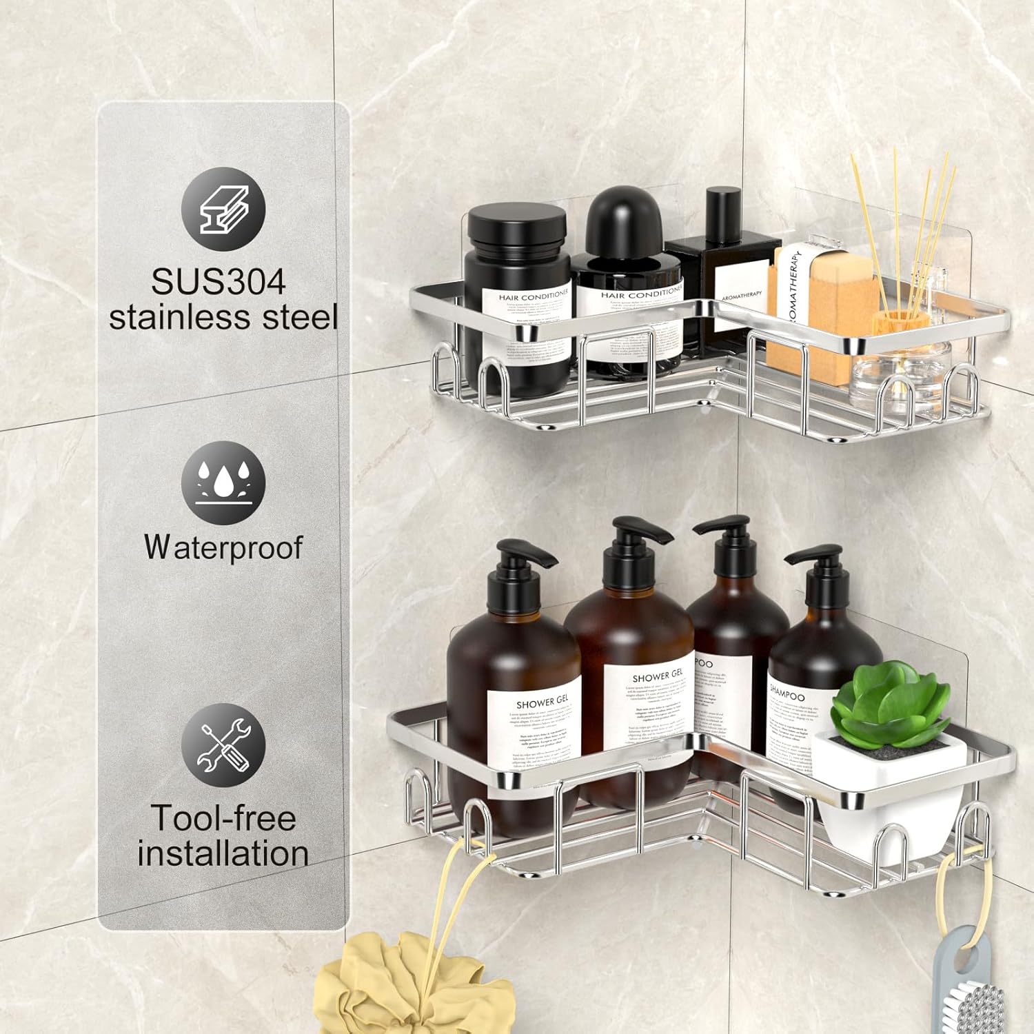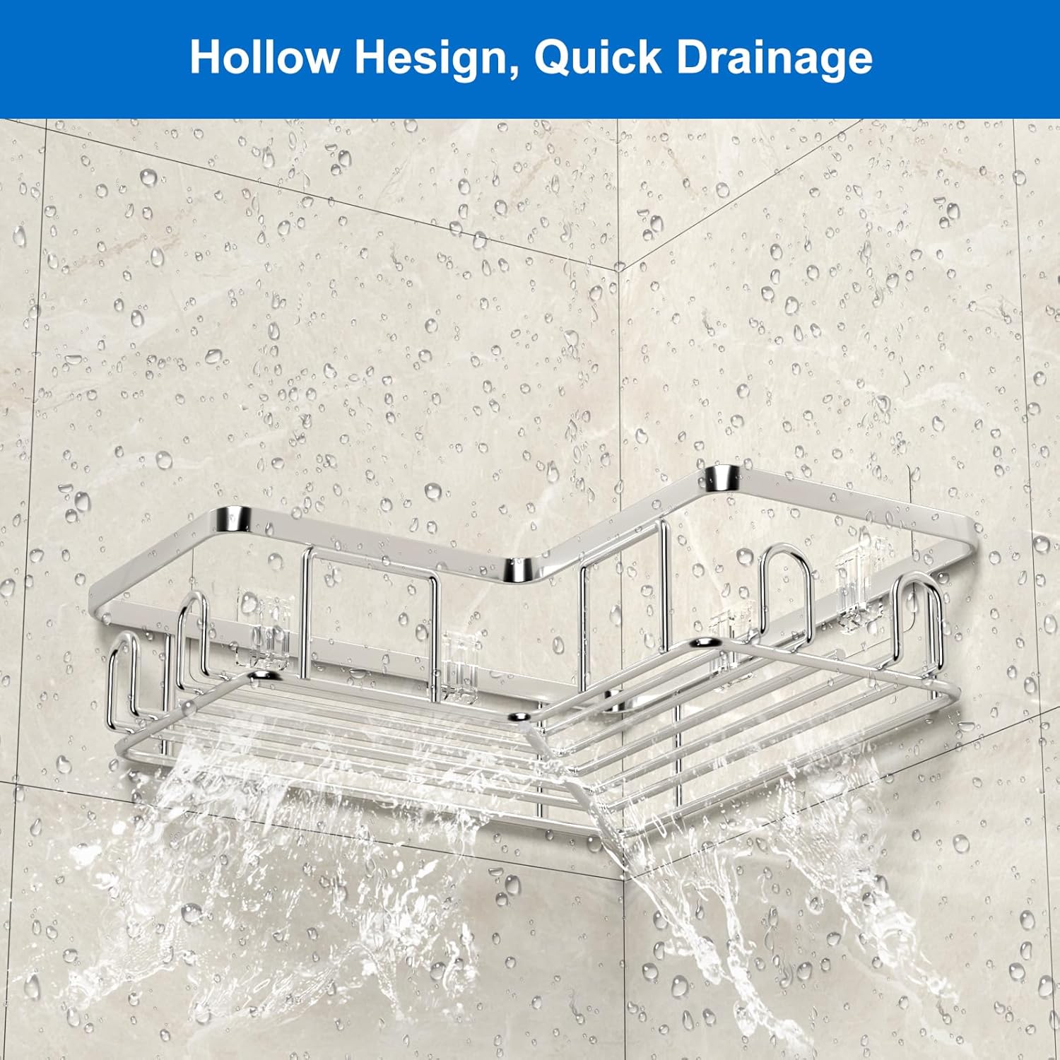 • Устойчив на ръжда и водоустойчивост: душ рафтът е изработен от висококачествена стомана без пробиване, повърхността е обработена с пясъкоструене за по-добро предотвратяване на ръжда и надраскване. Дъното на коша е с куха конструкция, което улеснява оттичането.