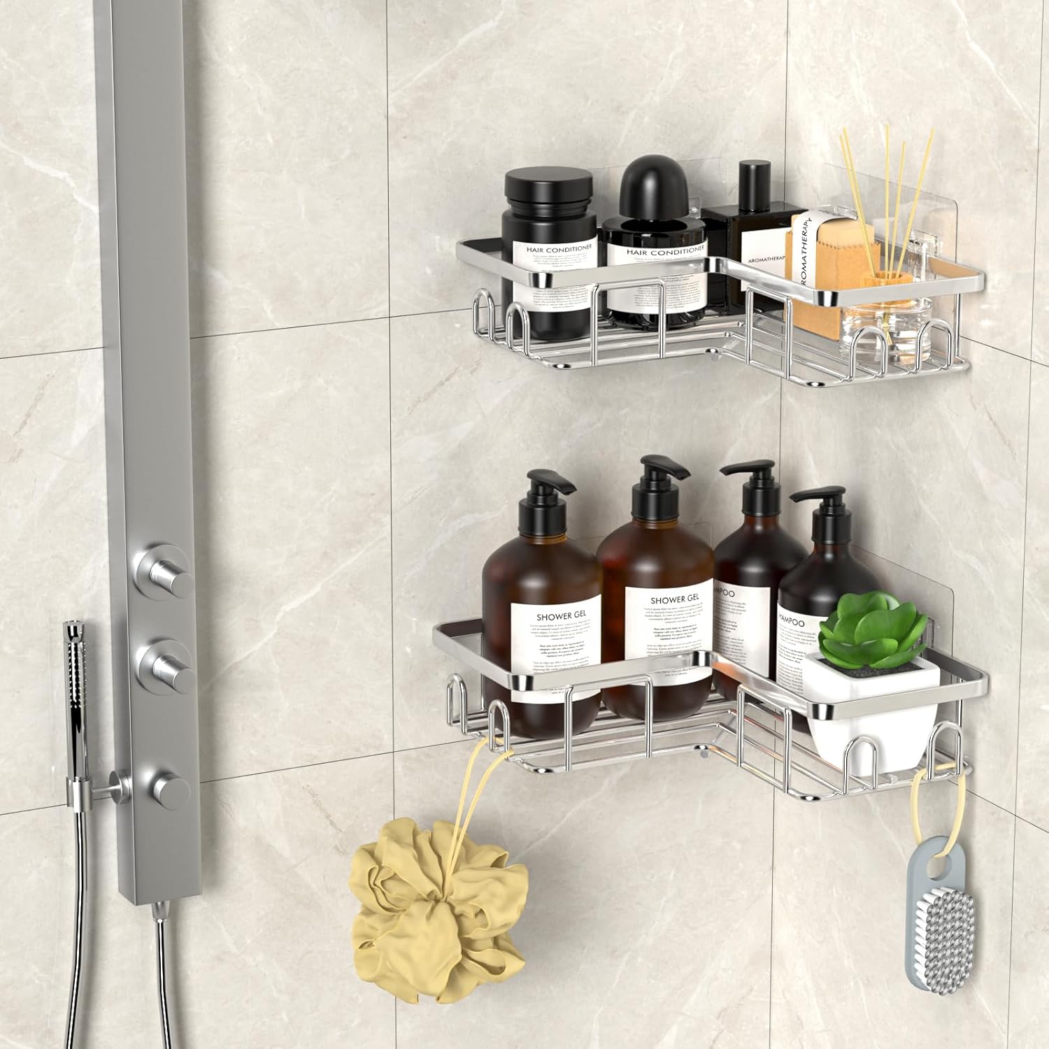 Рафт за душ без пробиване, ъглов рафт за душ, изработен от неръждаема стомана SUS304, органайзер за рафтове за баня, държач за шампоан и душ гел за душ (пакет от 2 ъглови рафта за душ - сребрист)