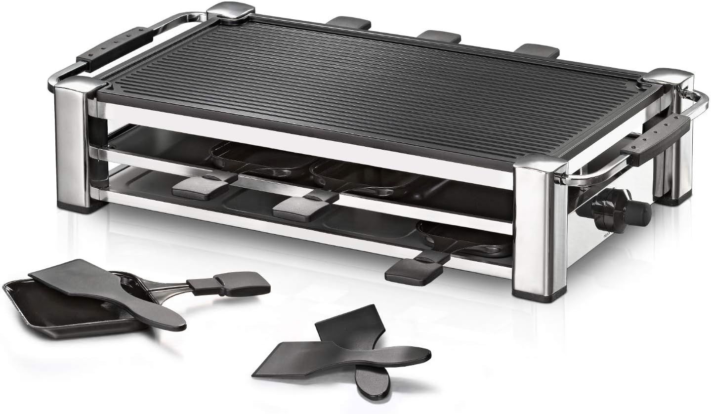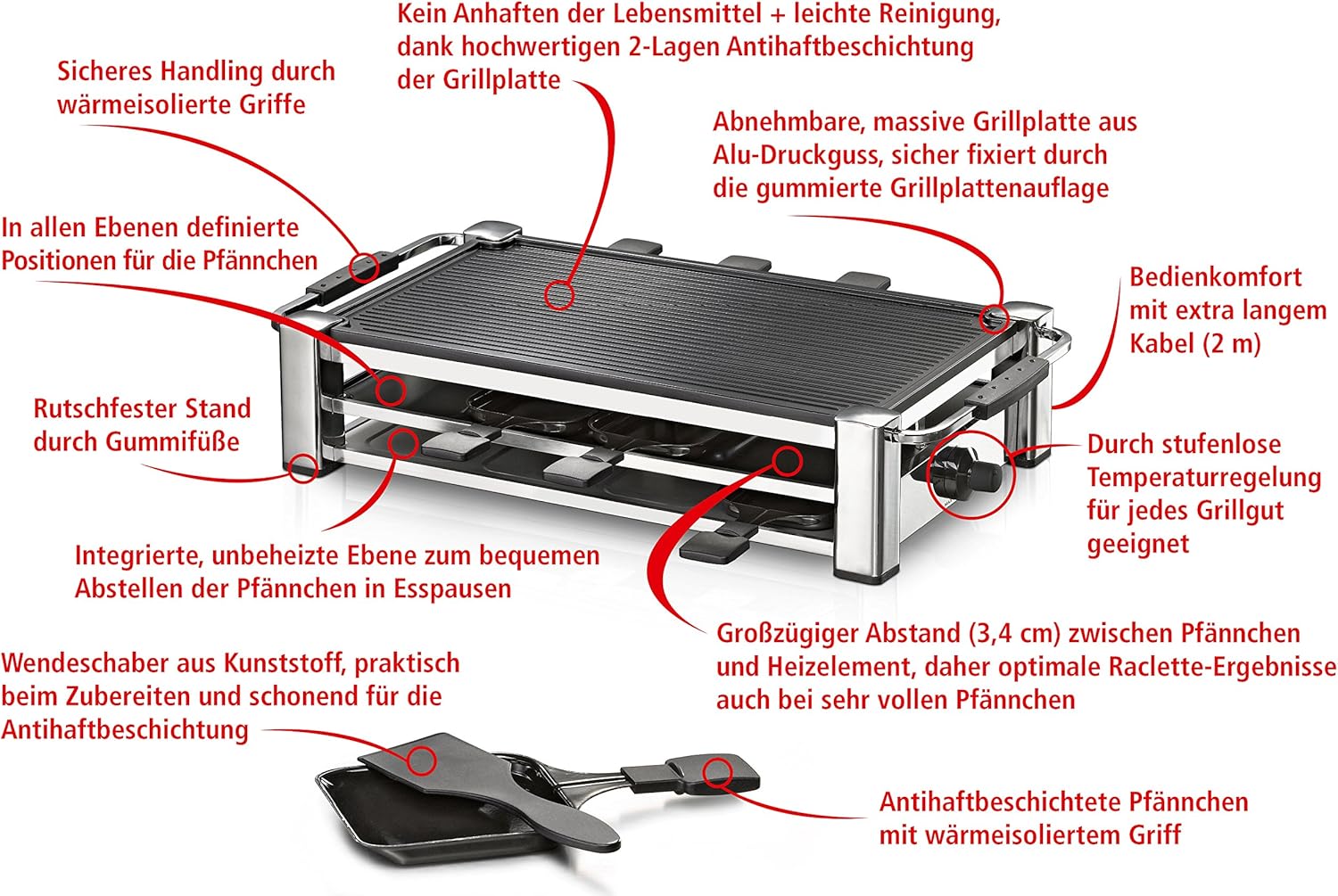 • Елегантен, хромиран корпус в елегантен швейцарски дизайн, масивна, подвижна плоча за грил от лят алуминий, 41,5 x 22,5 см, оребрена повърхност за типичен модел на грила
